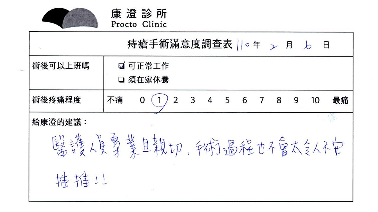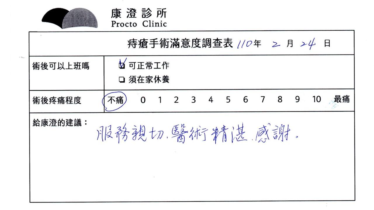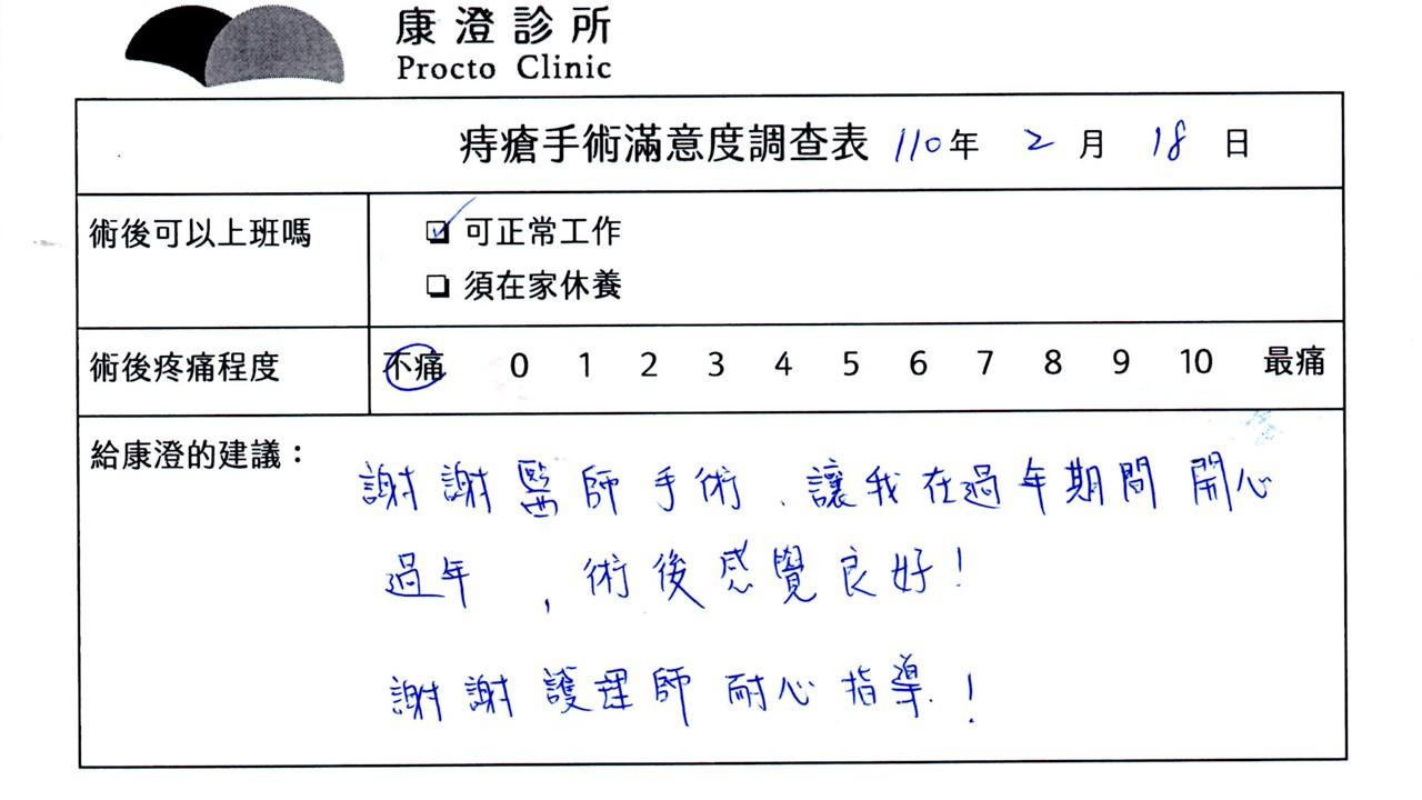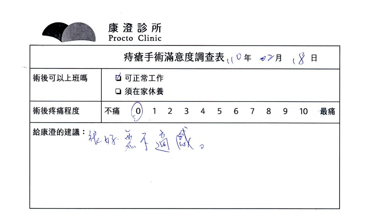 「困擾了20多年的三期內痔,終於在幾天內就解決了,原以為會很疼痛的手術及復原過程,結果真是神奇啊!不會痛呢!長效針應該是有用的,前幾天主要是腫脹,感謝林醫師,以及術後時時電話關心的小護士們,很棒!」