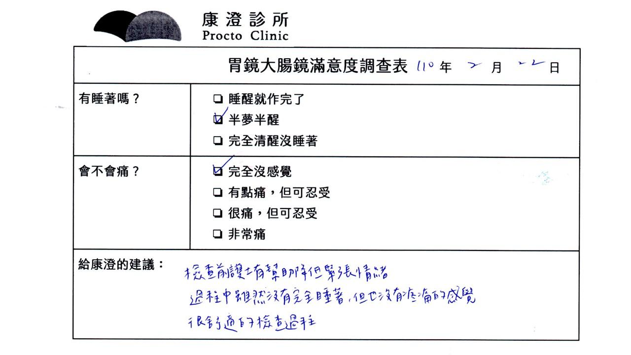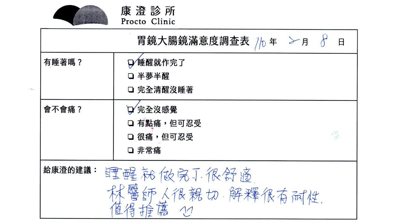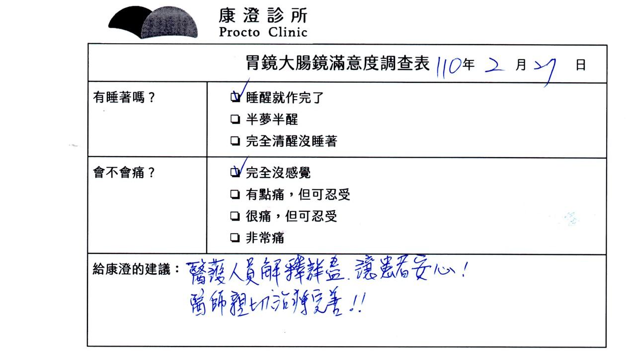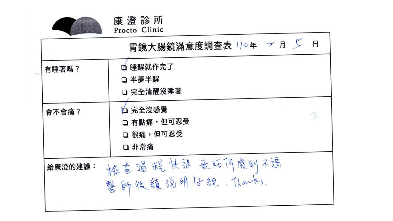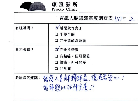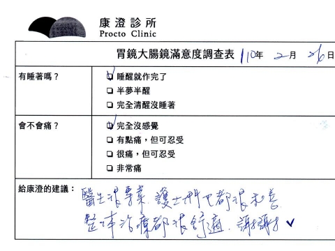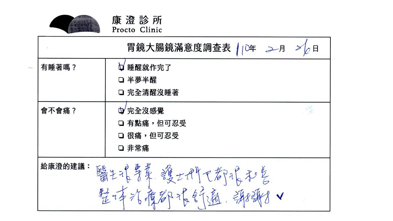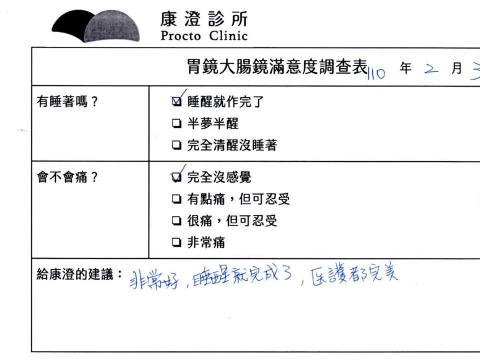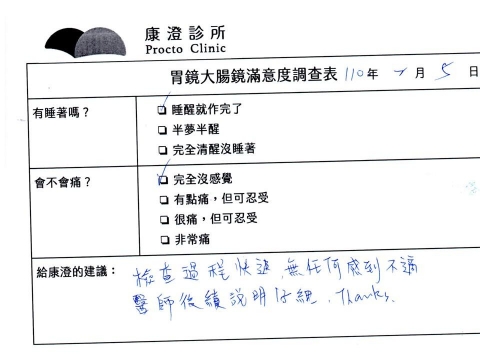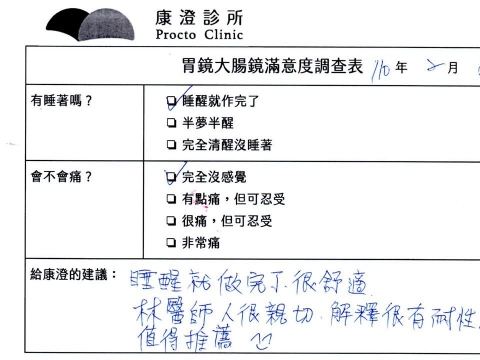 「定期穩定在櫃診所健檢,腸胃鏡的檢查醫療團隊及護理人員後續衛教的處理不輸醫院等級ㆍ專業丶舒適丶安心,整個療程無痛,護理人員親切可降低檢查的緊張感,非常感謝!」
