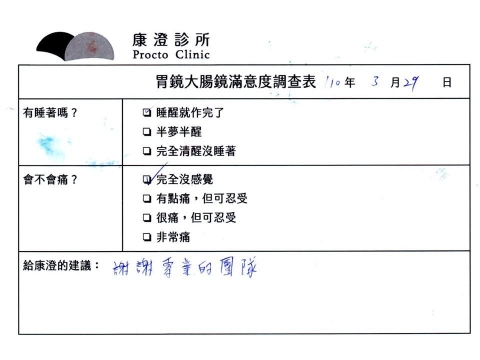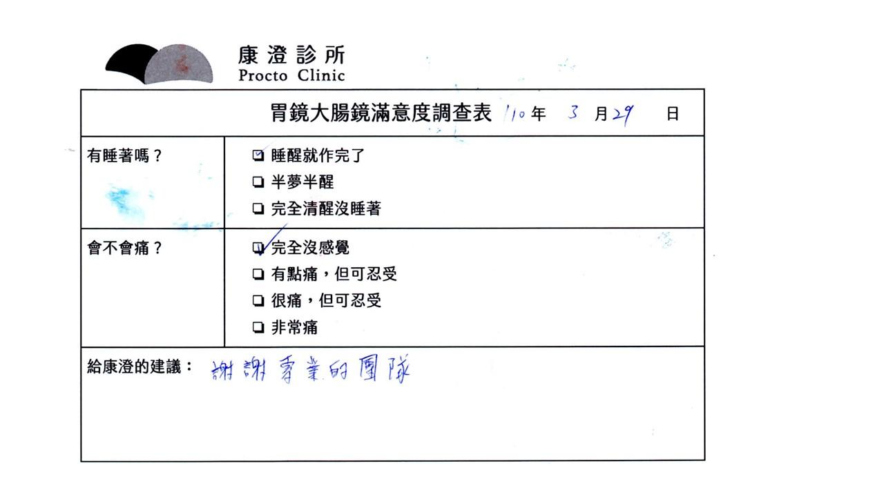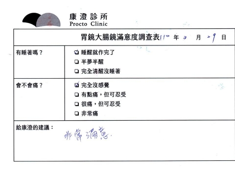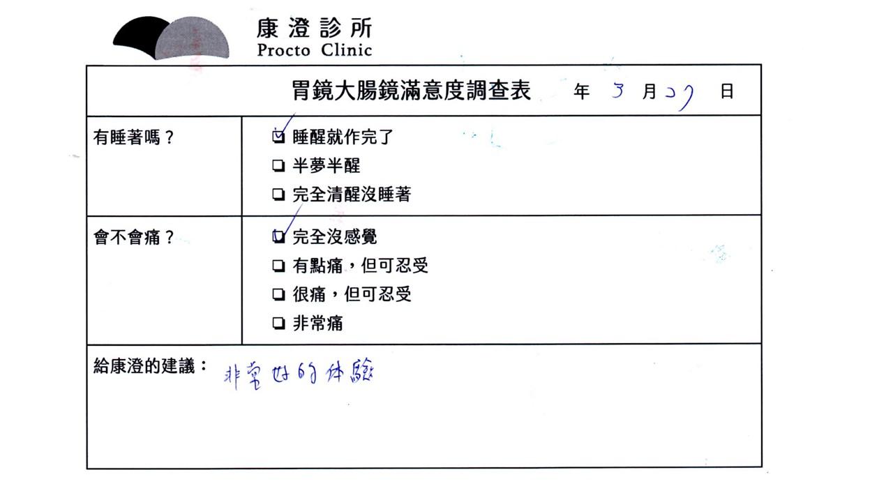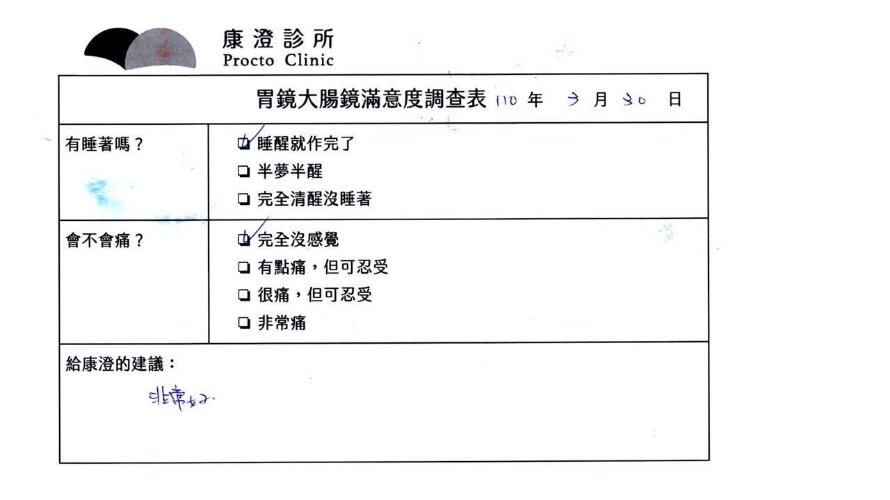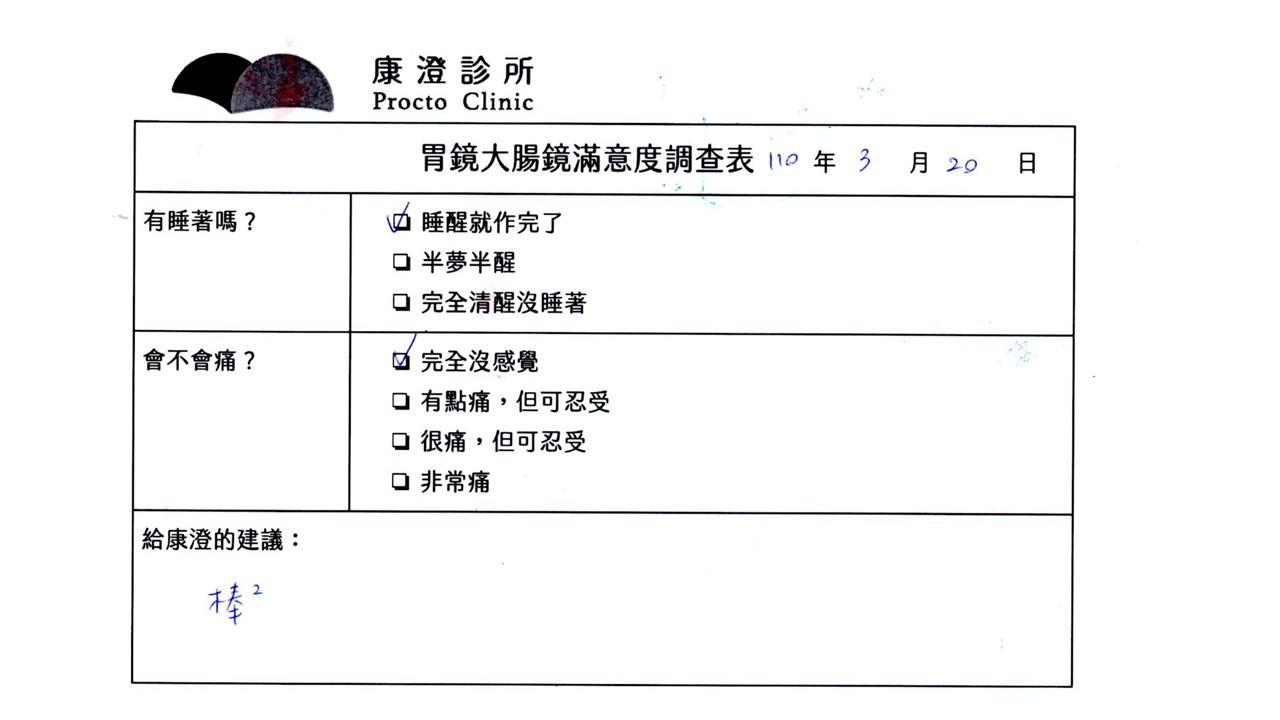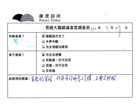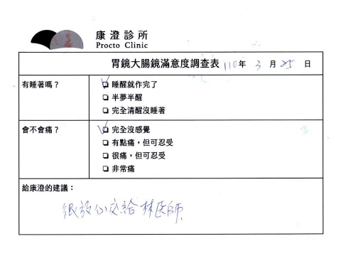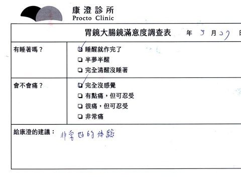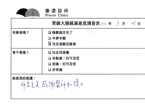 「定期穩定在櫃診所健檢,腸胃鏡的檢查醫療團隊及護理人員後續衛教的處理不輸醫院等級ㆍ專業丶舒適丶安心,整個療程無痛,護理人員親切可降低檢查的緊張感,非常感謝!」