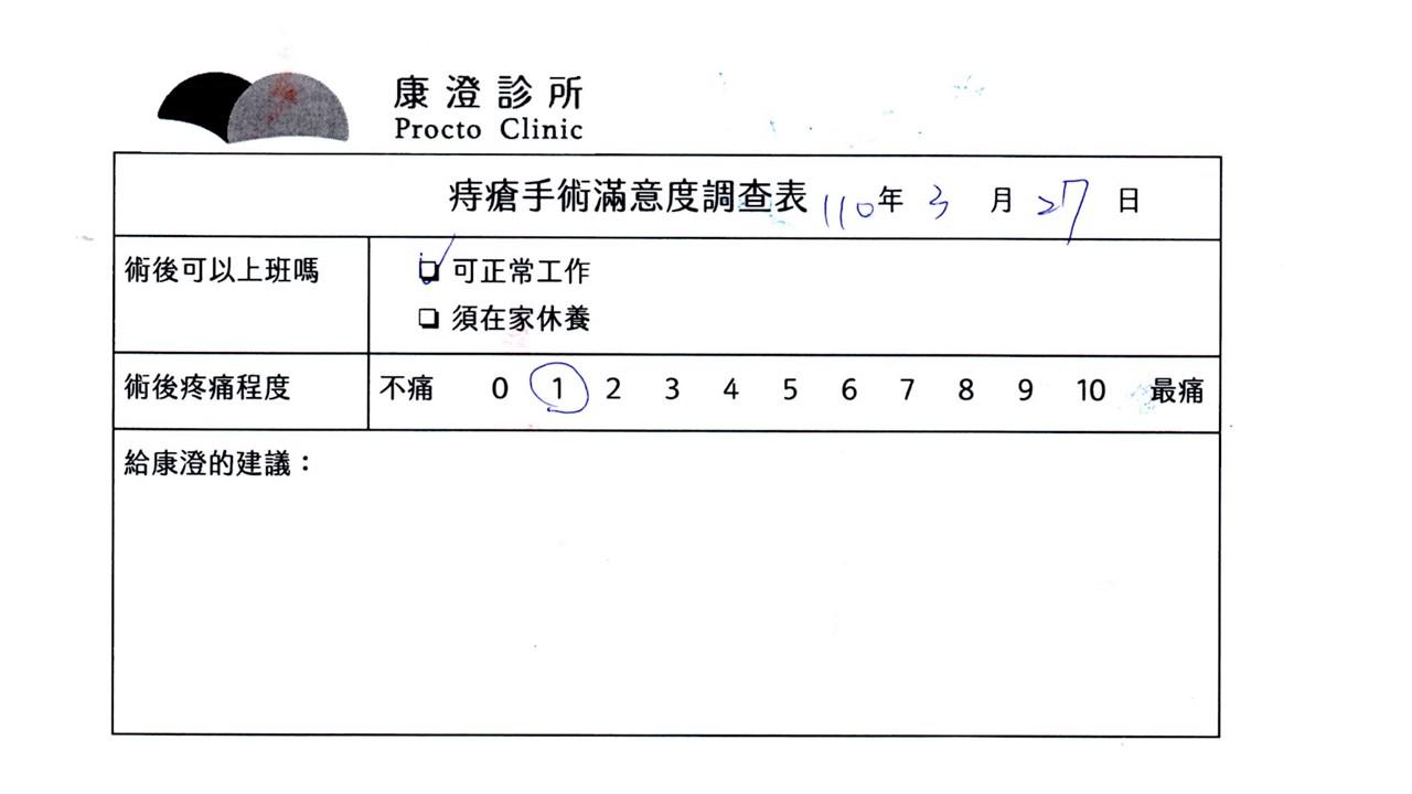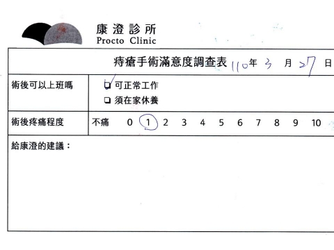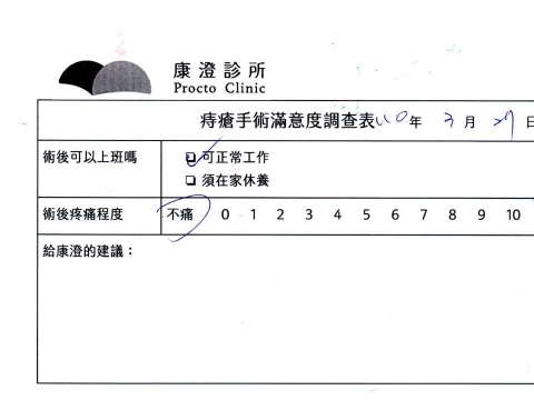 「困擾了20多年的三期內痔,終於在幾天內就解決了,原以為會很疼痛的手術及復原過程,結果真是神奇啊!不會痛呢!長效針應該是有用的,前幾天主要是腫脹,感謝林醫師,以及術後時時電話關心的小護士們,很棒!」