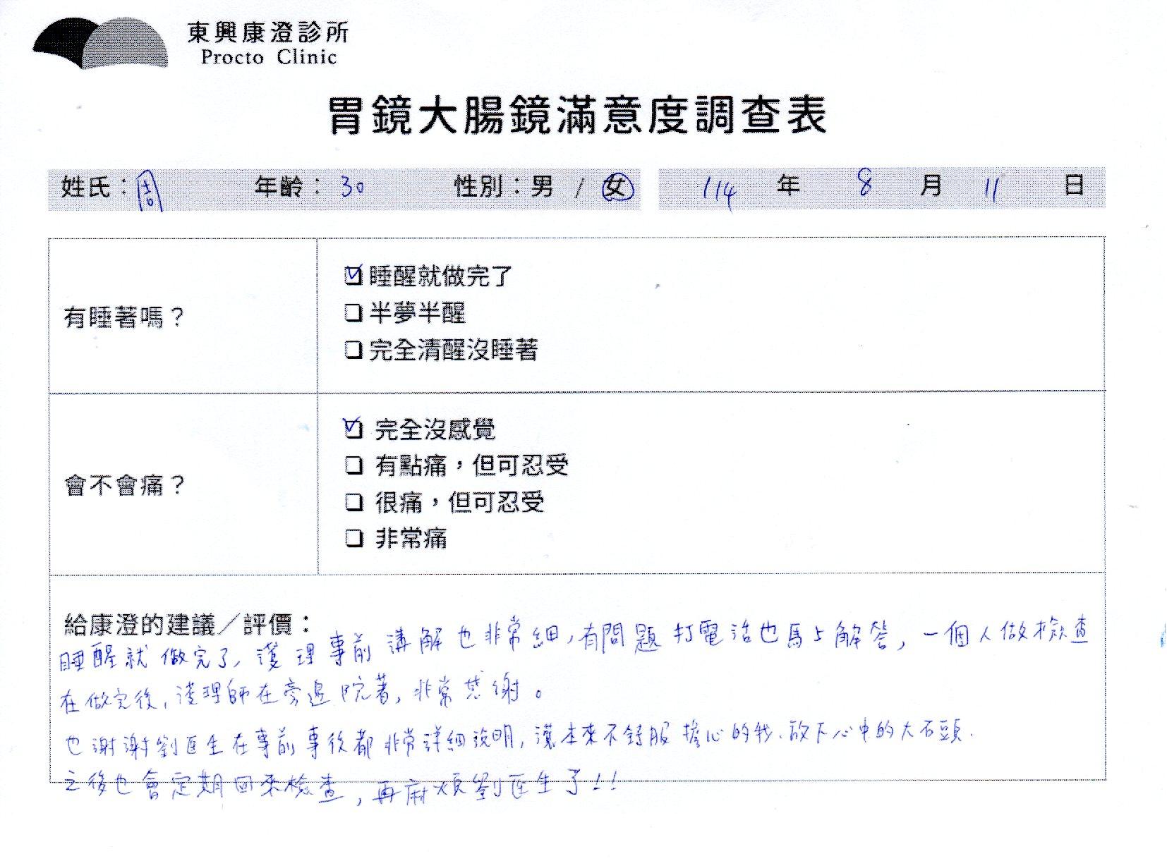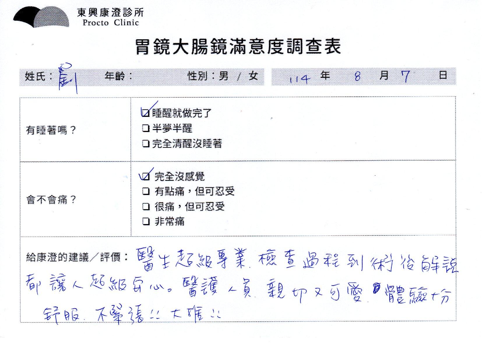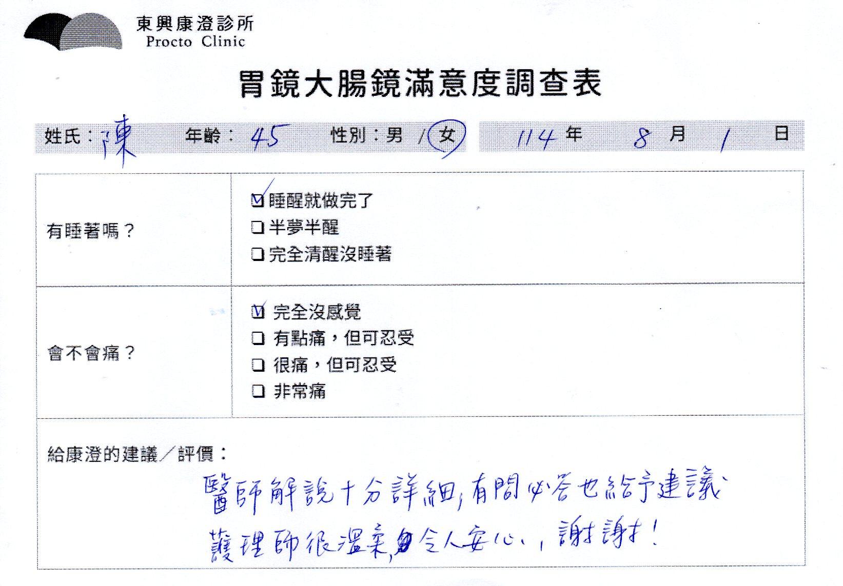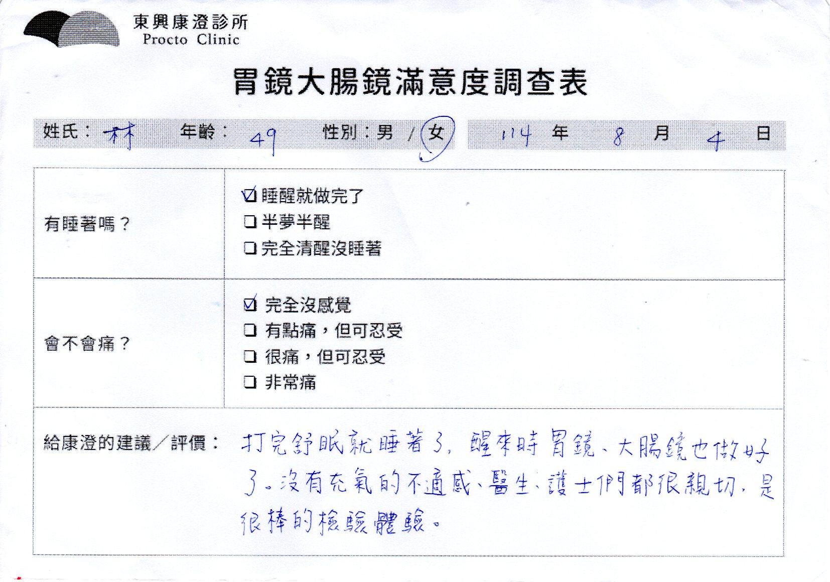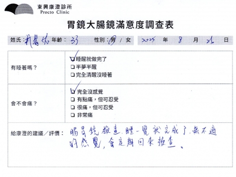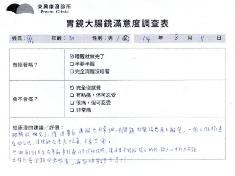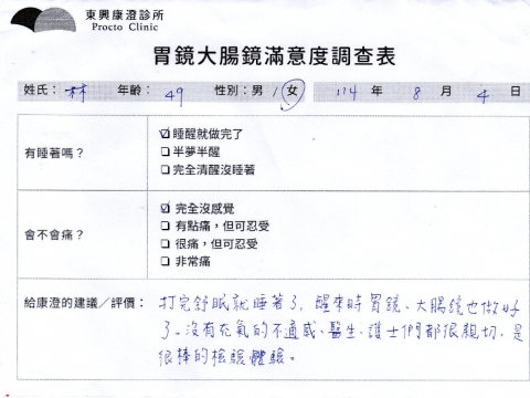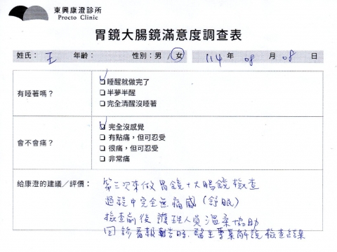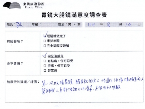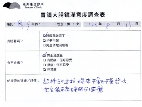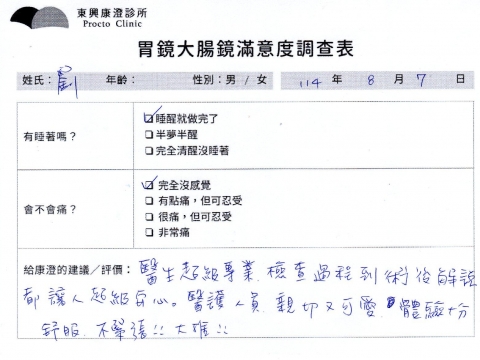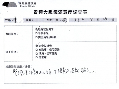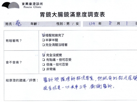 「定期穩定在櫃診所健檢,腸胃鏡的檢查醫療團隊及護理人員後續衛教的處理不輸醫院等級ㆍ專業丶舒適丶 安心,整個療程無痛,護理人員親切可降低檢查的緊張感,非常感謝!」