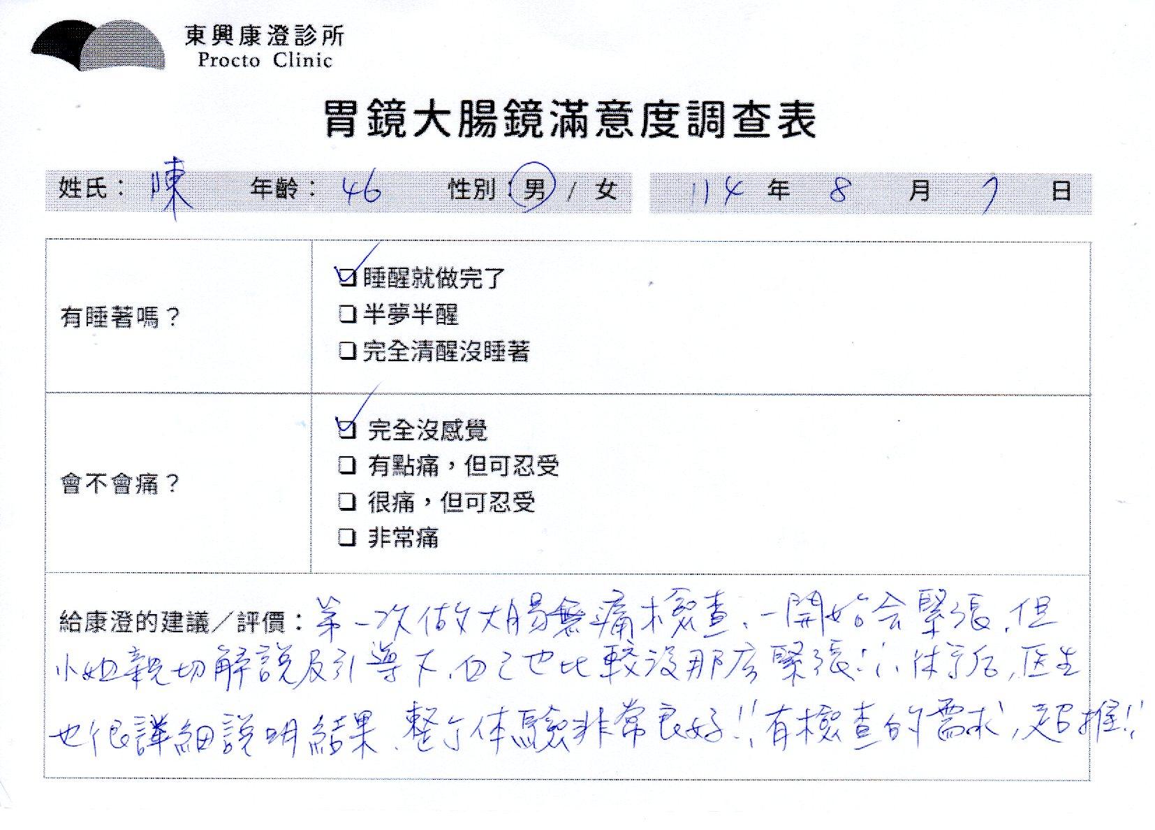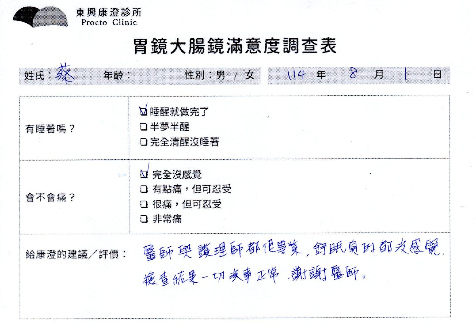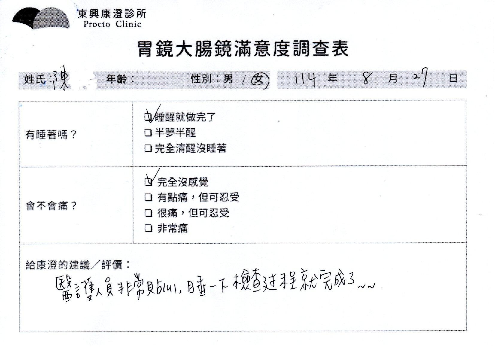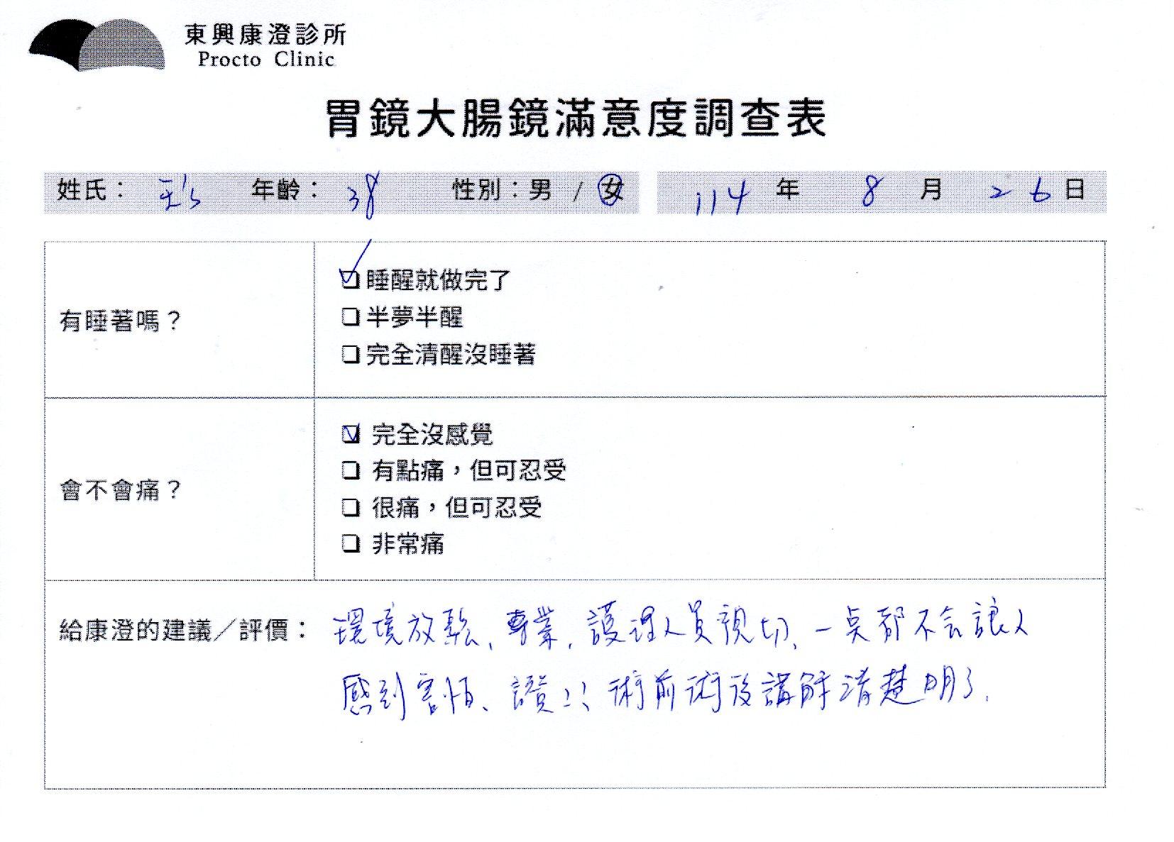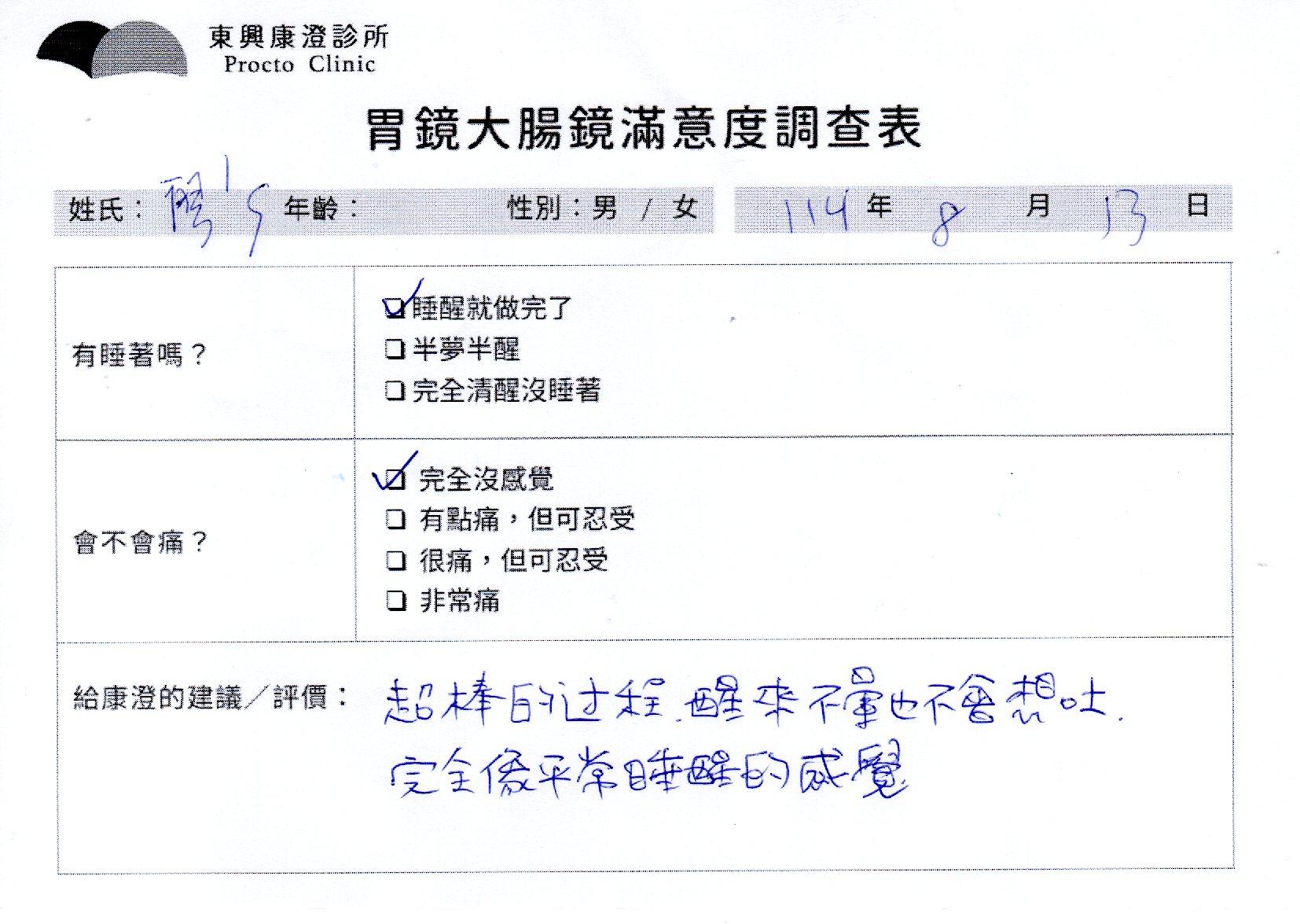 「定期穩定在櫃診所健檢,腸胃鏡的檢查醫療團隊及護理人員後續衛教的處理不輸醫院等級ㆍ專業丶舒適丶 安心,整個療程無痛,護理人員親切可降低檢查的緊張感,非常感謝!」