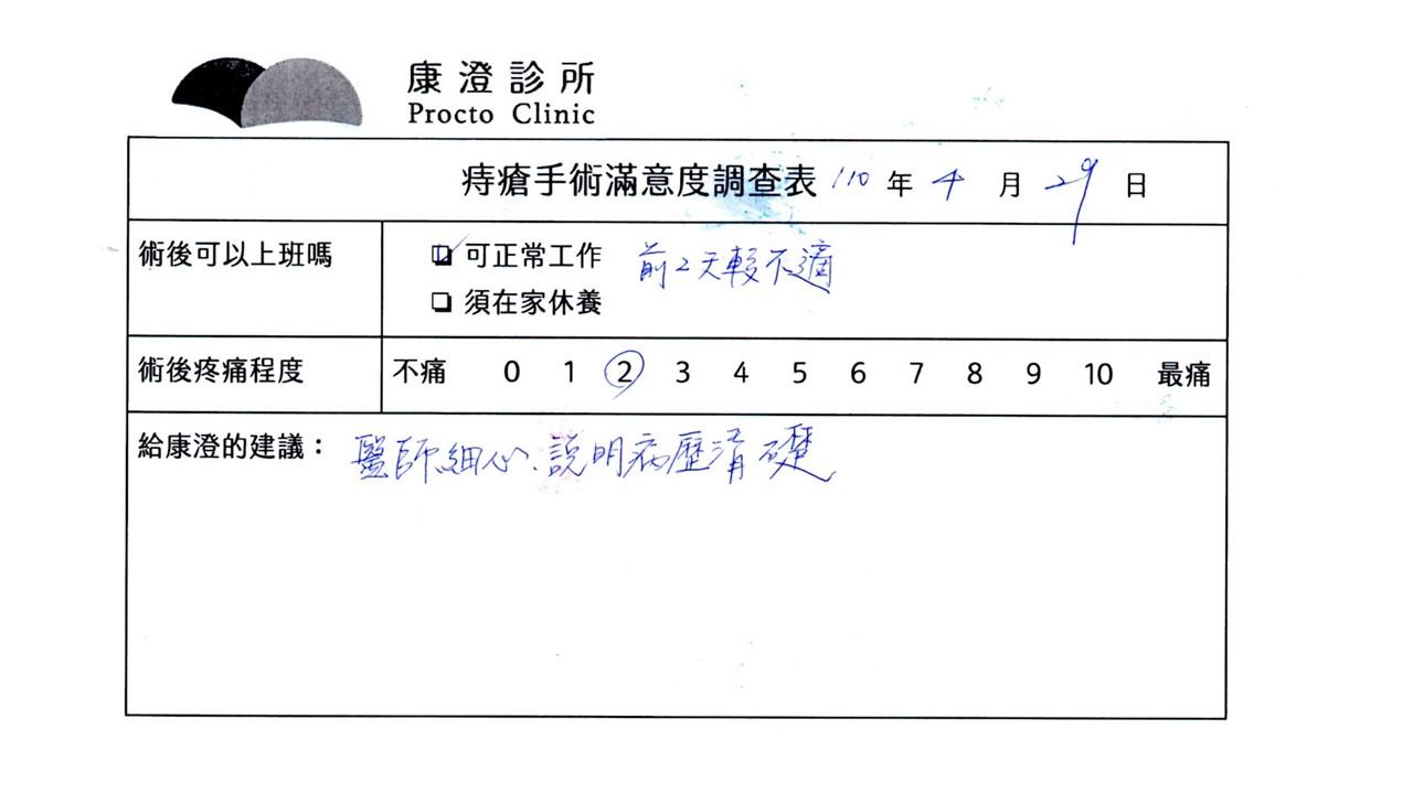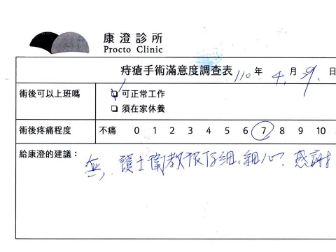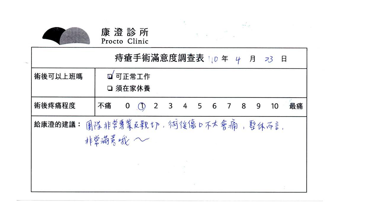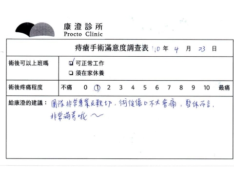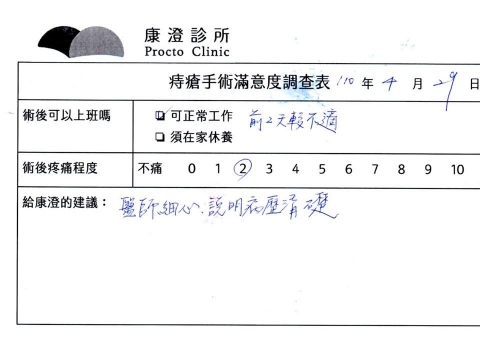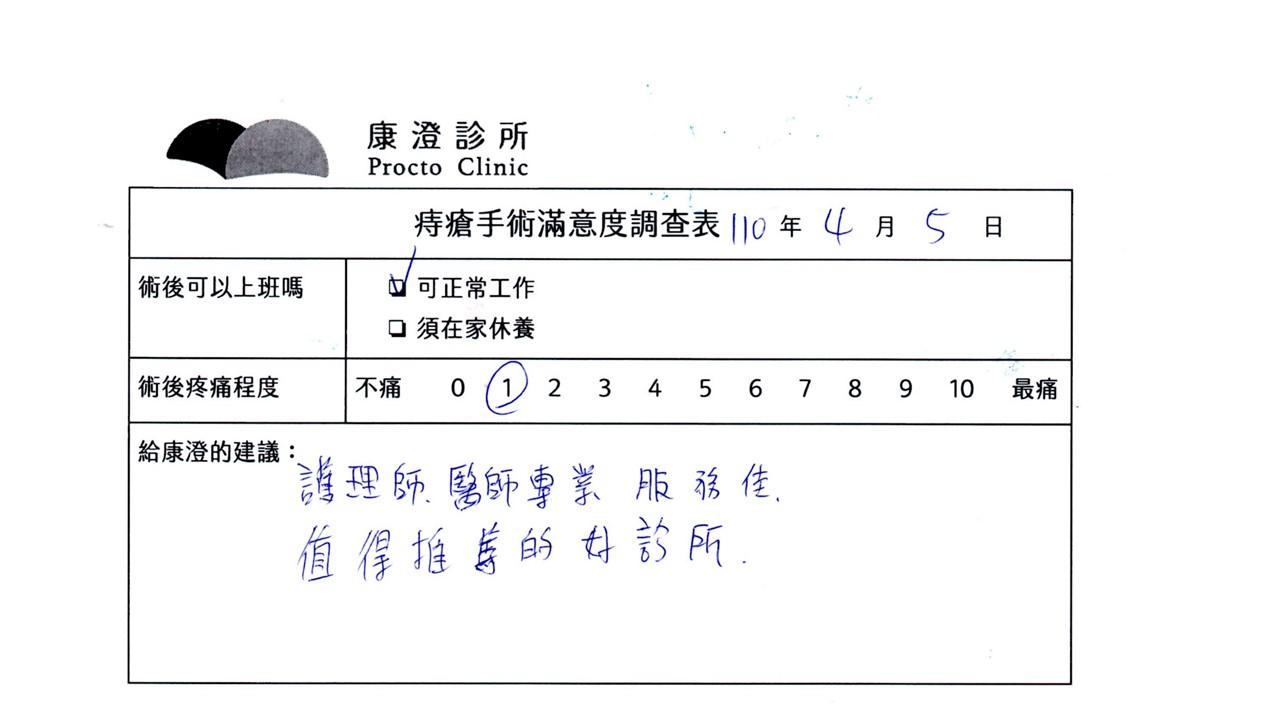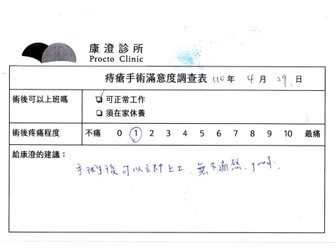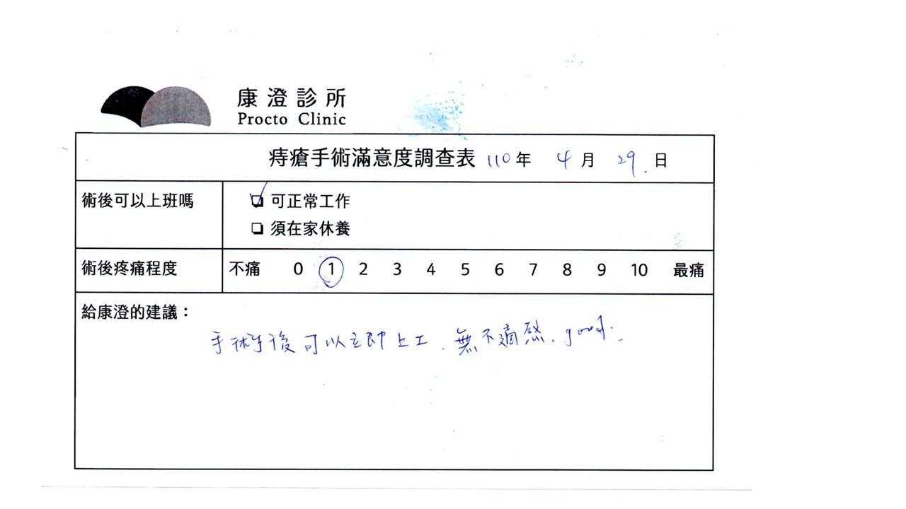 「困擾了20多年的三期內痔,終於在幾天內就解決了,原以為會很疼痛的手術及復原過程,結果真是神奇啊!不會痛呢!長效針應該是有用的,前幾天主要是腫脹,感謝林醫師,以及術後時時電話關心的小護士們,很棒!」