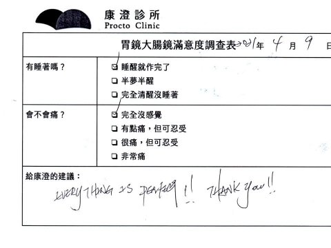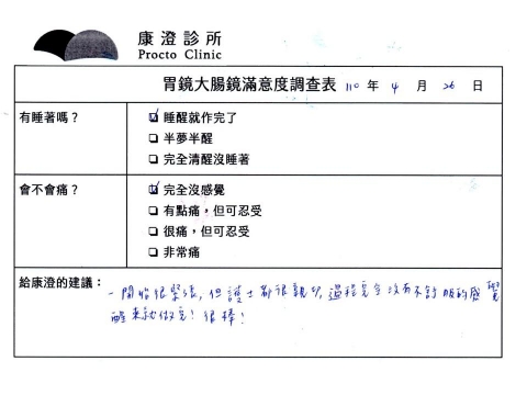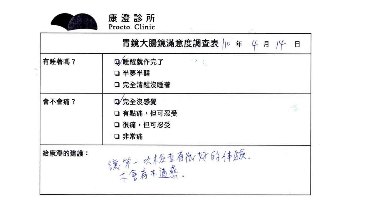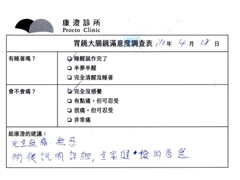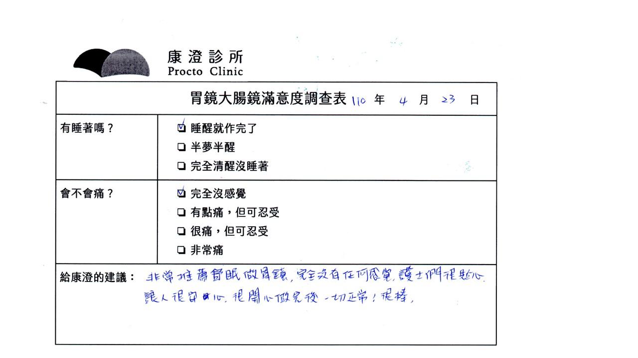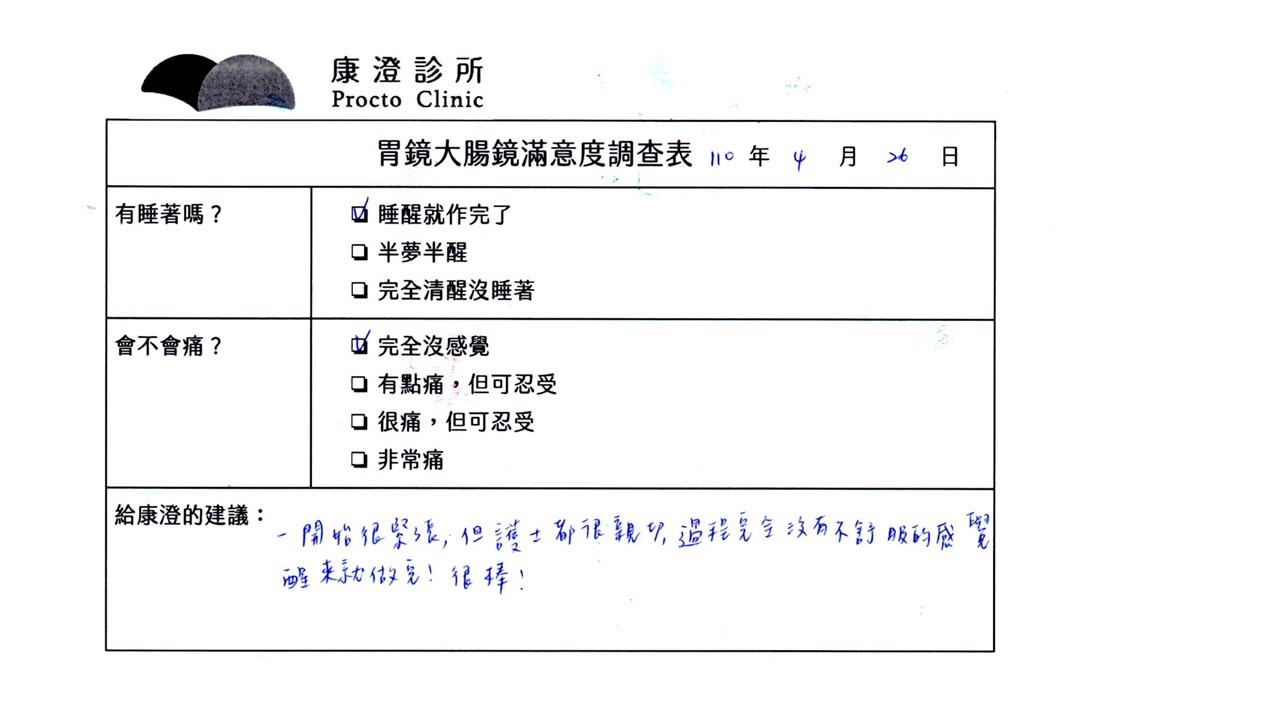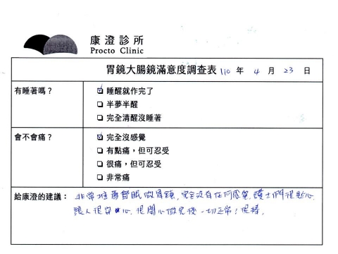 「定期穩定在櫃診所健檢,腸胃鏡的檢查醫療團隊及護理人員後續衛教的處理不輸醫院等級ㆍ專業丶舒適丶安心,整個療程無痛,護理人員親切可降低檢查的緊張感,非常感謝!」