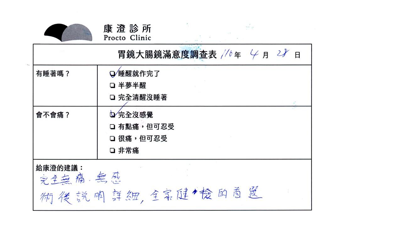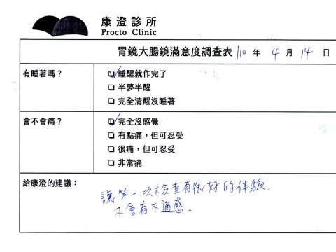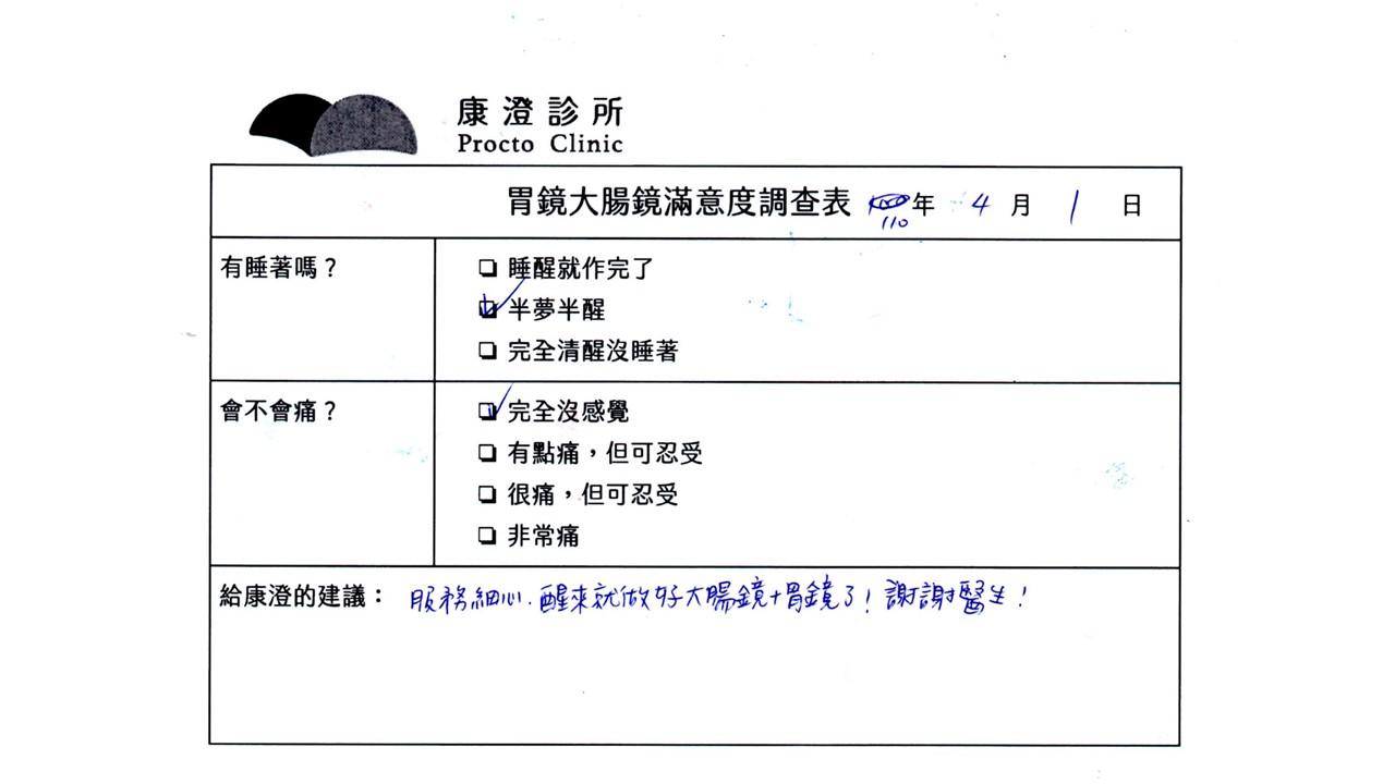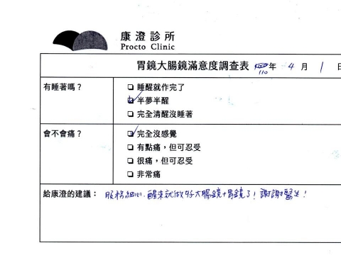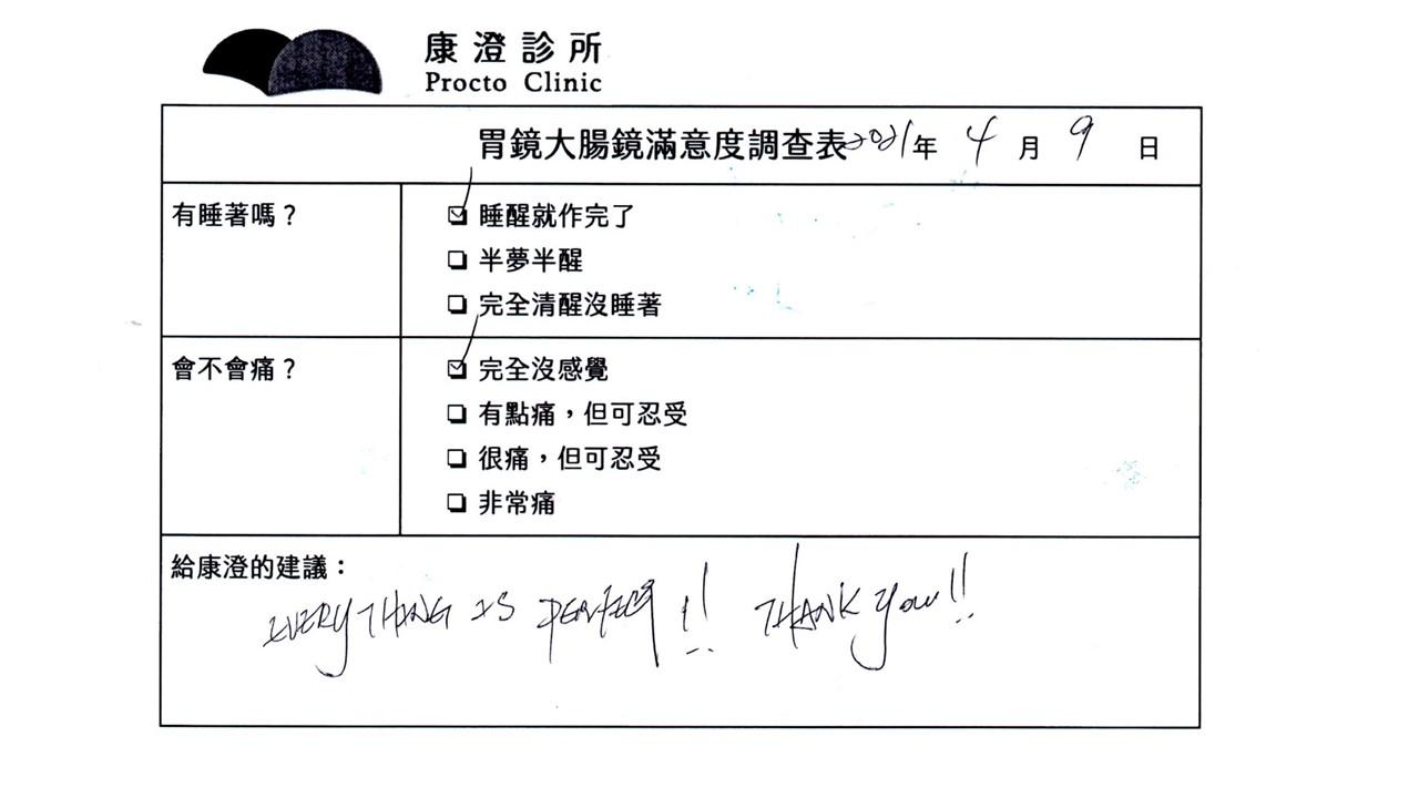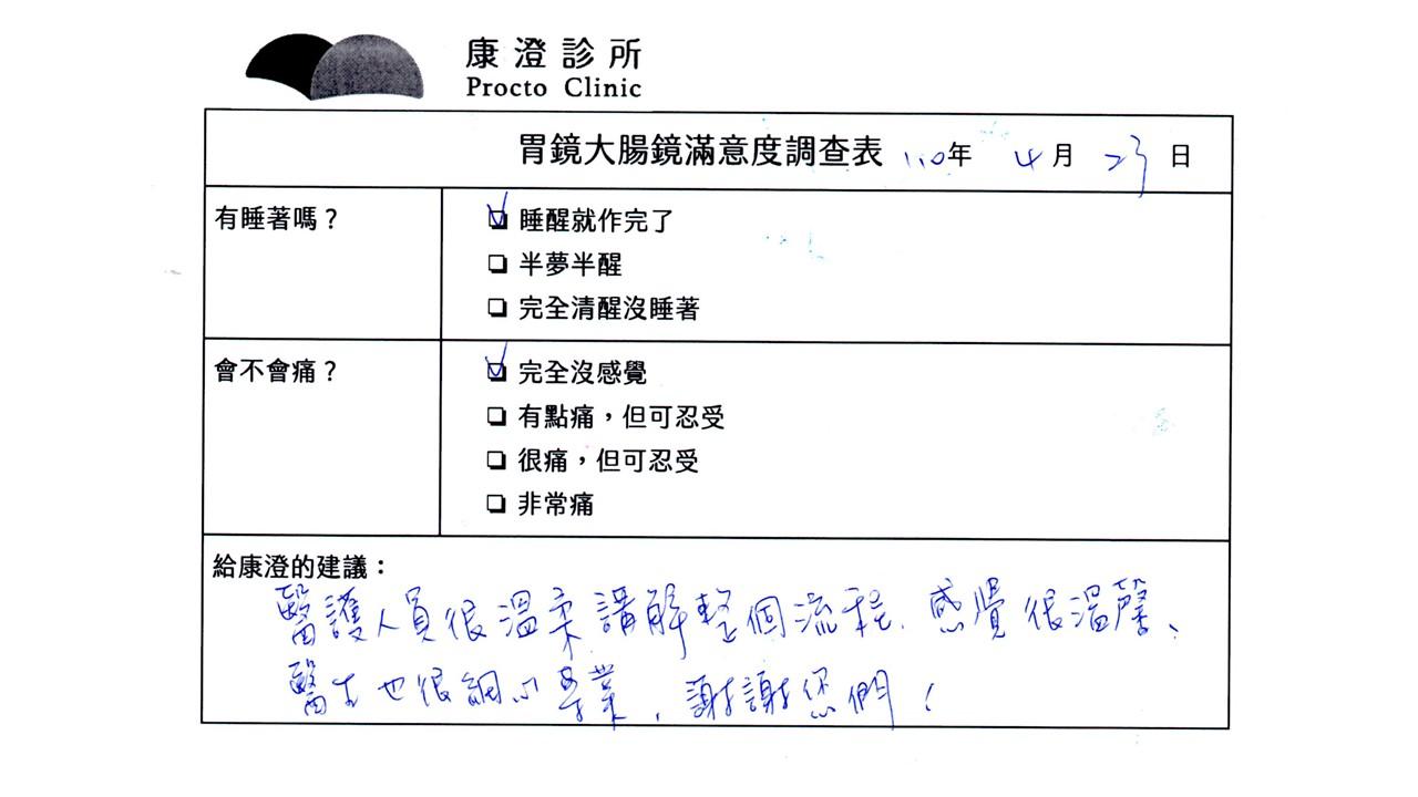 「定期穩定在櫃診所健檢,腸胃鏡的檢查醫療團隊及護理人員後續衛教的處理不輸醫院等級ㆍ專業丶舒適丶安心,整個療程無痛,護理人員親切可降低檢查的緊張感,非常感謝!」