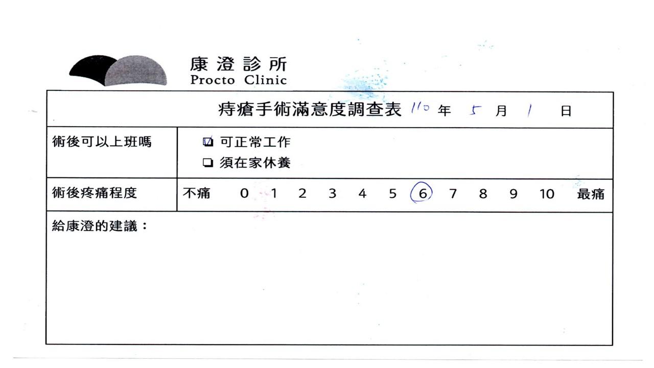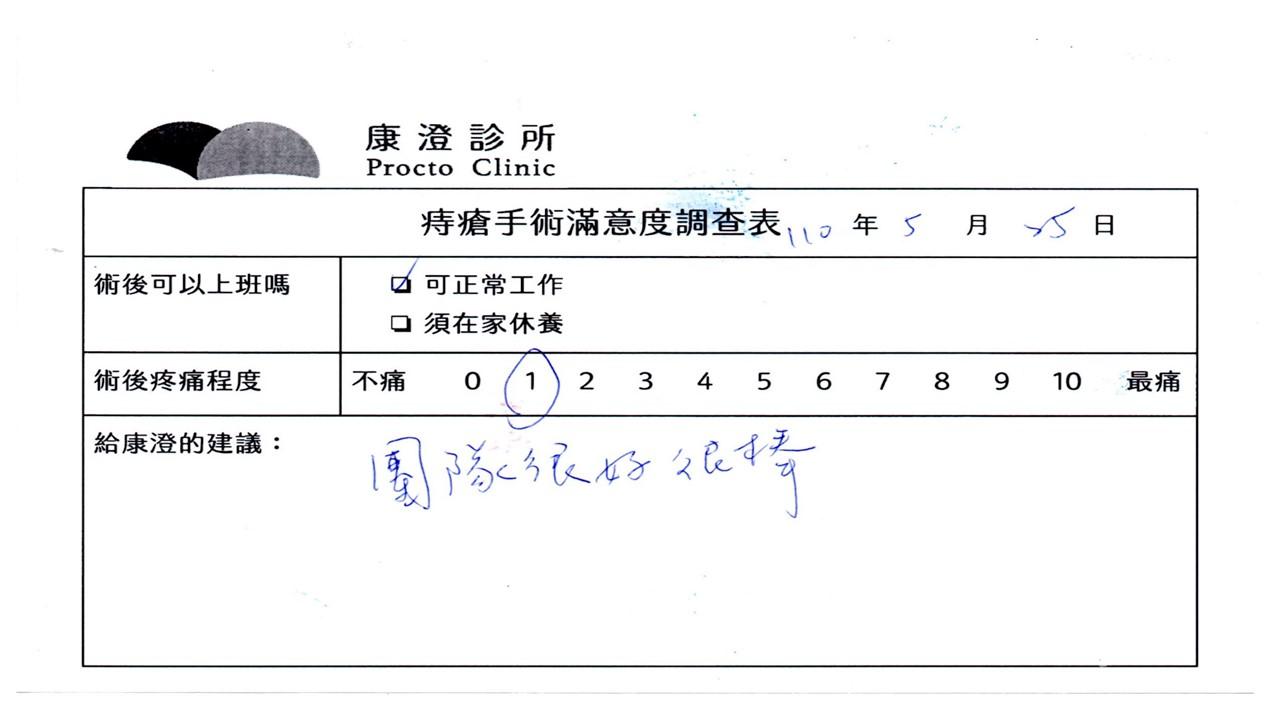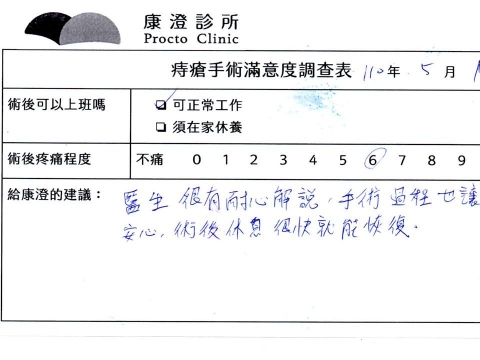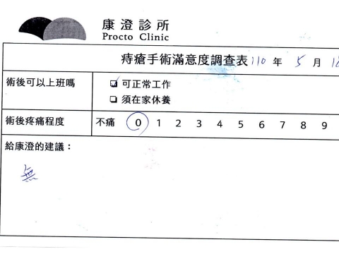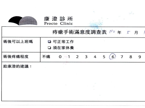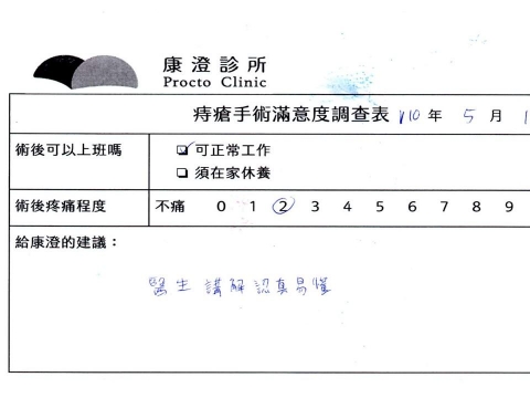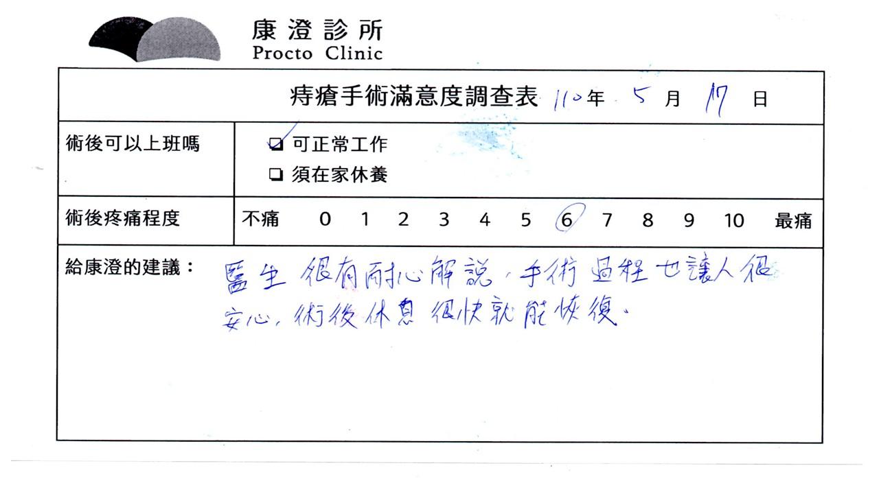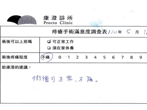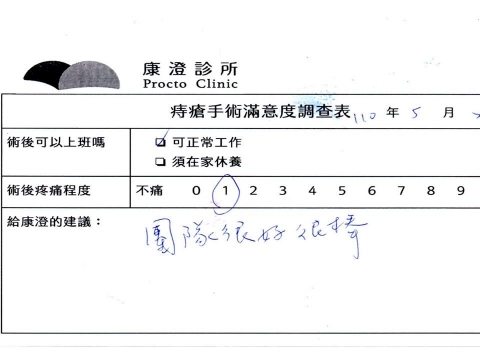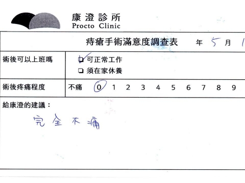 「困擾了20多年的三期內痔,終於在幾天內就解決了,原以為會很疼痛的手術及復原過程,結果真是神奇啊!不會痛呢!長效針應該是有用的,前幾天主要是腫脹,感謝林醫師,以及術後時時電話關心的小護士們,很棒!」