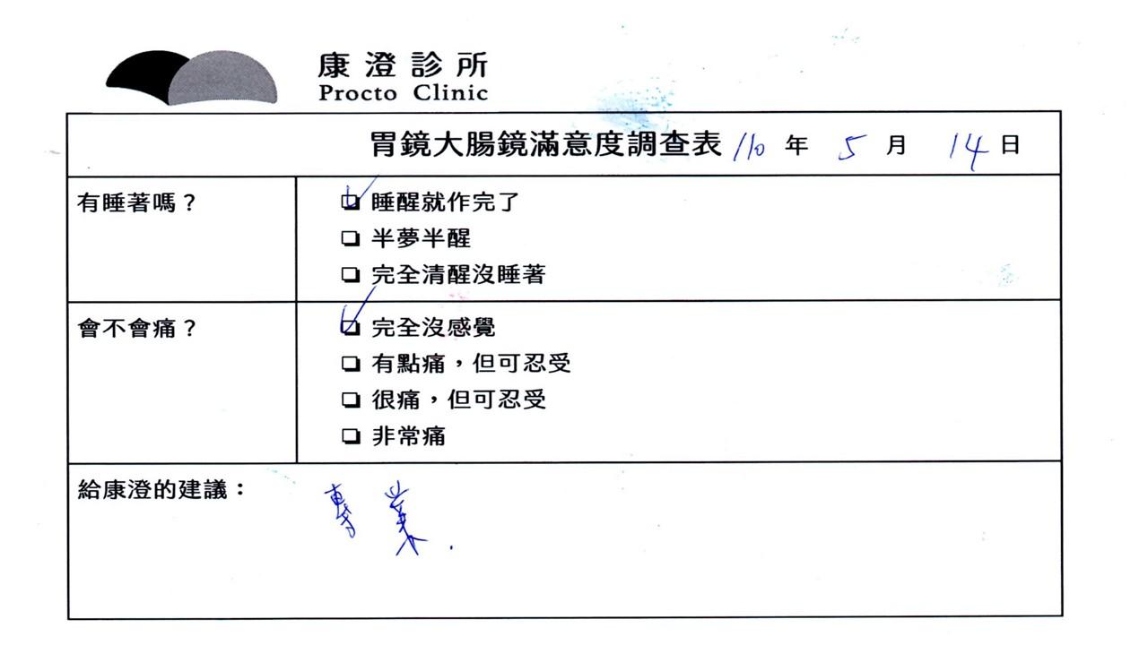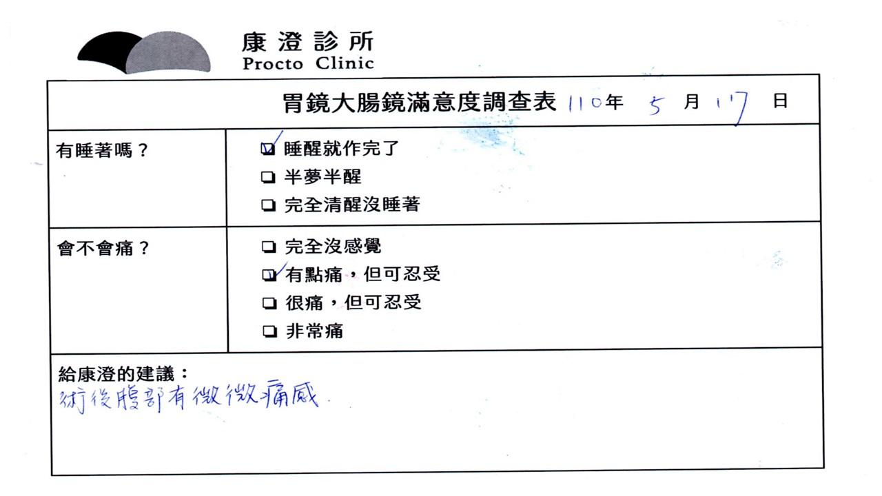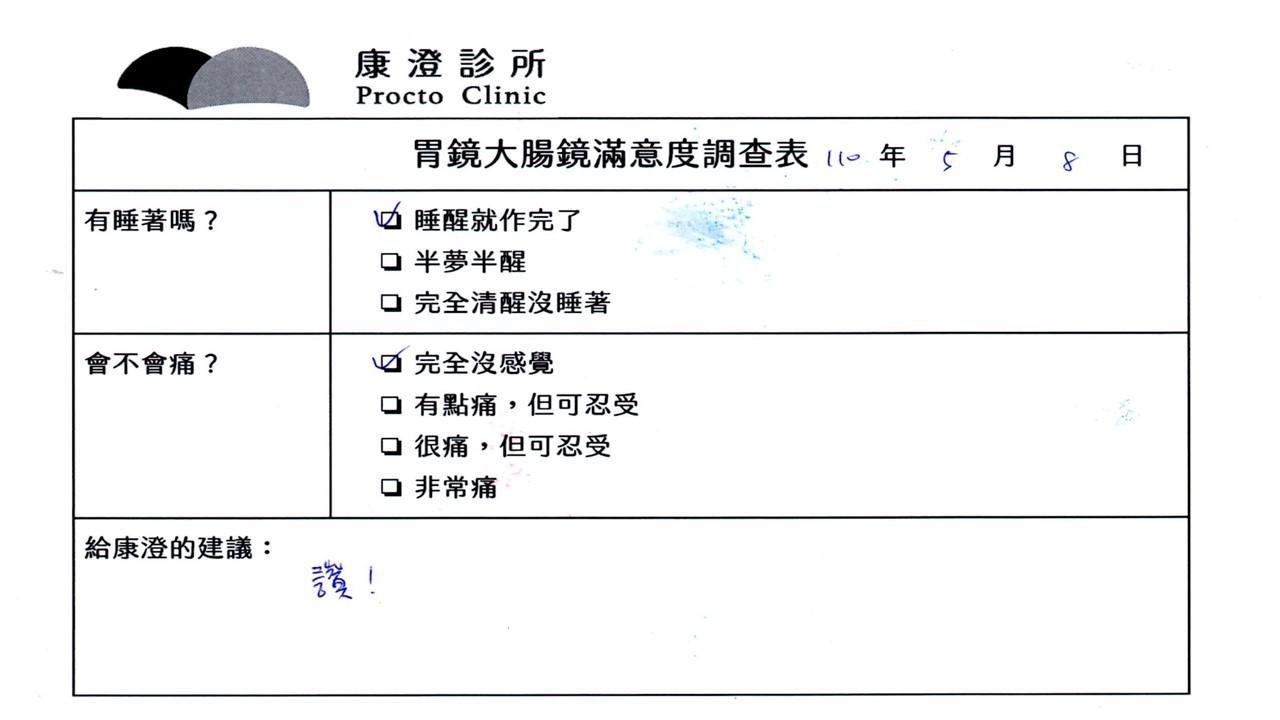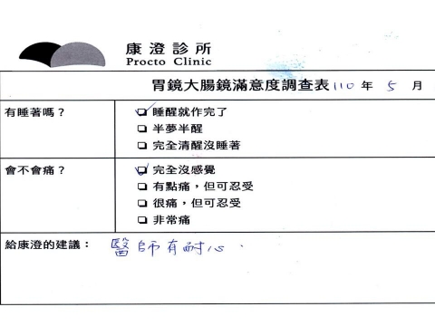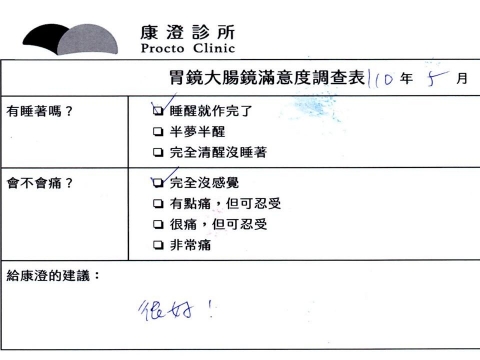 「定期穩定在櫃診所健檢,腸胃鏡的檢查醫療團隊及護理人員後續衛教的處理不輸醫院等級ㆍ專業丶舒適丶安心,整個療程無痛,護理人員親切可降低檢查的緊張感,非常感謝!」