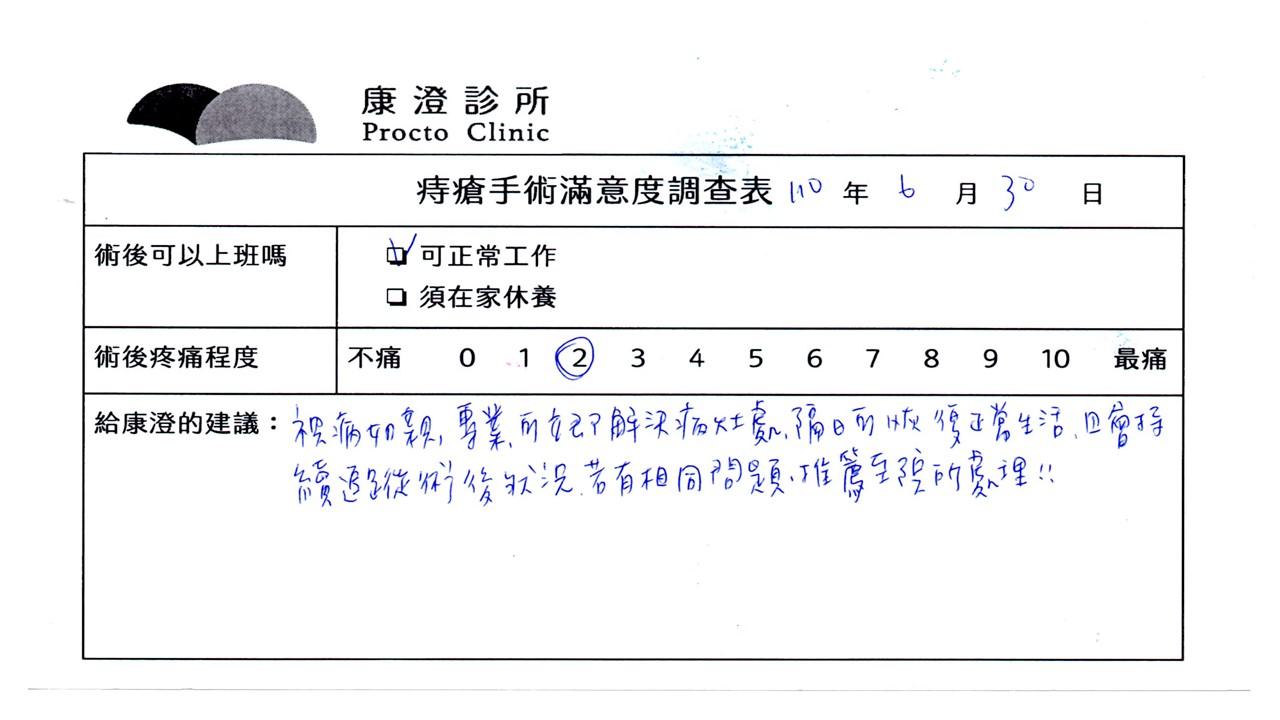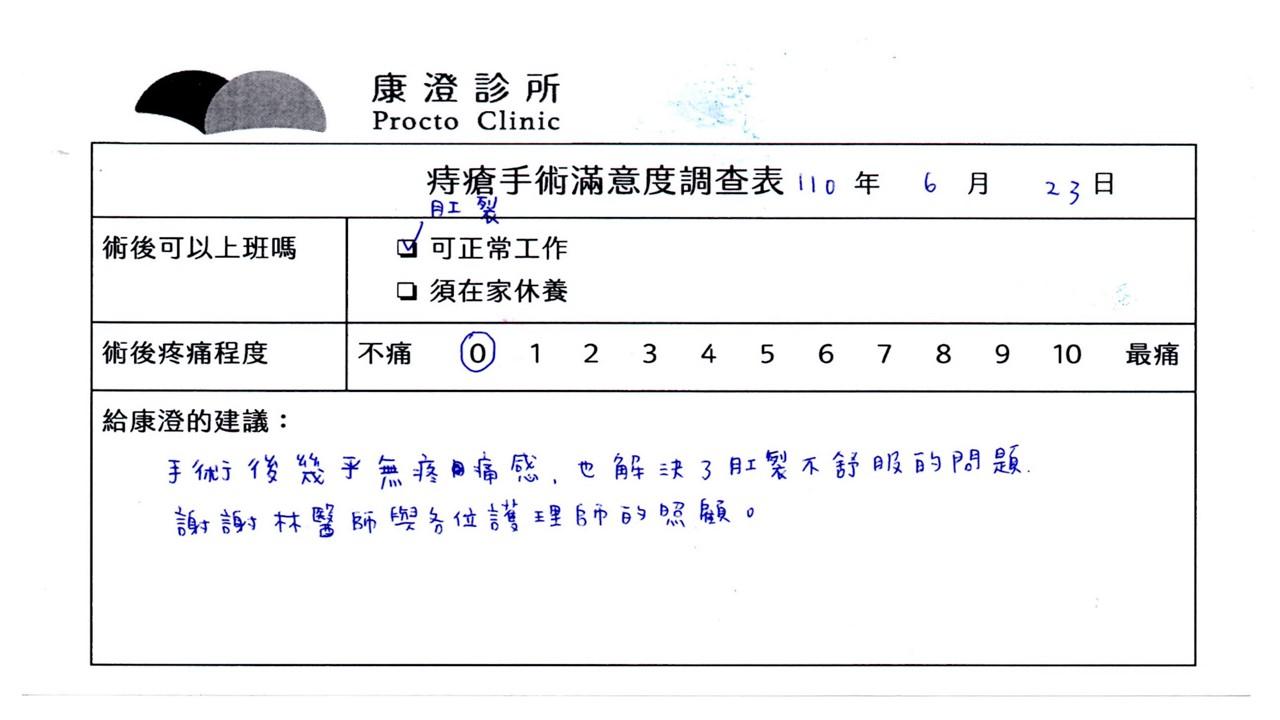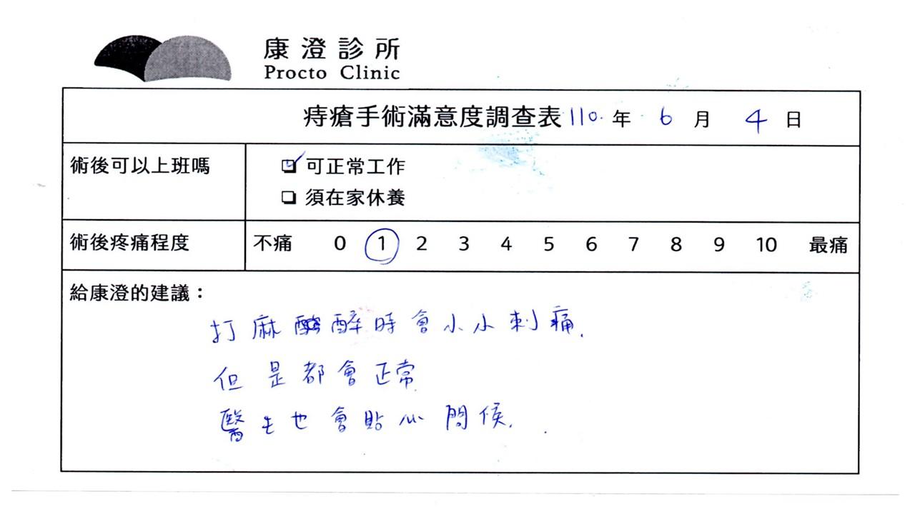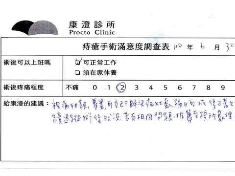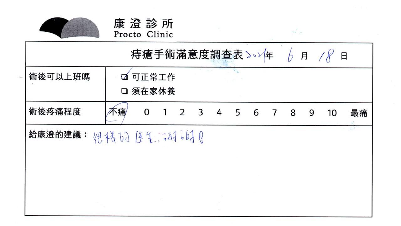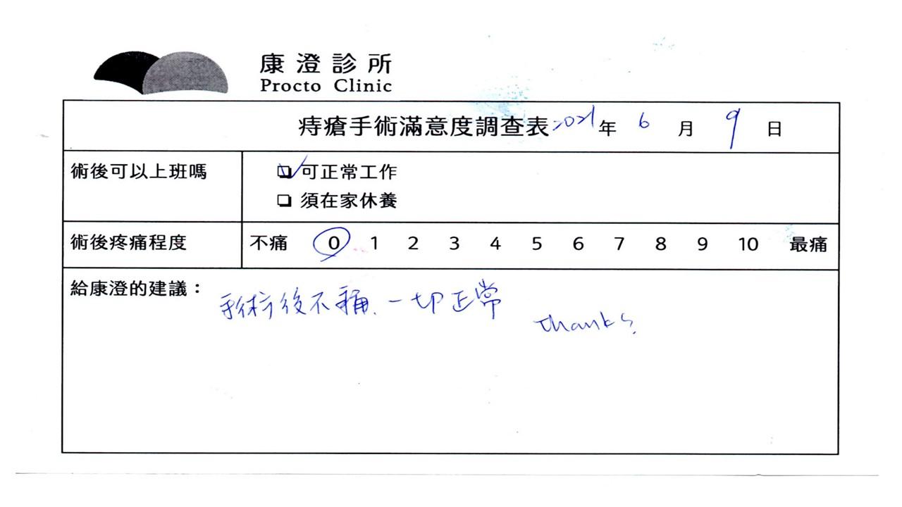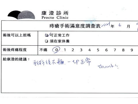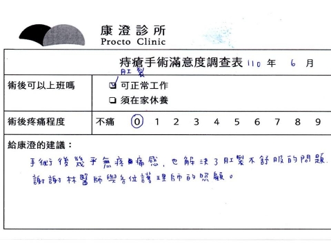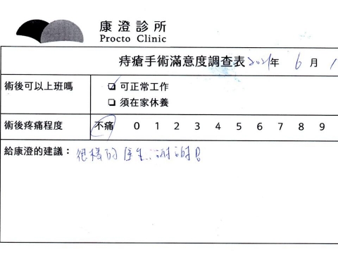 「困擾了20多年的三期內痔,終於在幾天內就解決了,原以為會很疼痛的手術及復原過程,結果真是神奇啊!不會痛呢!長效針應該是有用的,前幾天主要是腫脹,感謝林醫師,以及術後時時電話關心的小護士們,很棒!」