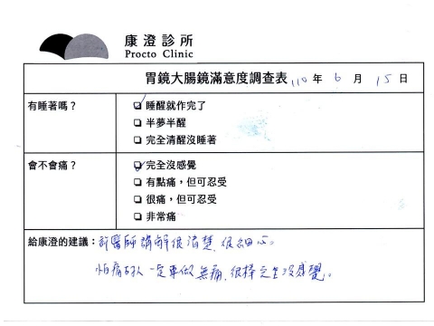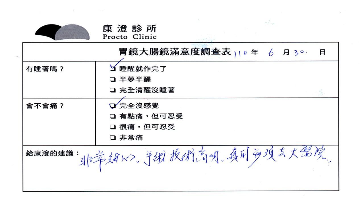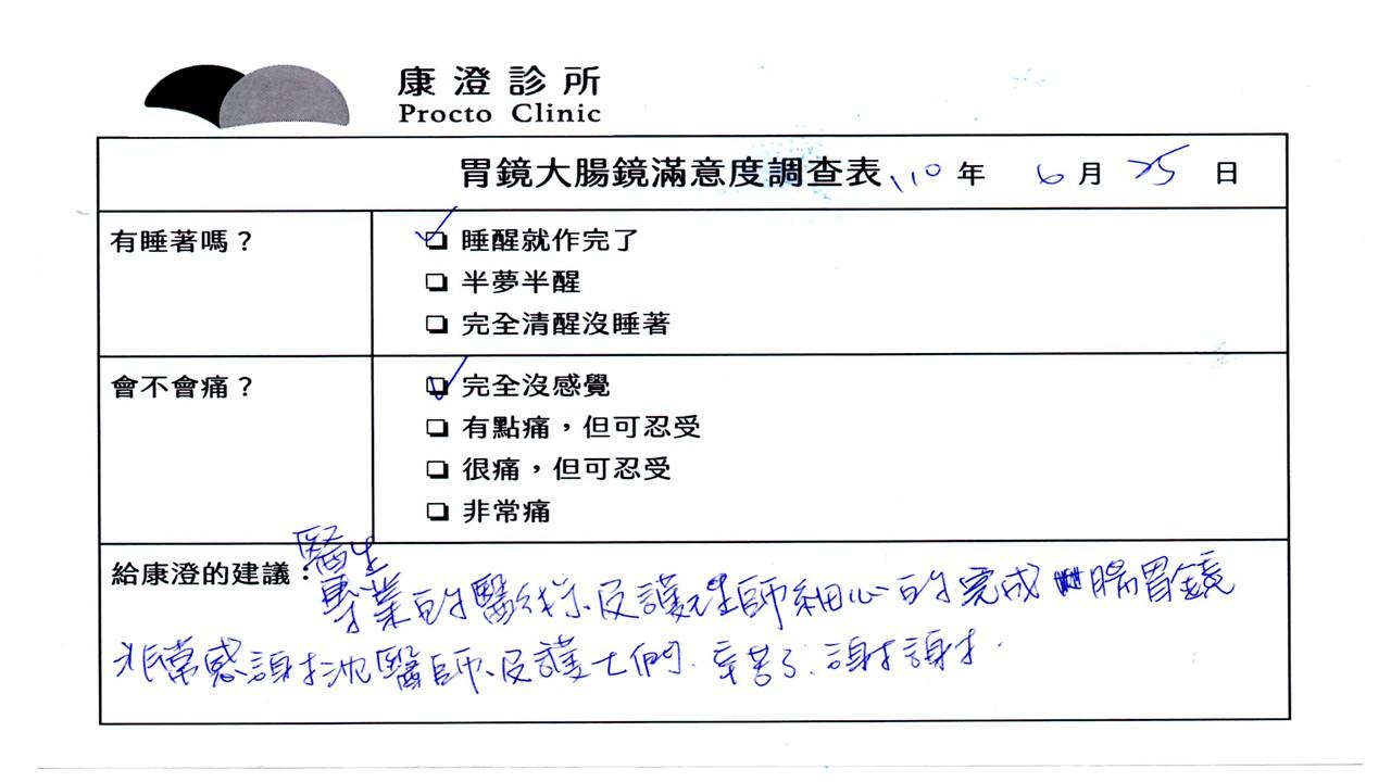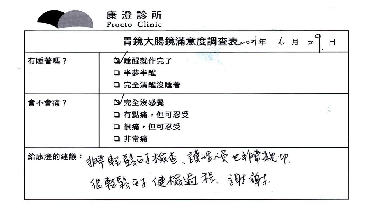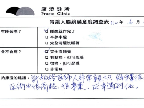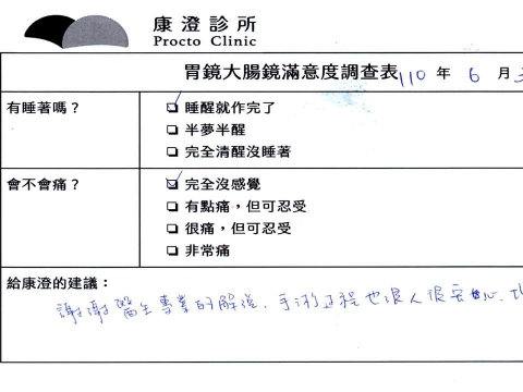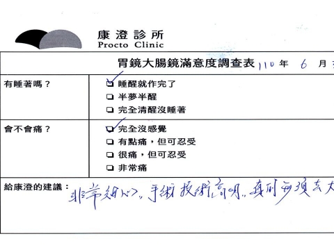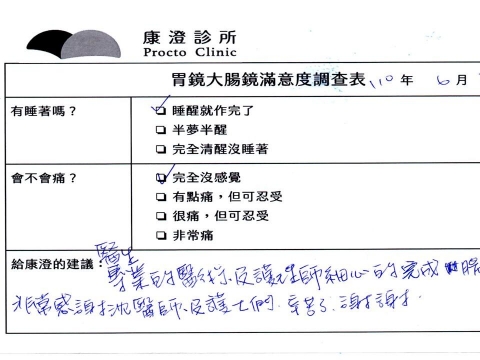 「定期穩定在櫃診所健檢,腸胃鏡的檢查醫療團隊及護理人員後續衛教的處理不輸醫院等級ㆍ專業丶舒適丶安心,整個療程無痛,護理人員親切可降低檢查的緊張感,非常感謝!」