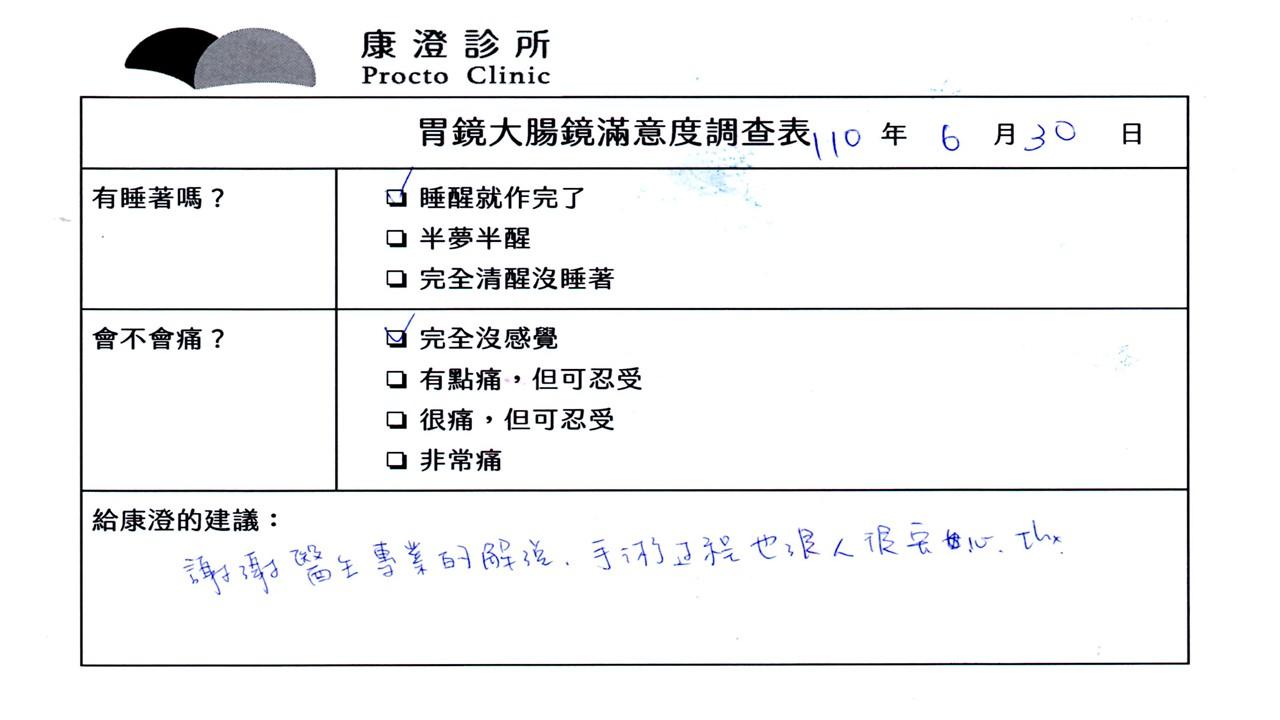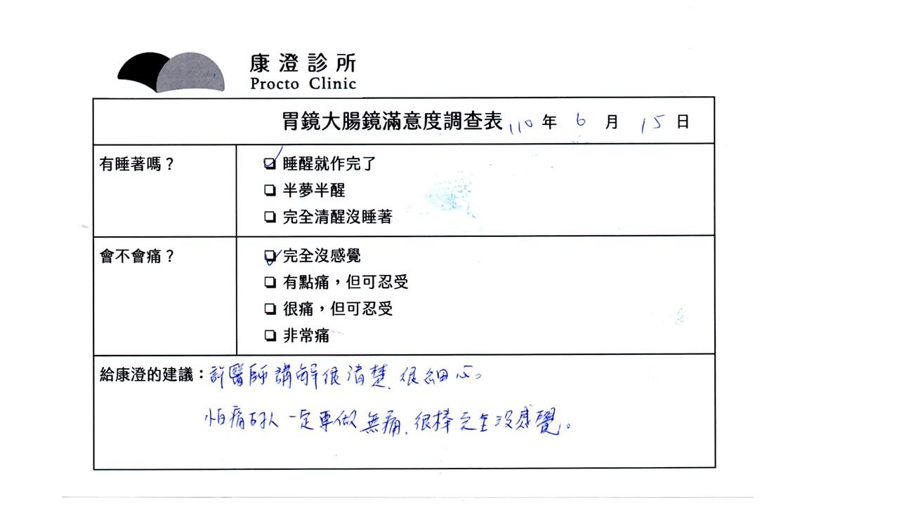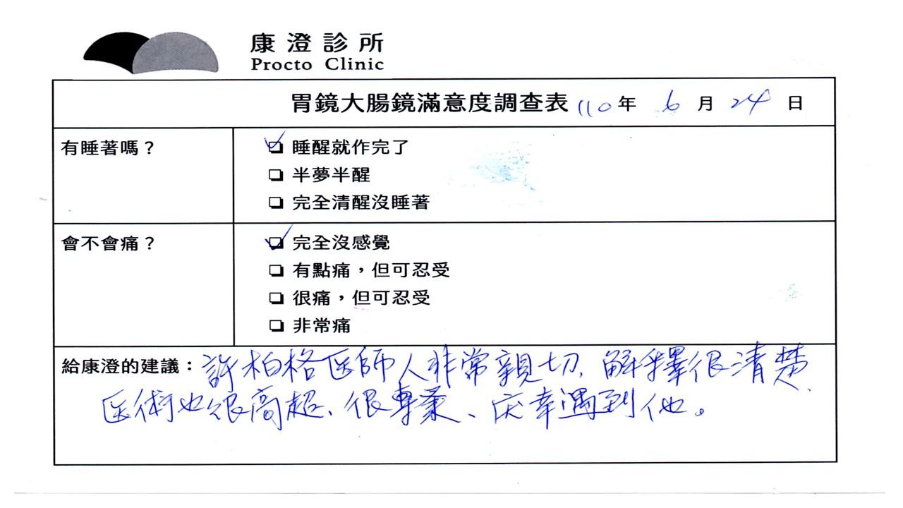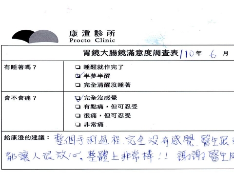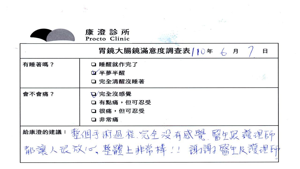 「定期穩定在櫃診所健檢,腸胃鏡的檢查醫療團隊及護理人員後續衛教的處理不輸醫院等級ㆍ專業丶舒適丶安心,整個療程無痛,護理人員親切可降低檢查的緊張感,非常感謝!」