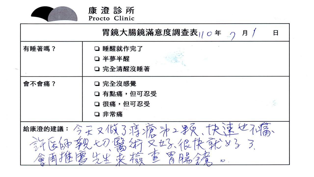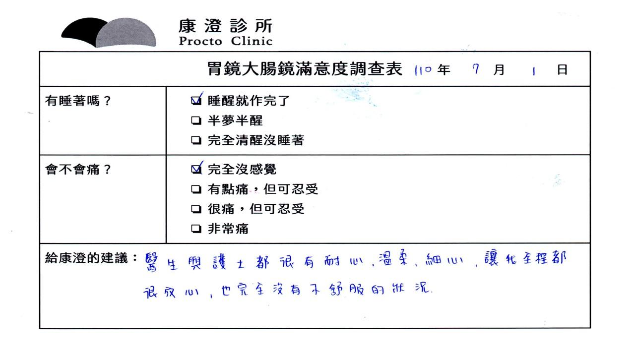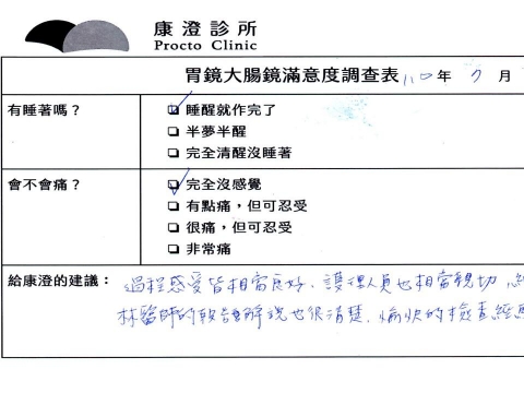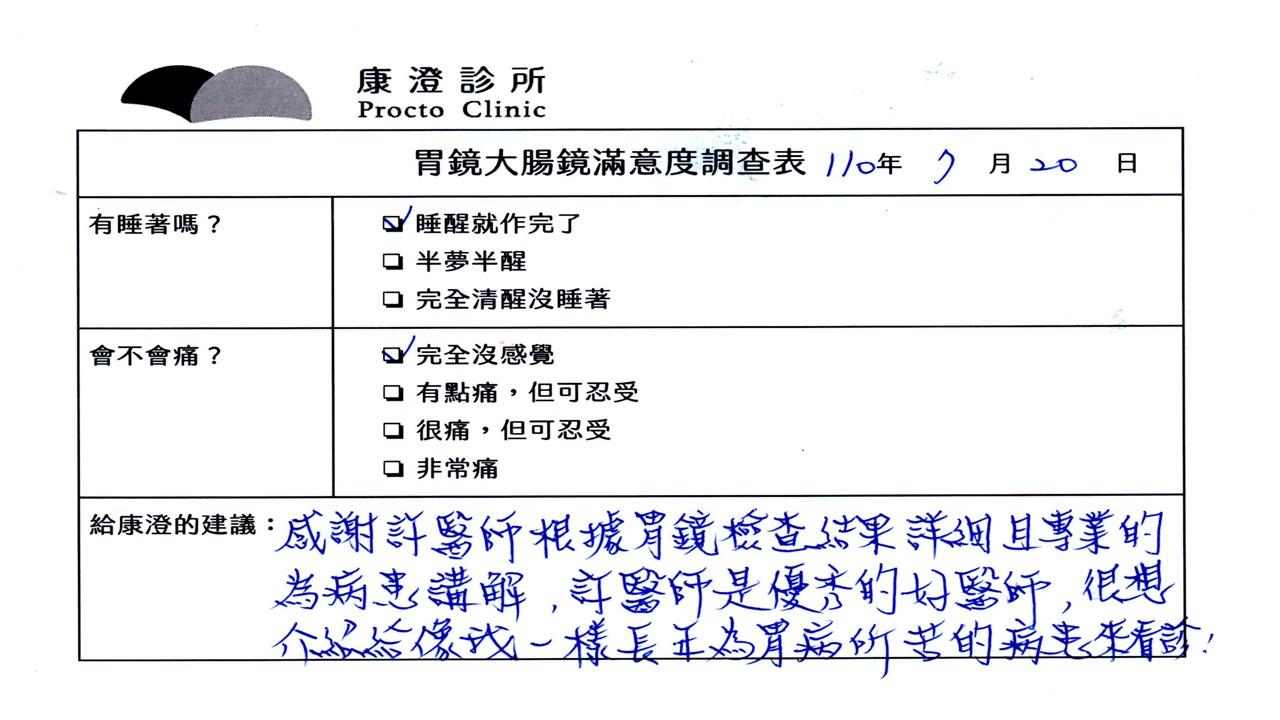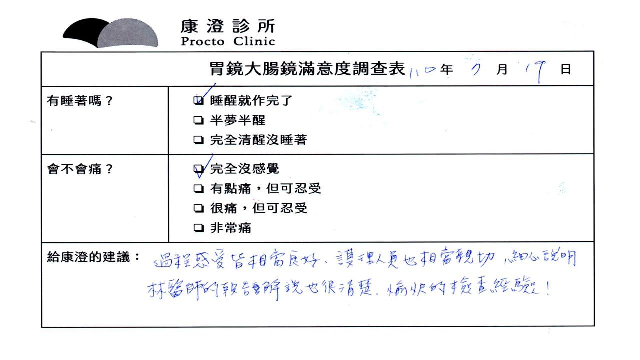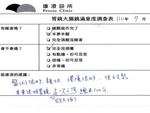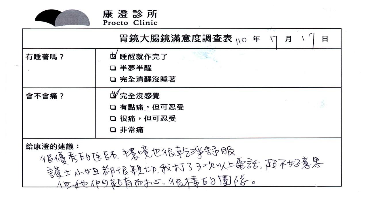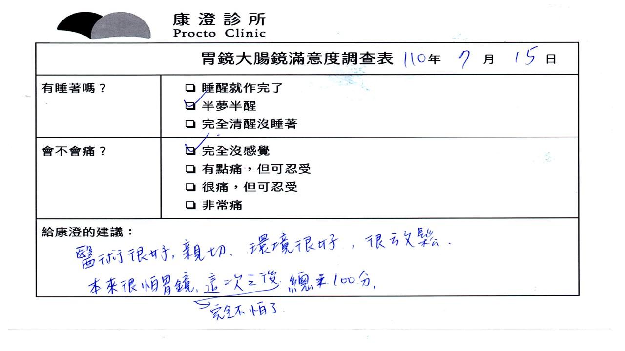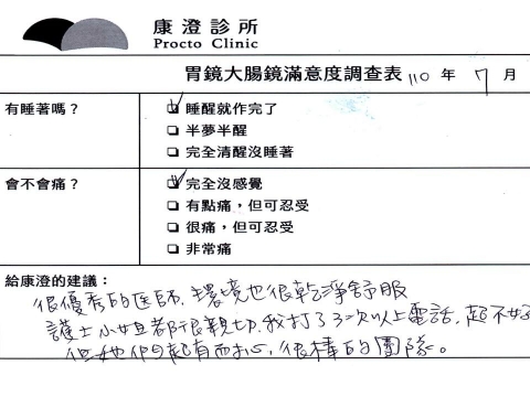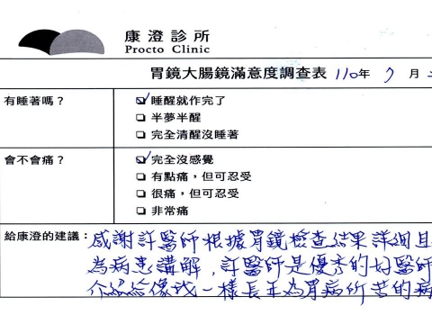 「定期穩定在櫃診所健檢,腸胃鏡的檢查醫療團隊及護理人員後續衛教的處理不輸醫院等級ㆍ專業丶舒適丶安心,整個療程無痛,護理人員親切可降低檢查的緊張感,非常感謝!」
