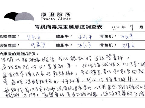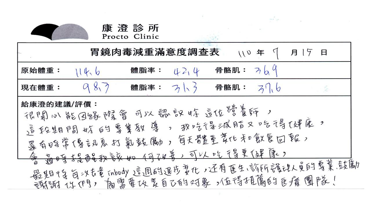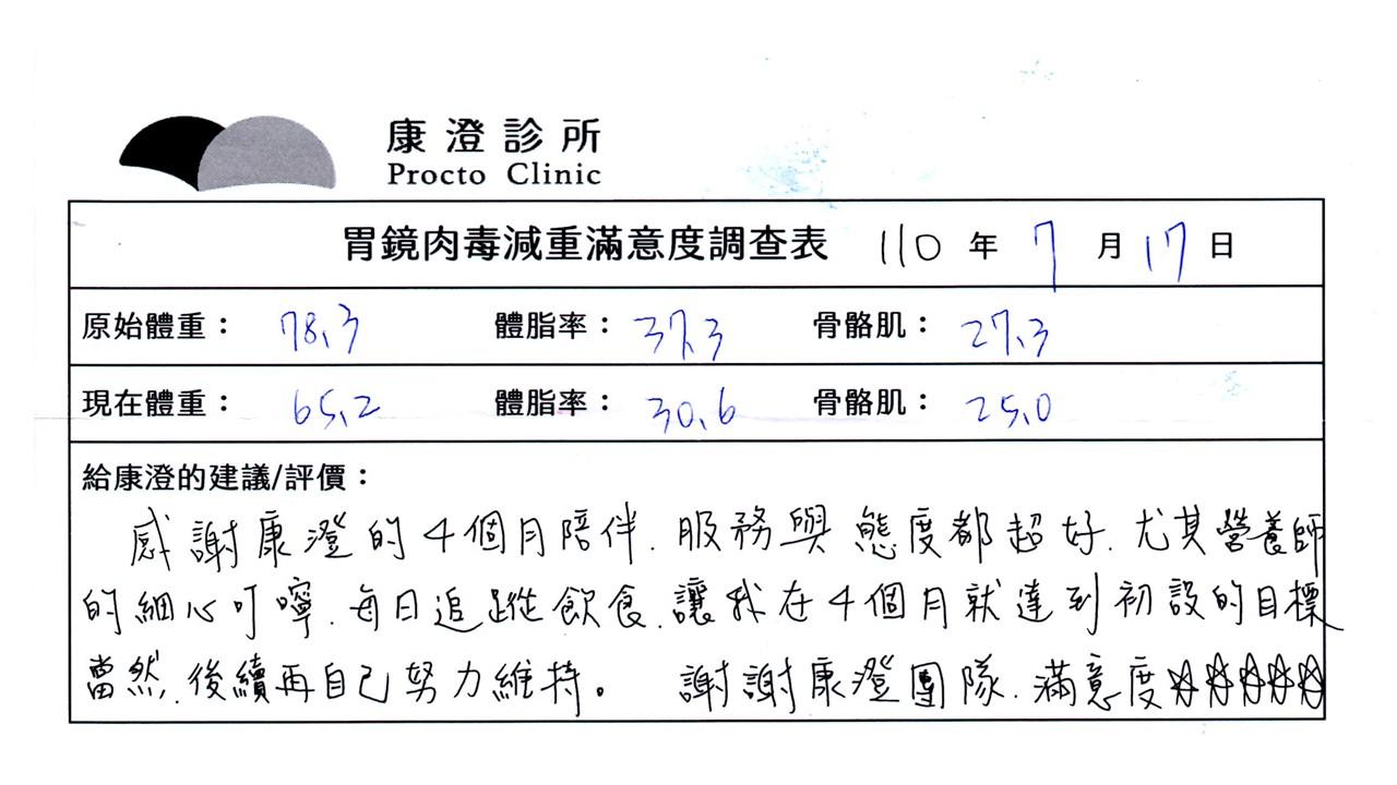 「很開心做了胃肉毒減重療程,讓我體會最幸福不挨餓的減肥方式!瘦了10%體重後,讓體態變美,最重要是身體變健康喔!感謝羅醫師及營養師的提醒及追蹤。」