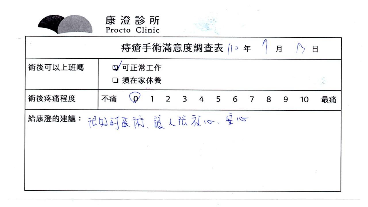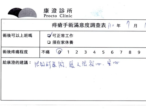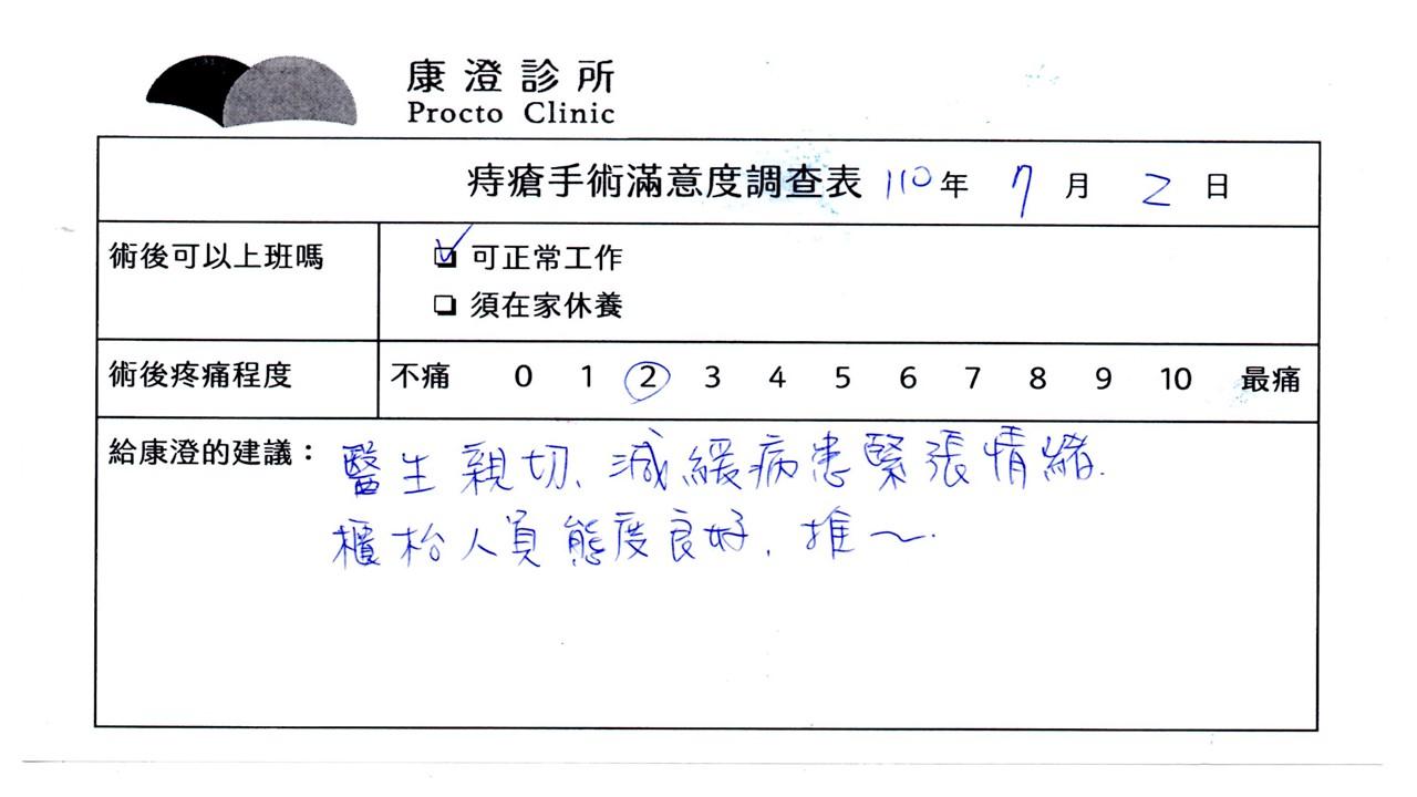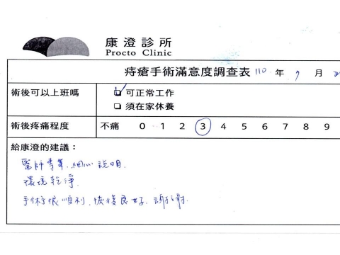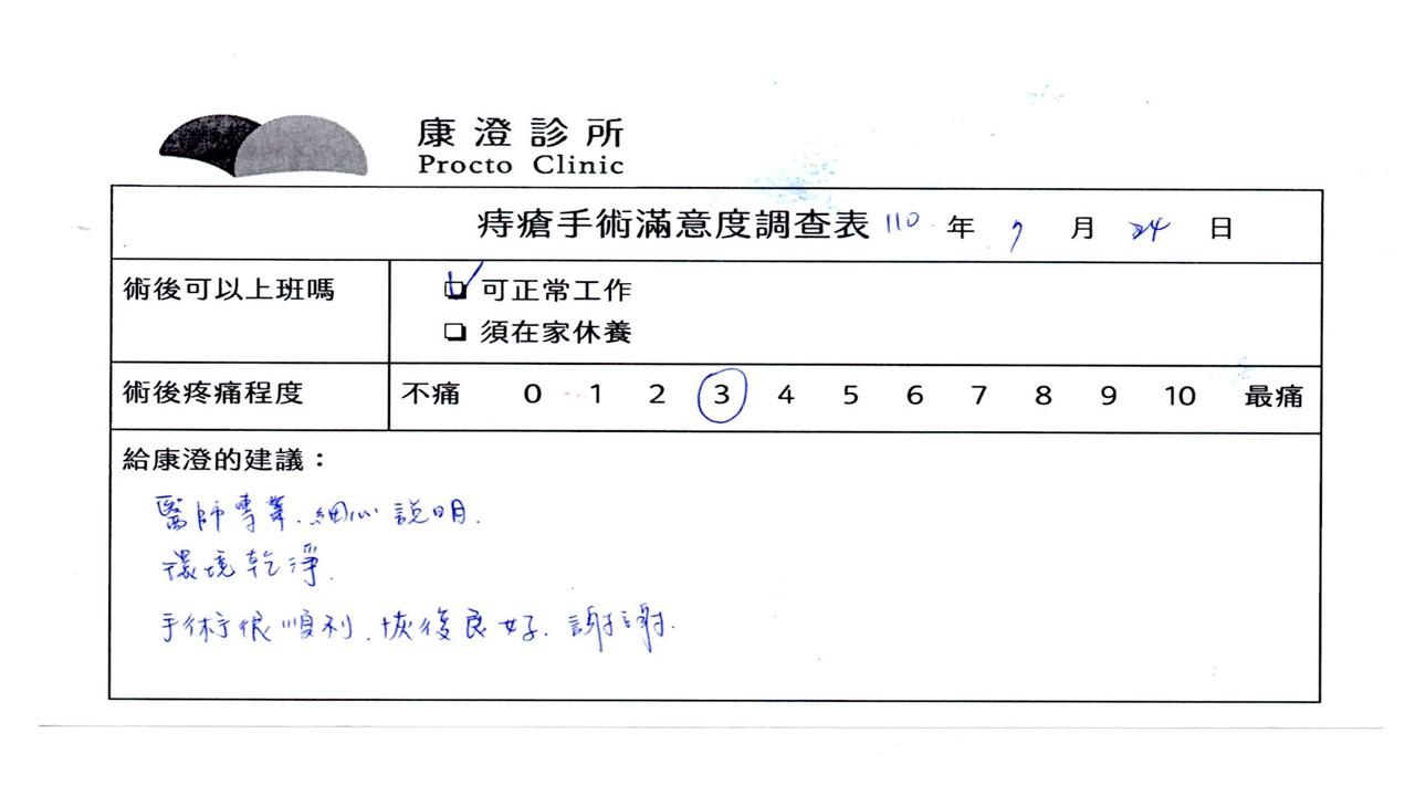 「困擾了20多年的三期內痔,終於在幾天內就解決了,原以為會很疼痛的手術及復原過程,結果真是神奇啊!不會痛呢!長效針應該是有用的,前幾天主要是腫脹,感謝林醫師,以及術後時時電話關心的小護士們,很棒!」