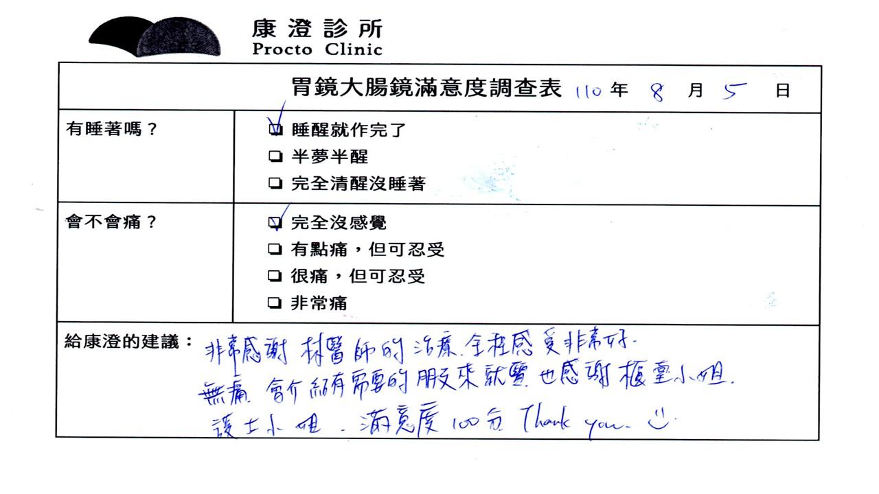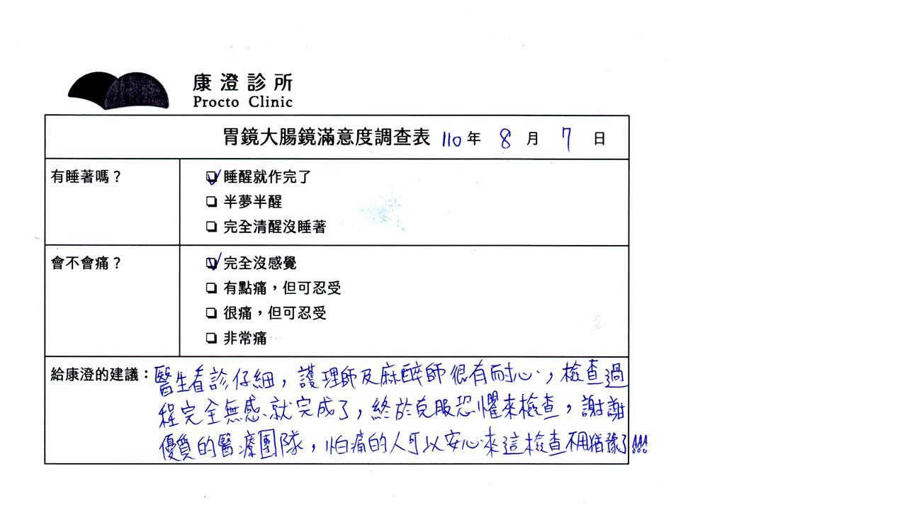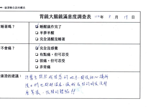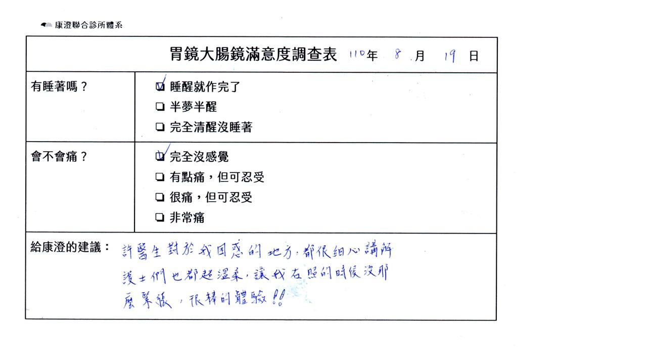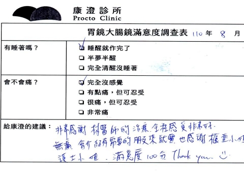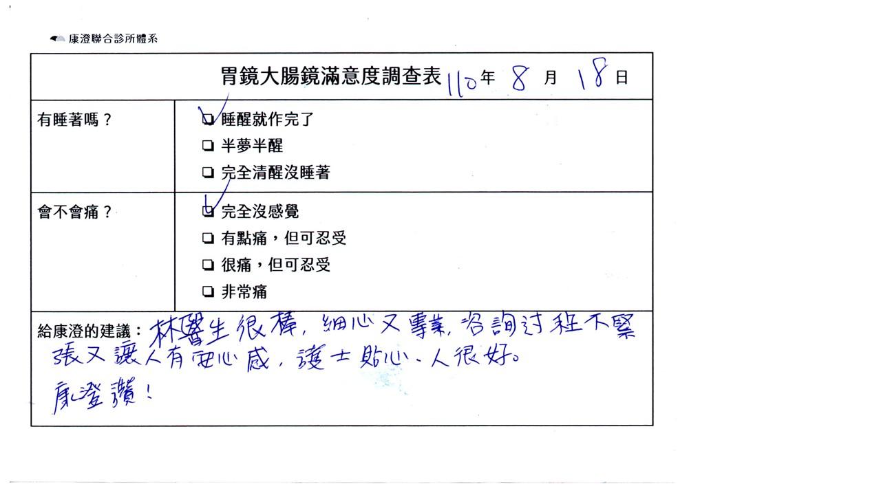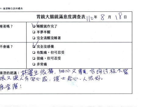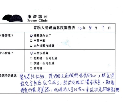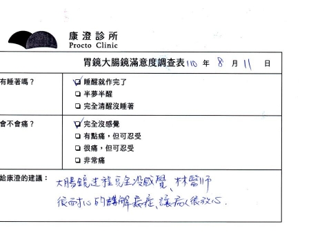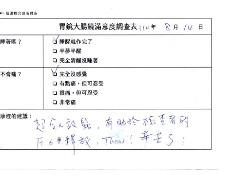 「定期穩定在櫃診所健檢,腸胃鏡的檢查醫療團隊及護理人員後續衛教的處理不輸醫院等級ㆍ專業丶舒適丶安心,整個療程無痛,護理人員親切可降低檢查的緊張感,非常感謝!」