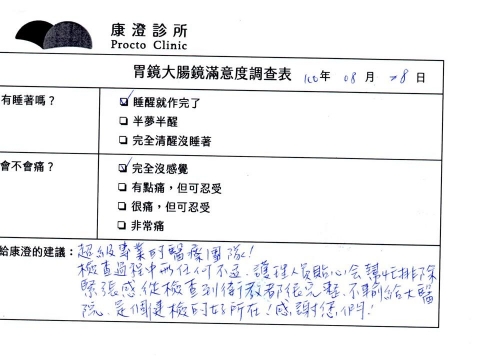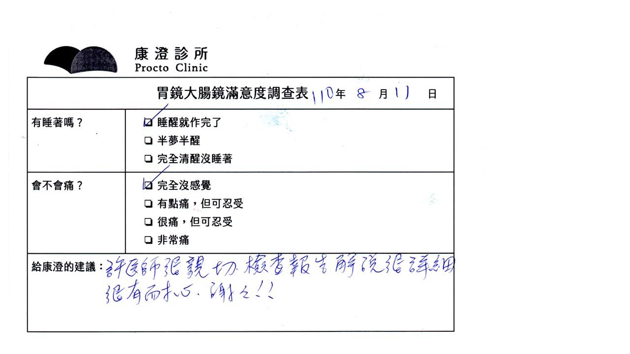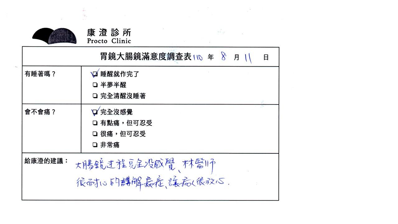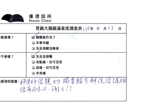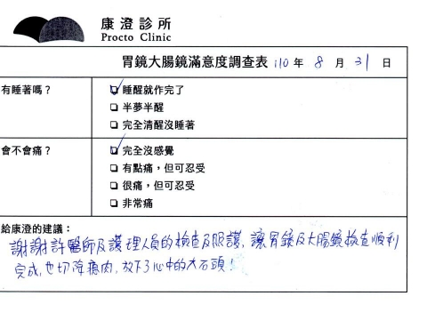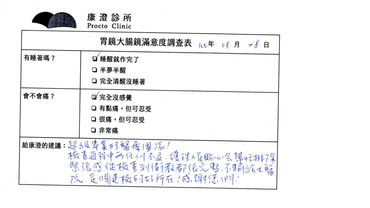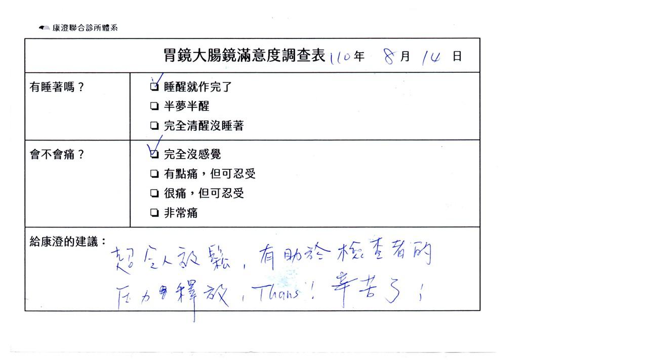 「定期穩定在櫃診所健檢,腸胃鏡的檢查醫療團隊及護理人員後續衛教的處理不輸醫院等級ㆍ專業丶舒適丶安心,整個療程無痛,護理人員親切可降低檢查的緊張感,非常感謝!」