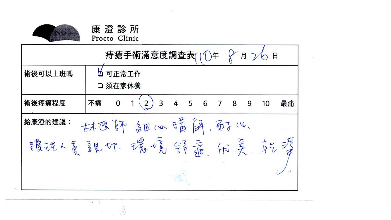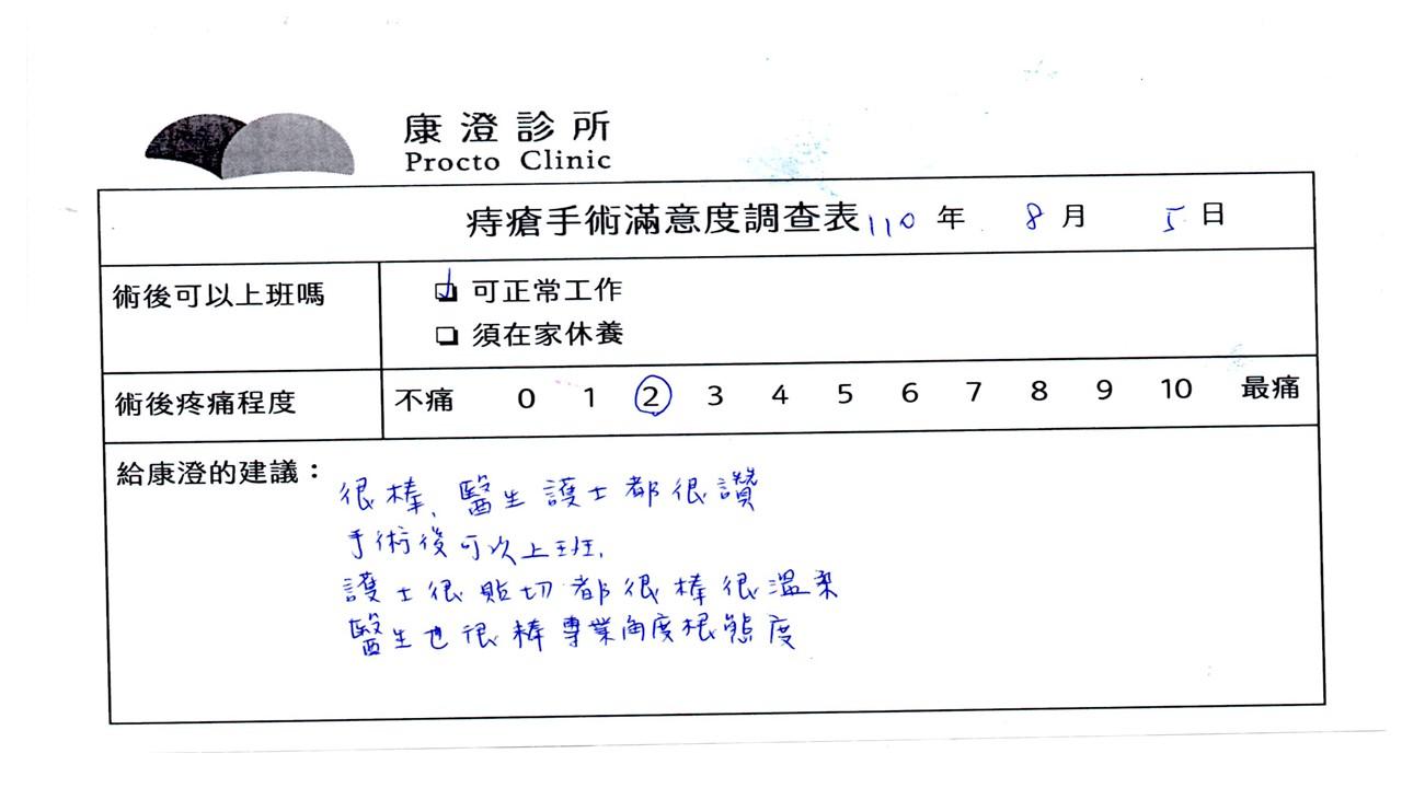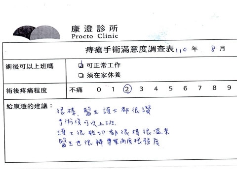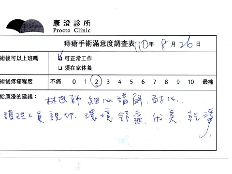 「困擾了20多年的三期內痔,終於在幾天內就解決了,原以為會很疼痛的手術及復原過程,結果真是神奇啊!不會痛呢!長效針應該是有用的,前幾天主要是腫脹,感謝林醫師,以及術後時時電話關心的小護士們,很棒!」