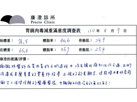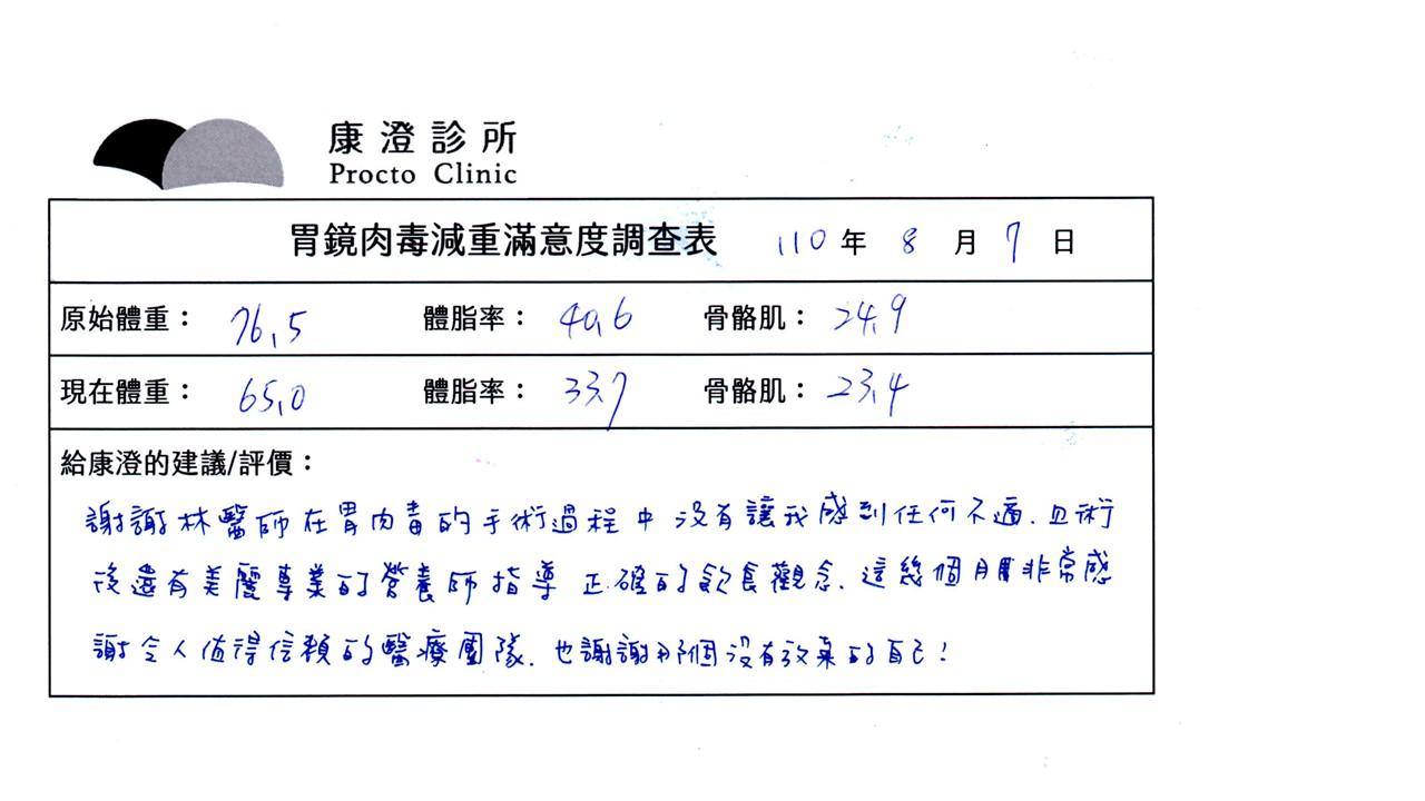 「很開心做了胃肉毒減重療程,讓我體會最幸福不挨餓的減肥方式!瘦了10%體重後,讓體態變美,最重要是身體變健康喔!感謝羅醫師及營養師的提醒及追蹤。」