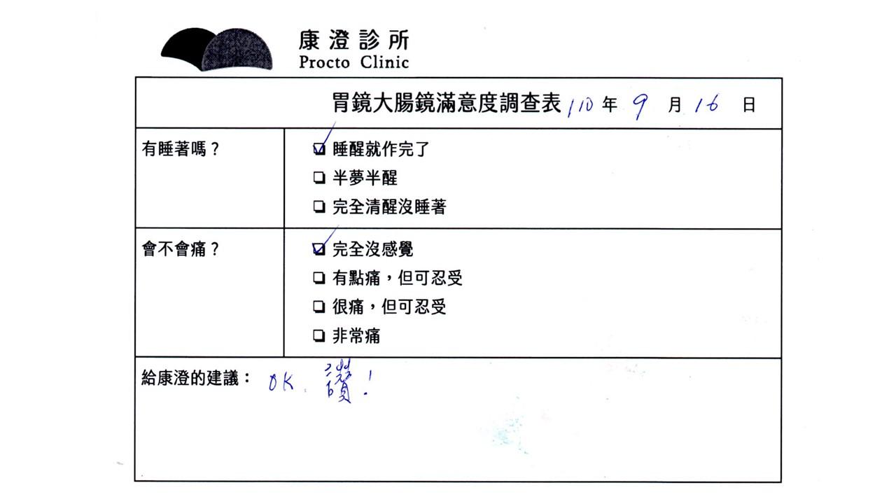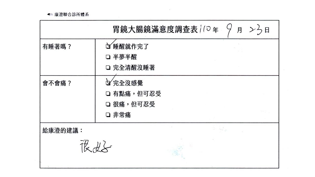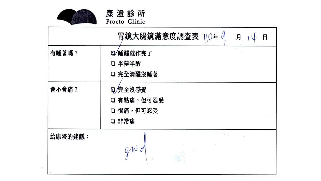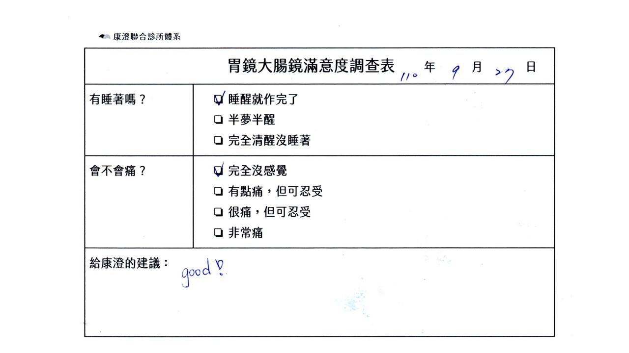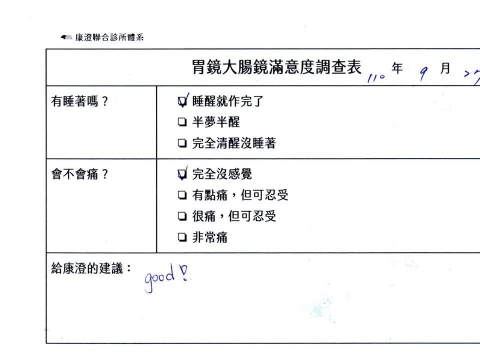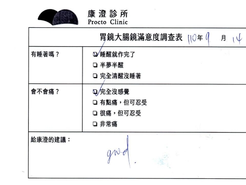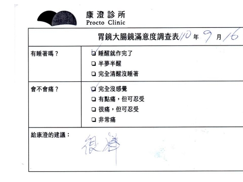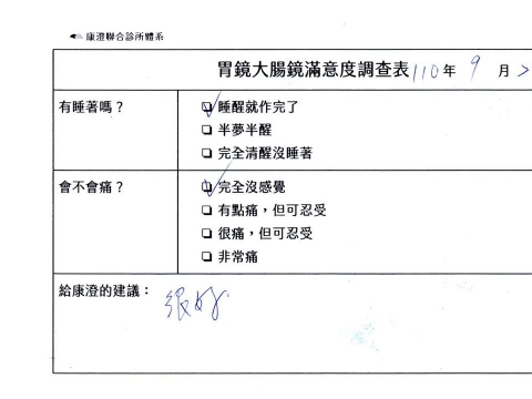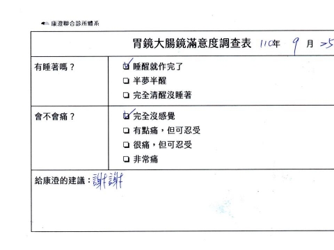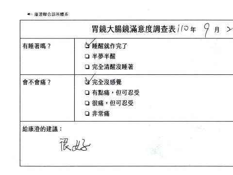 「定期穩定在櫃診所健檢,腸胃鏡的檢查醫療團隊及護理人員後續衛教的處理不輸醫院等級ㆍ專業丶舒適丶安心,整個療程無痛,護理人員親切可降低檢查的緊張感,非常感謝!」
