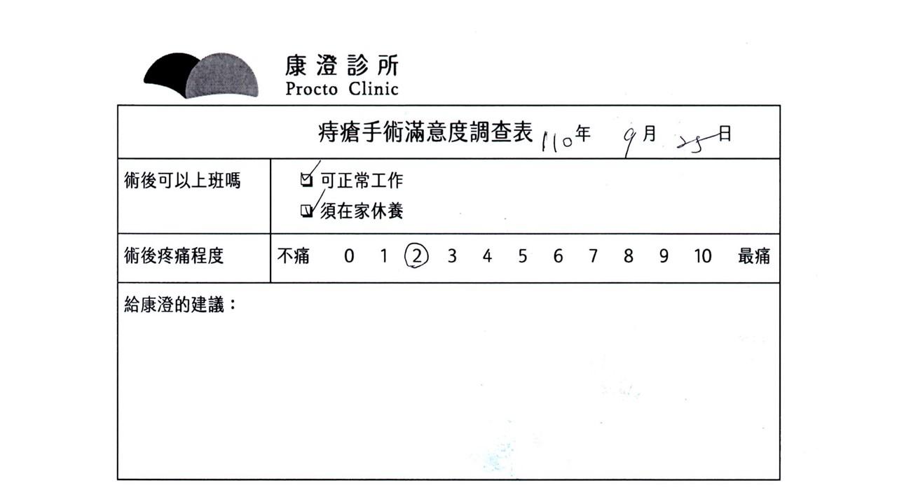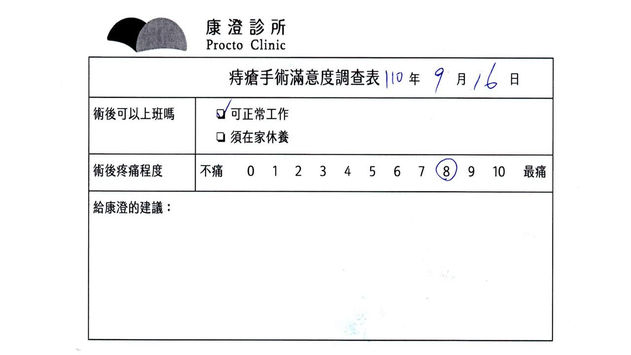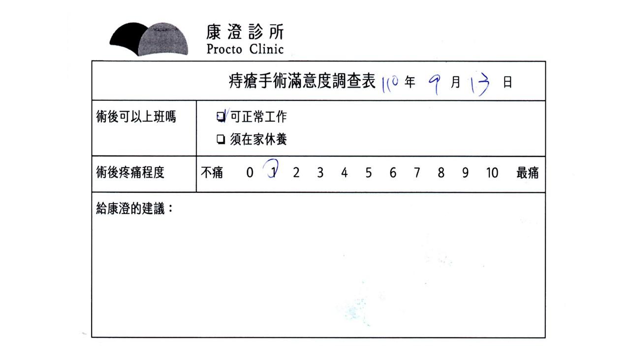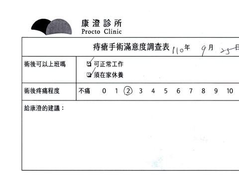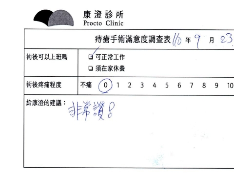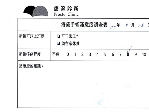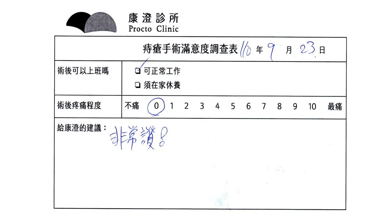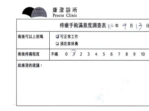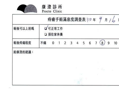 「困擾了20多年的三期內痔,終於在幾天內就解決了,原以為會很疼痛的手術及復原過程,結果真是神奇啊!不會痛呢!長效針應該是有用的,前幾天主要是腫脹,感謝林醫師,以及術後時時電話關心的小護士們,很棒!」