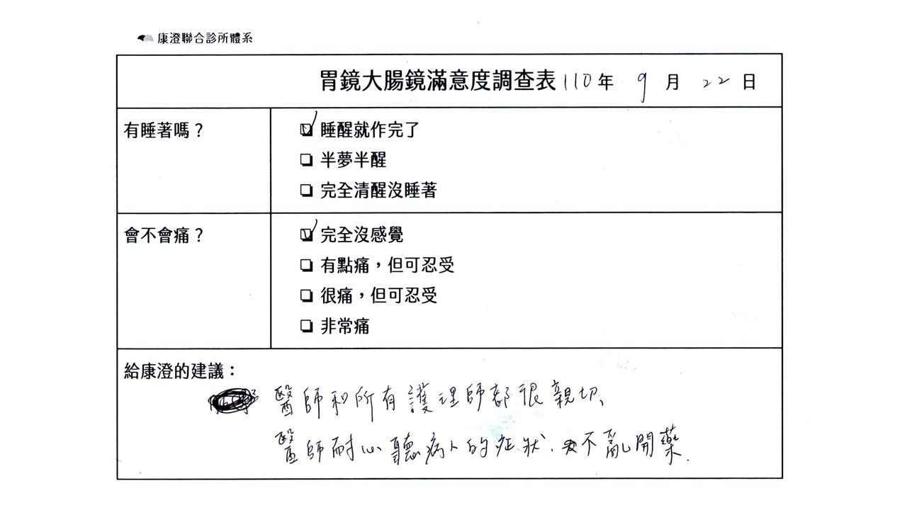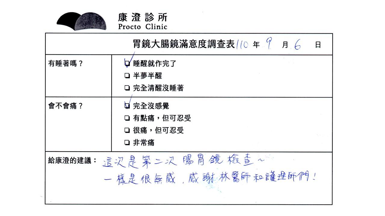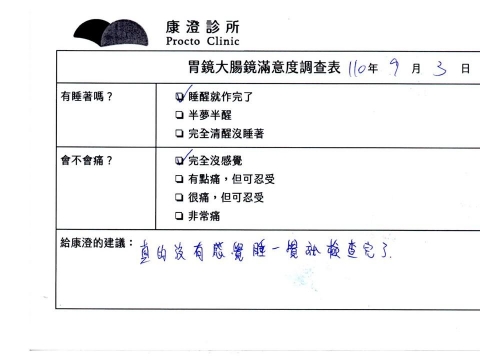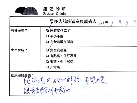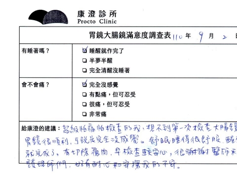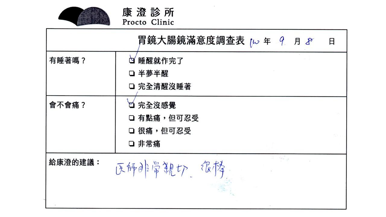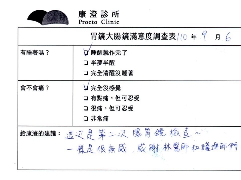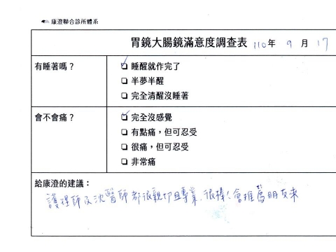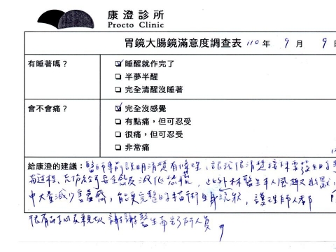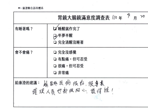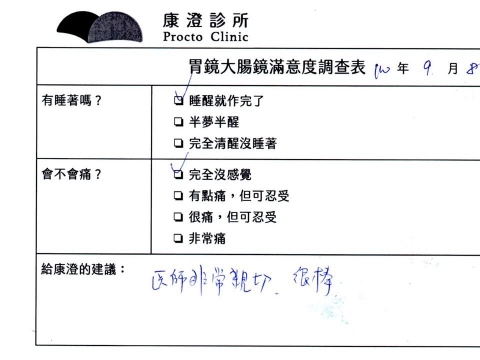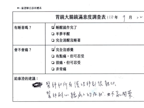 「定期穩定在櫃診所健檢,腸胃鏡的檢查醫療團隊及護理人員後續衛教的處理不輸醫院等級ㆍ專業丶舒適丶安心,整個療程無痛,護理人員親切可降低檢查的緊張感,非常感謝!」