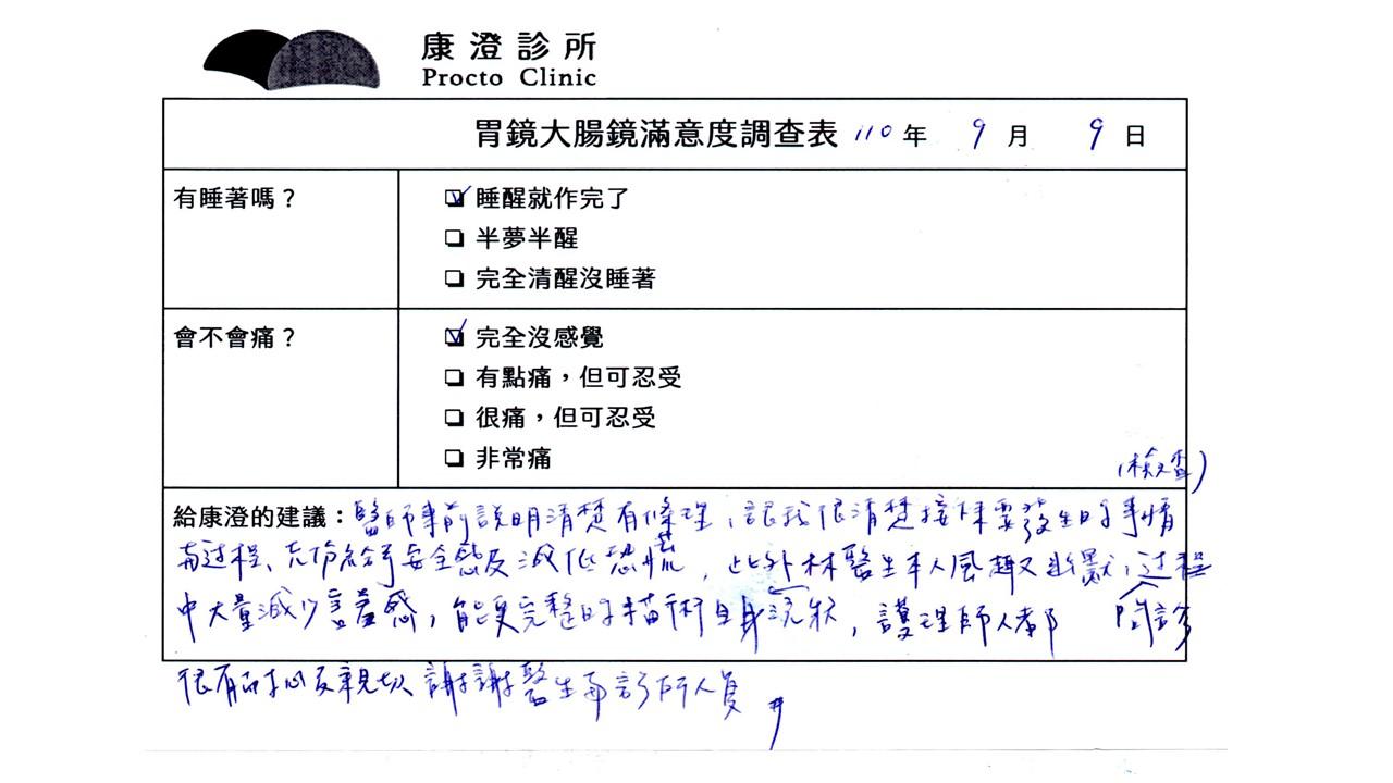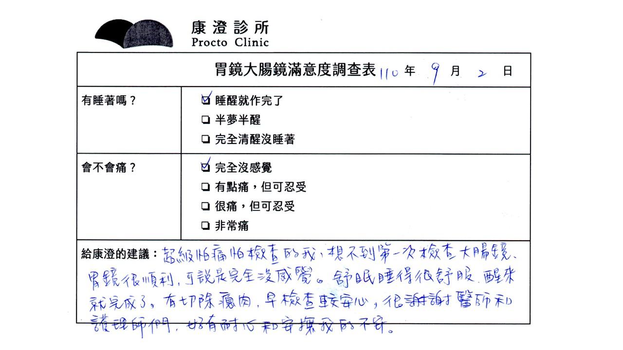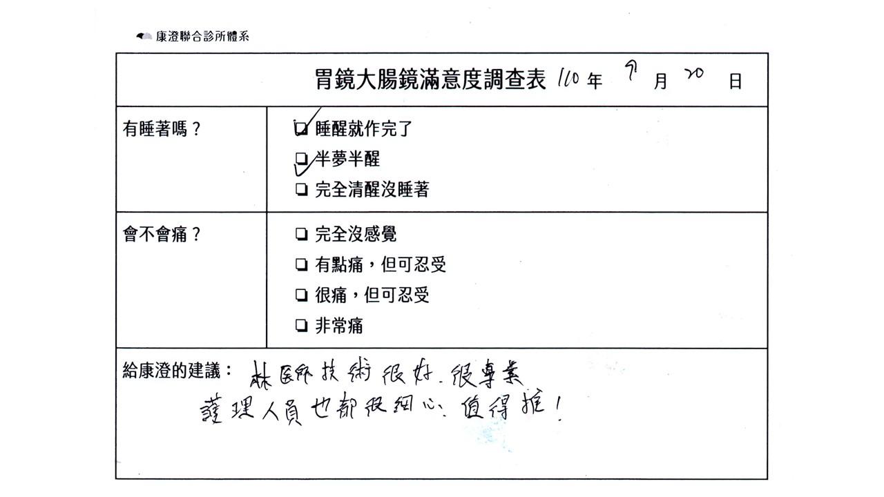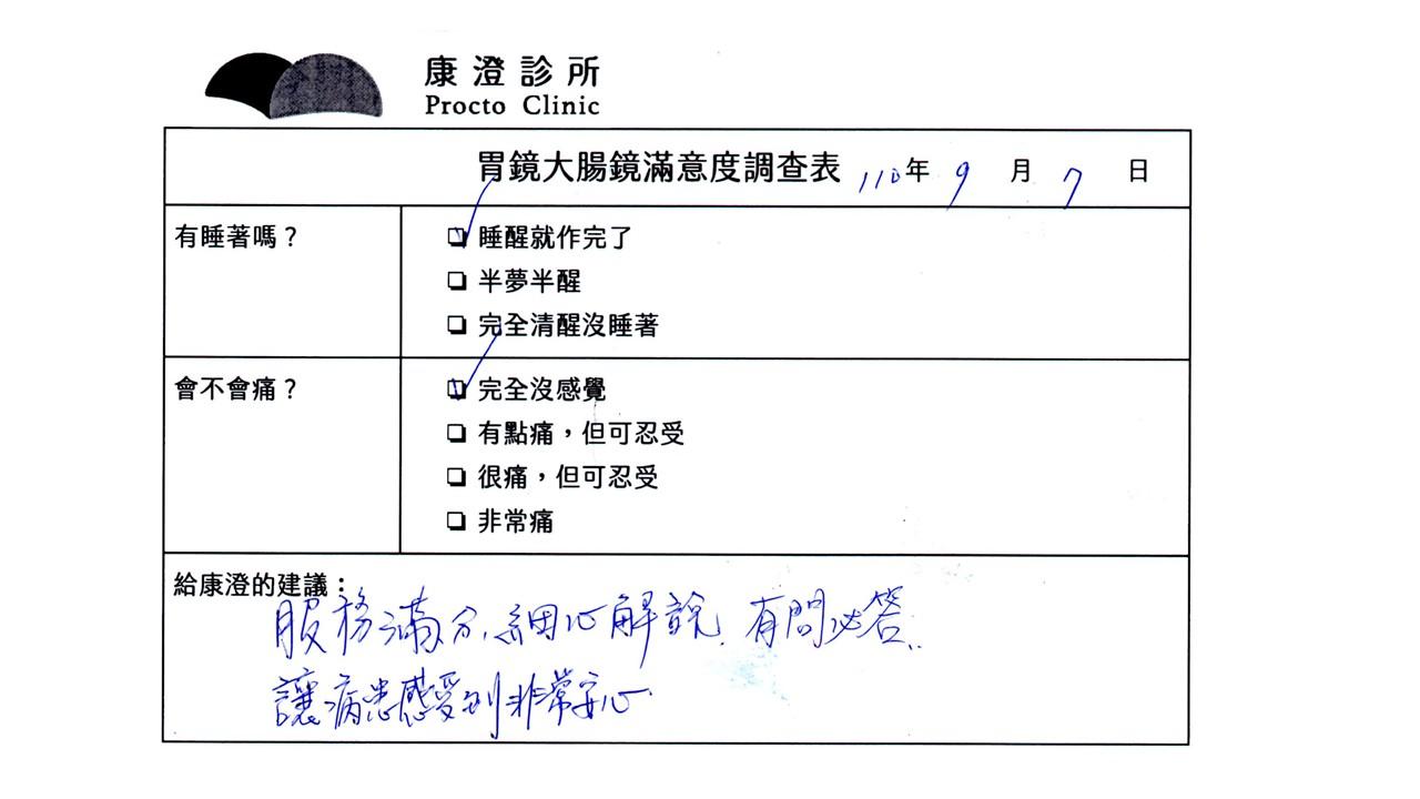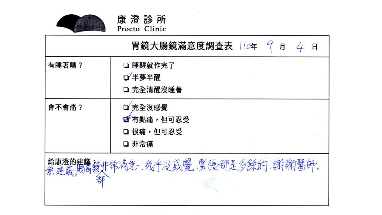 「定期穩定在櫃診所健檢,腸胃鏡的檢查醫療團隊及護理人員後續衛教的處理不輸醫院等級ㆍ專業丶舒適丶安心,整個療程無痛,護理人員親切可降低檢查的緊張感,非常感謝!」