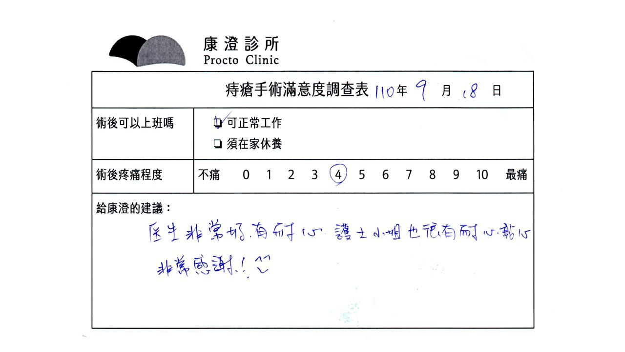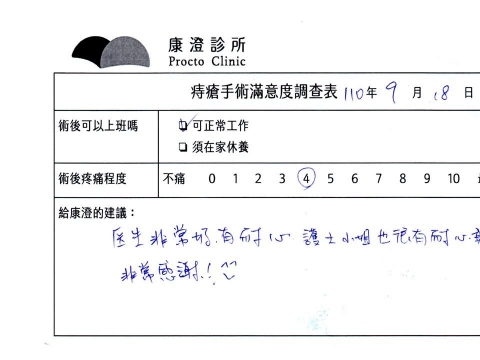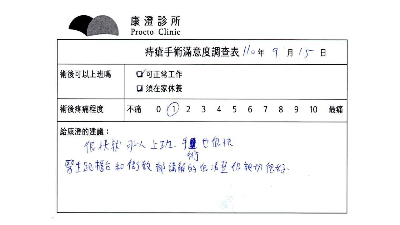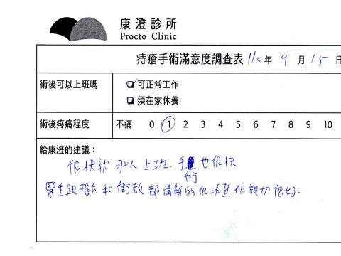 「困擾了20多年的三期內痔,終於在幾天內就解決了,原以為會很疼痛的手術及復原過程,結果真是神奇啊!不會痛呢!長效針應該是有用的,前幾天主要是腫脹,感謝林醫師,以及術後時時電話關心的小護士們,很棒!」