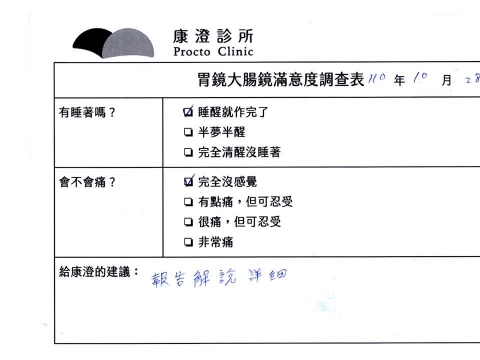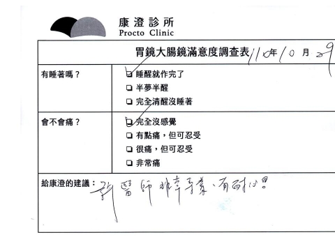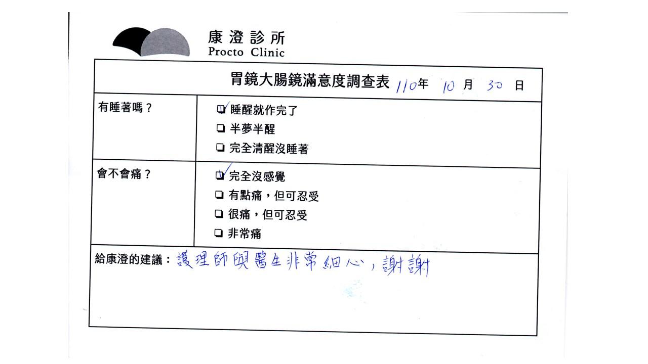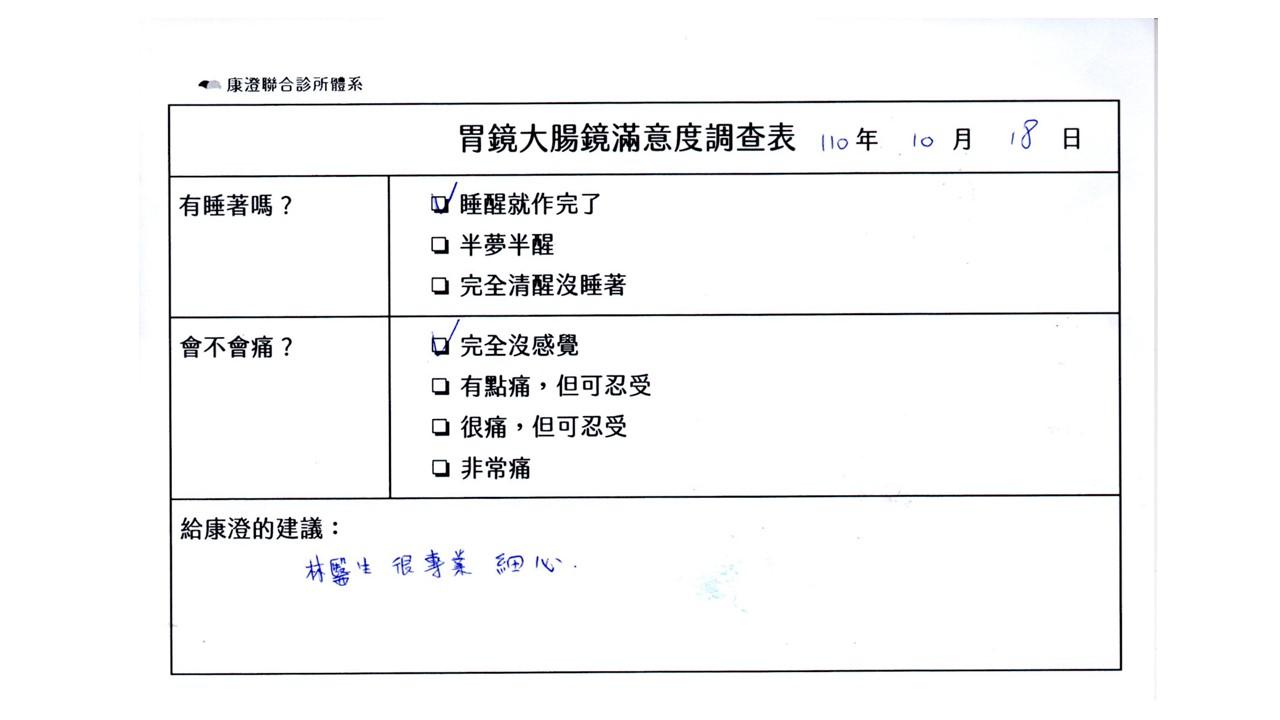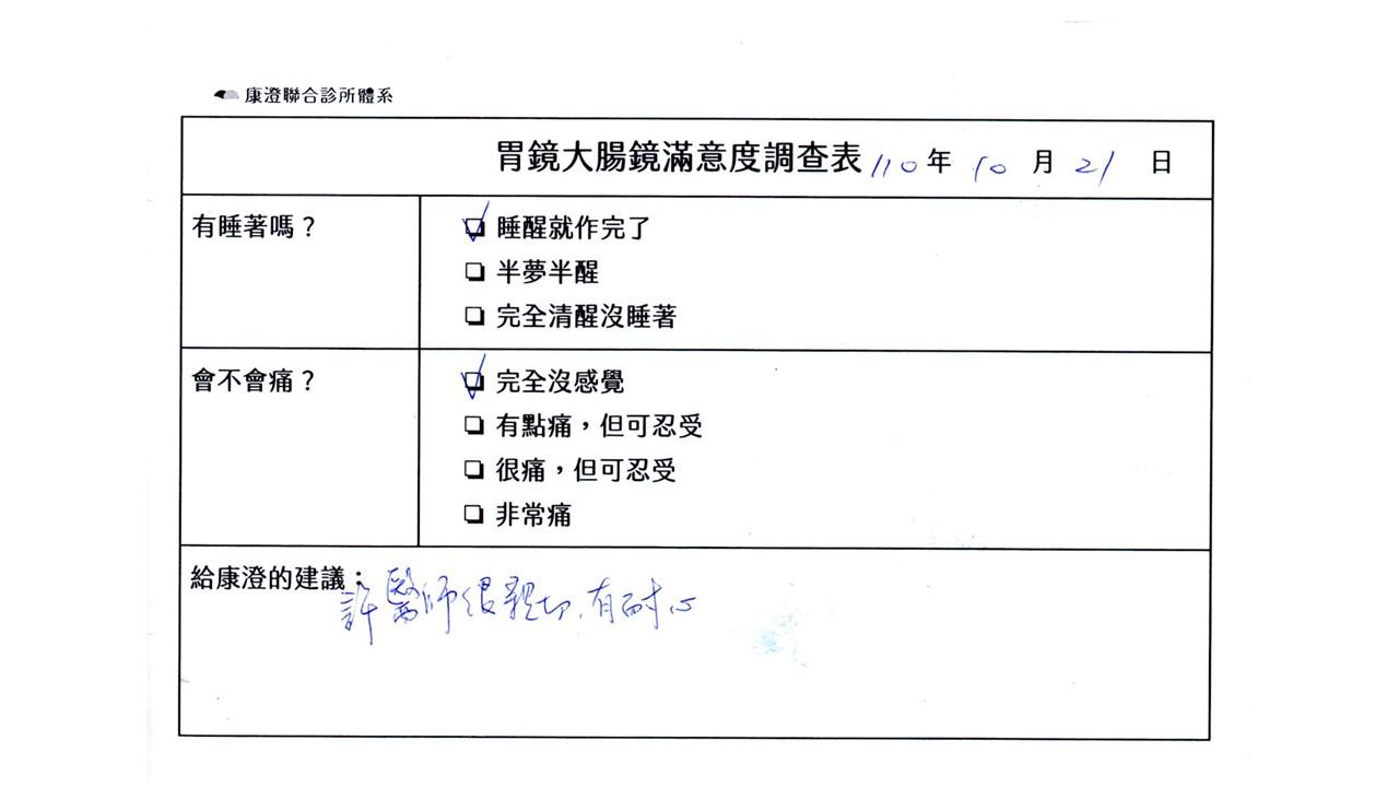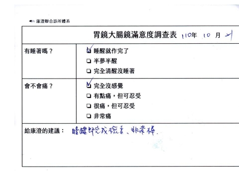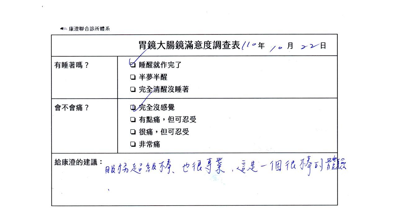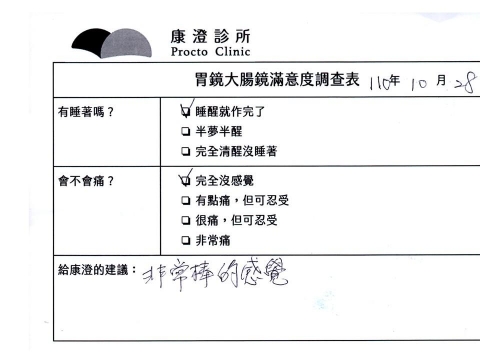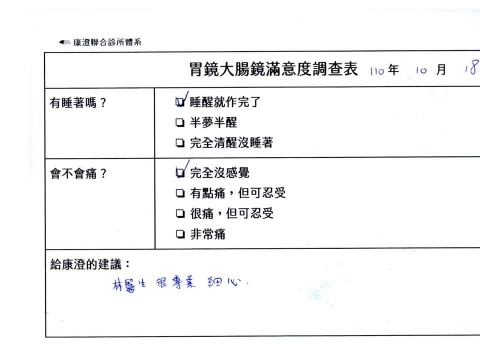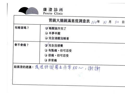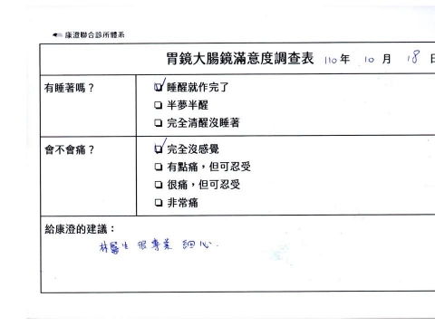 「定期穩定在櫃診所健檢,腸胃鏡的檢查醫療團隊及護理人員後續衛教的處理不輸醫院等級ㆍ專業丶舒適丶安心,整個療程無痛,護理人員親切可降低檢查的緊張感,非常感謝!」