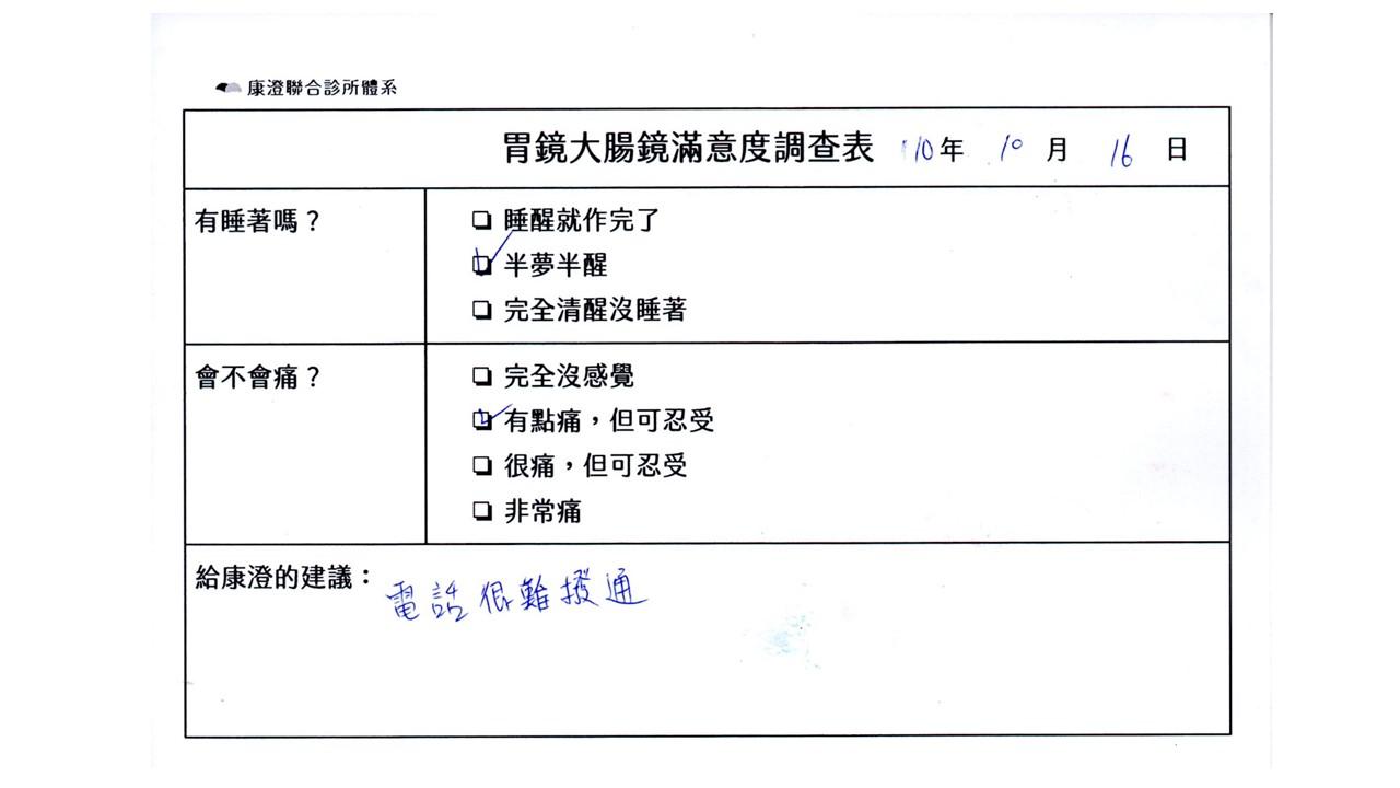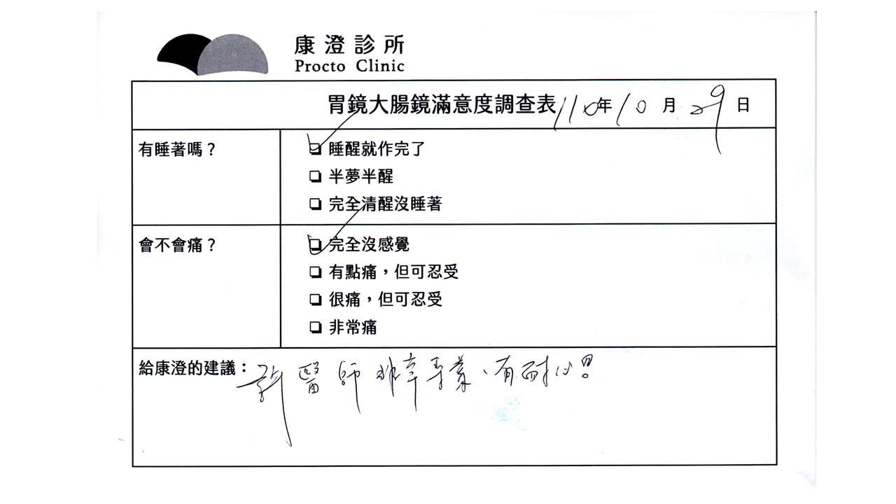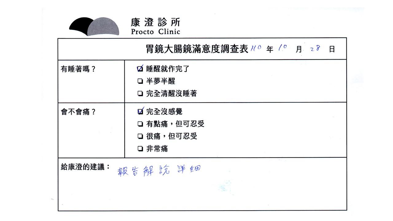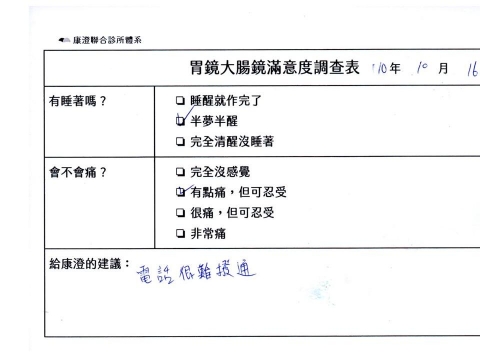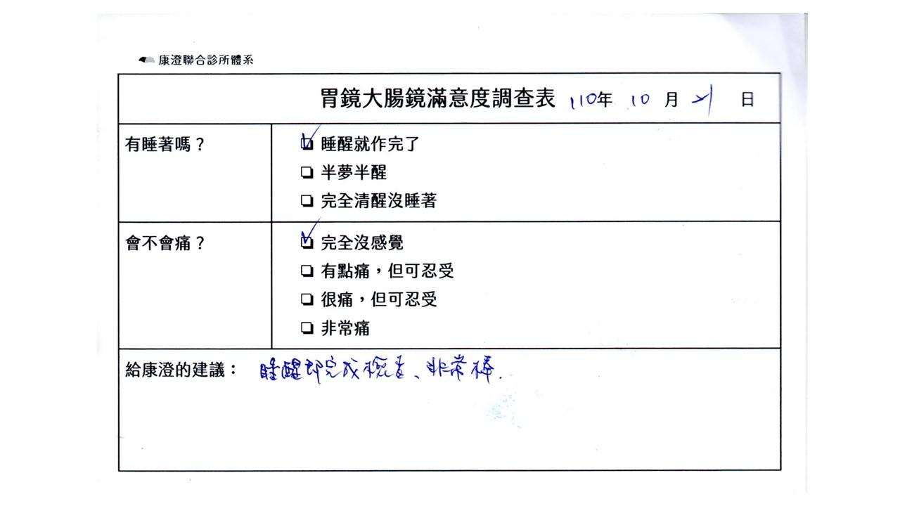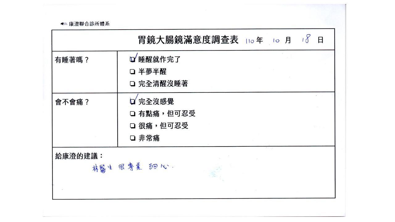 「定期穩定在櫃診所健檢,腸胃鏡的檢查醫療團隊及護理人員後續衛教的處理不輸醫院等級ㆍ專業丶舒適丶安心,整個療程無痛,護理人員親切可降低檢查的緊張感,非常感謝!」