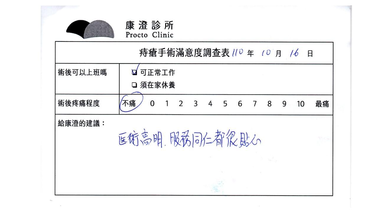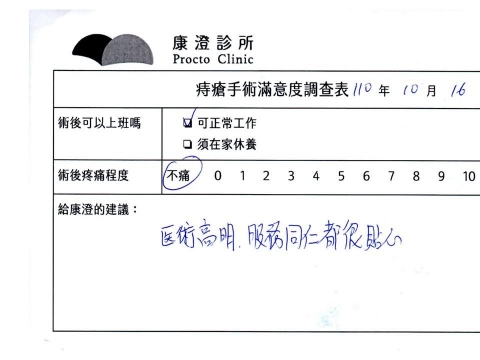 「困擾了20多年的三期內痔,終於在幾天內就解決了,原以為會很疼痛的手術及復原過程,結果真是神奇啊!不會痛呢!長效針應該是有用的,前幾天主要是腫脹,感謝林醫師,以及術後時時電話關心的小護士們,很棒!」