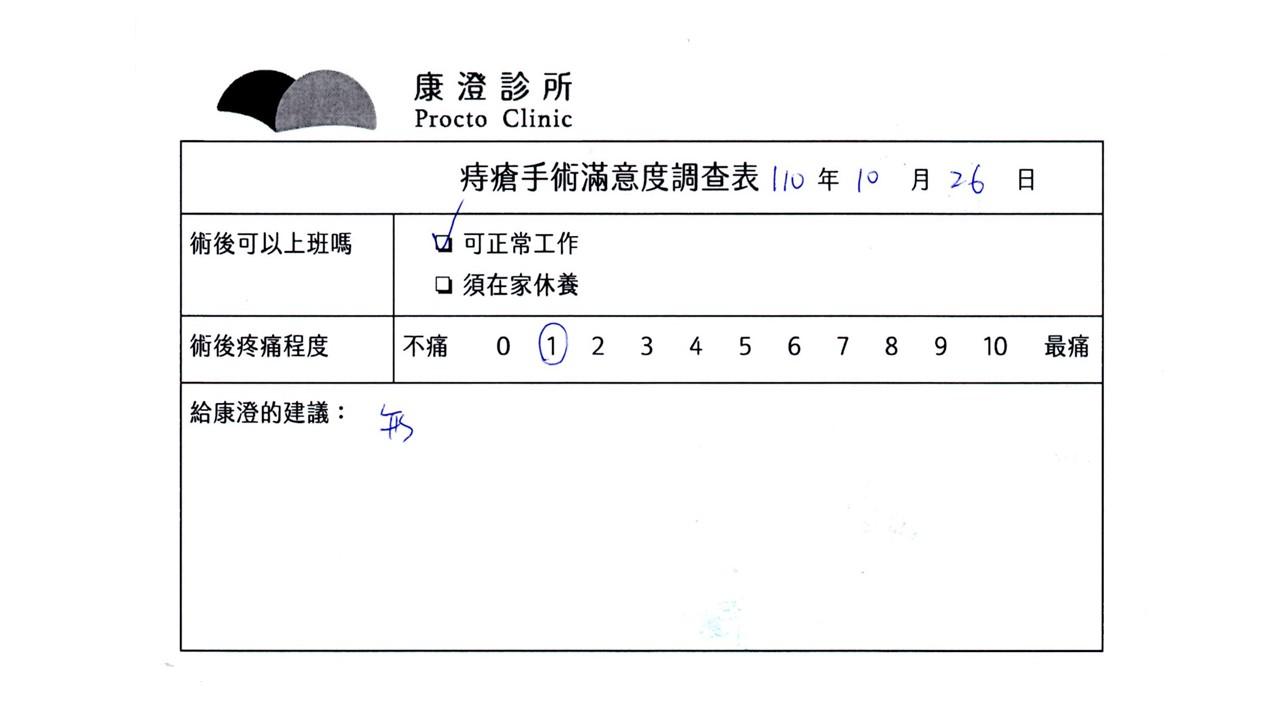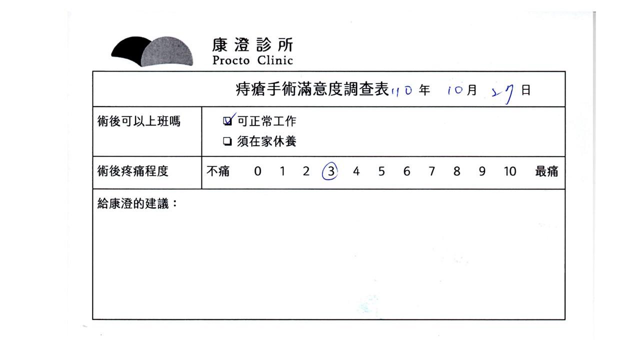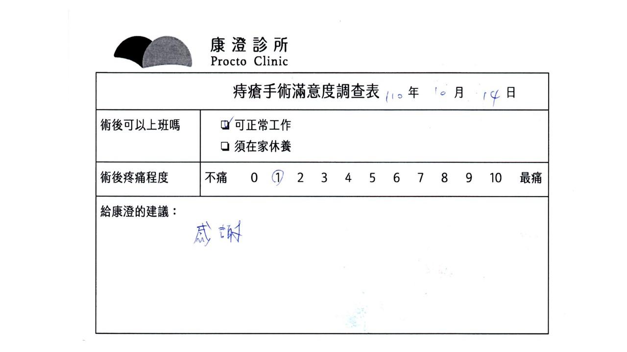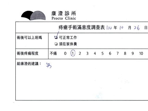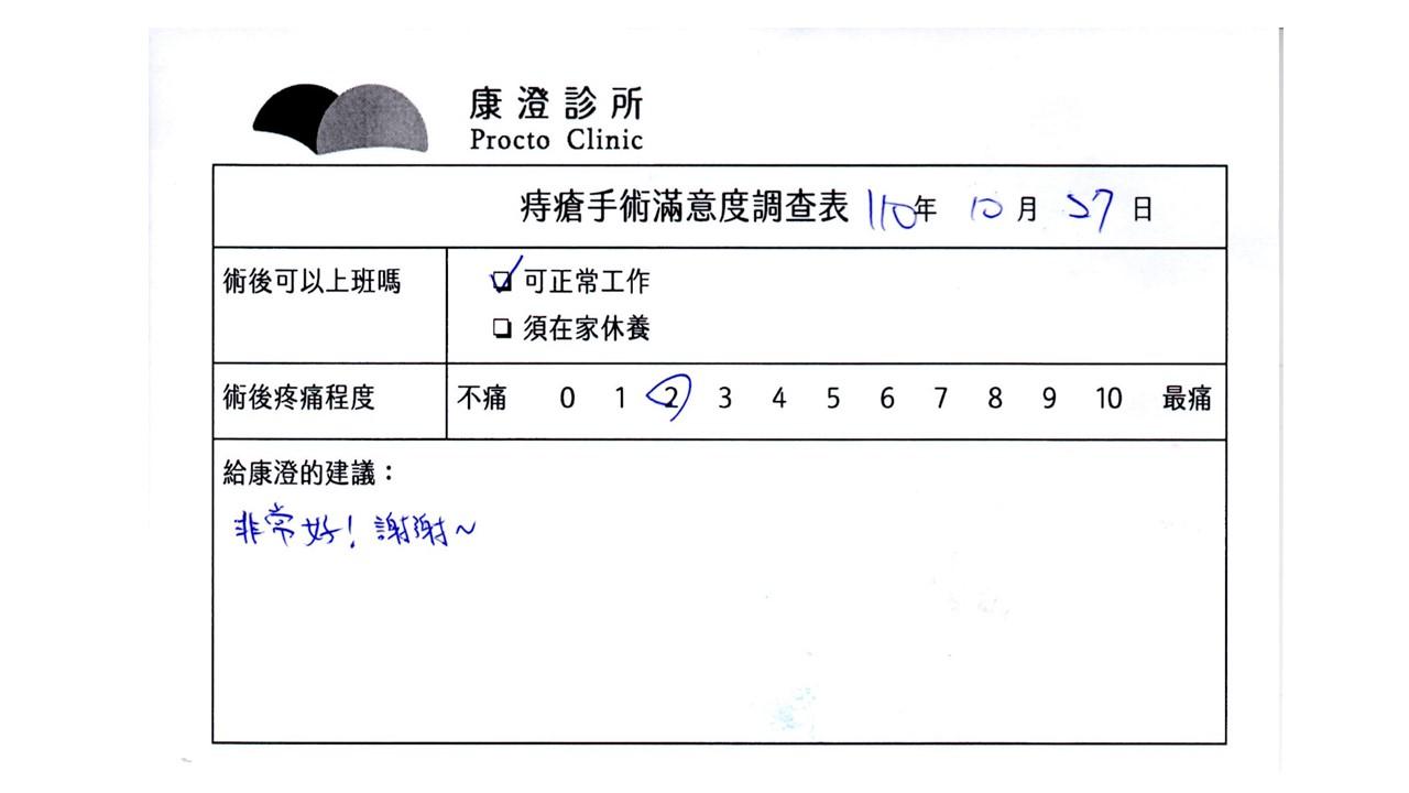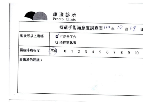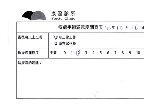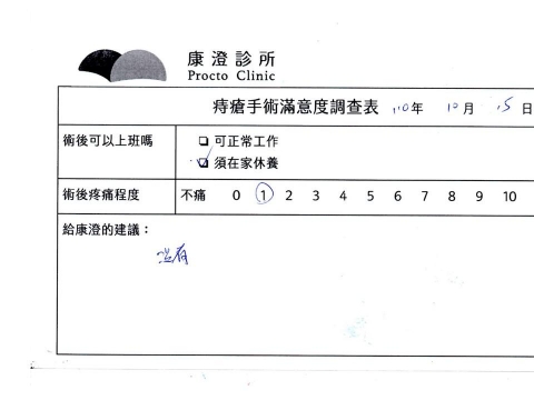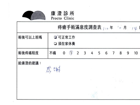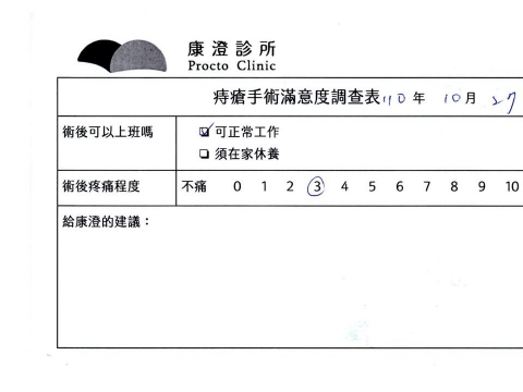 「困擾了20多年的三期內痔,終於在幾天內就解決了,原以為會很疼痛的手術及復原過程,結果真是神奇啊!不會痛呢!長效針應該是有用的,前幾天主要是腫脹,感謝林醫師,以及術後時時電話關心的小護士們,很棒!」