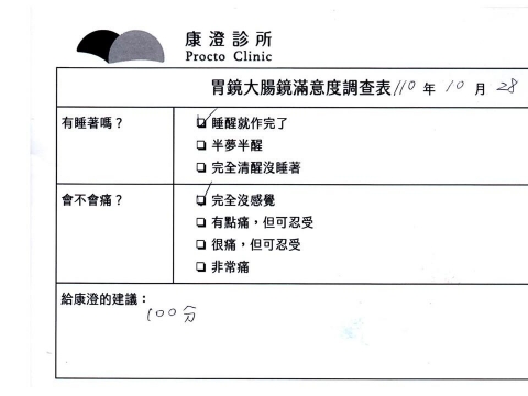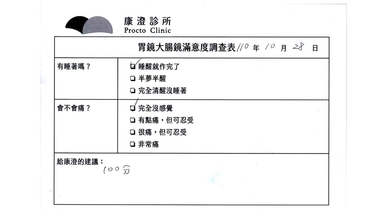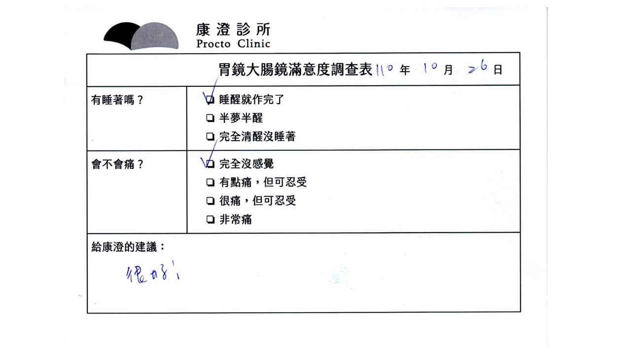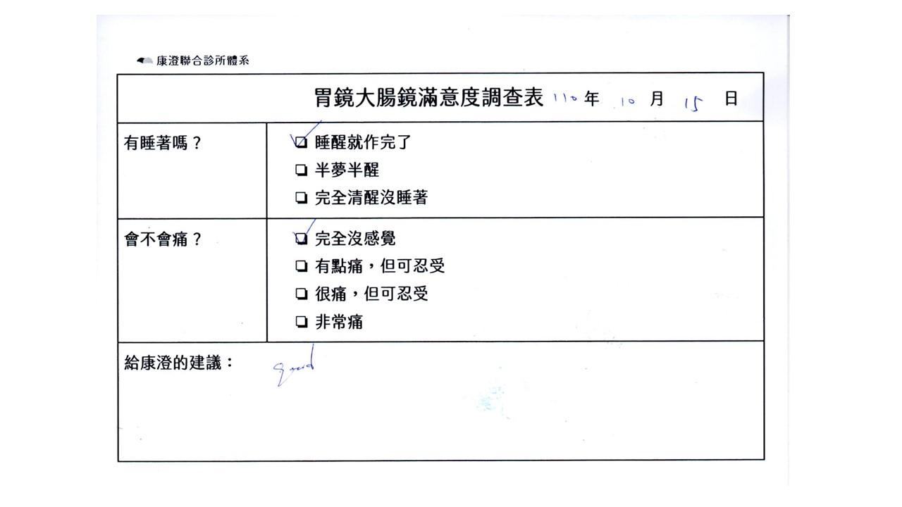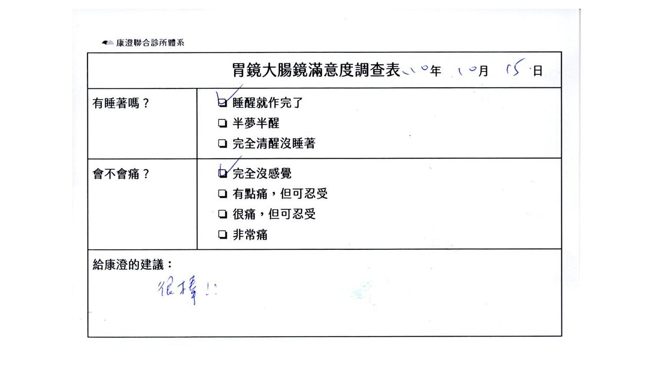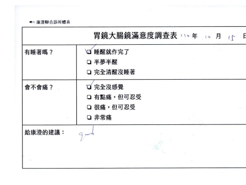 「定期穩定在櫃診所健檢,腸胃鏡的檢查醫療團隊及護理人員後續衛教的處理不輸醫院等級ㆍ專業丶舒適丶安心,整個療程無痛,護理人員親切可降低檢查的緊張感,非常感謝!」