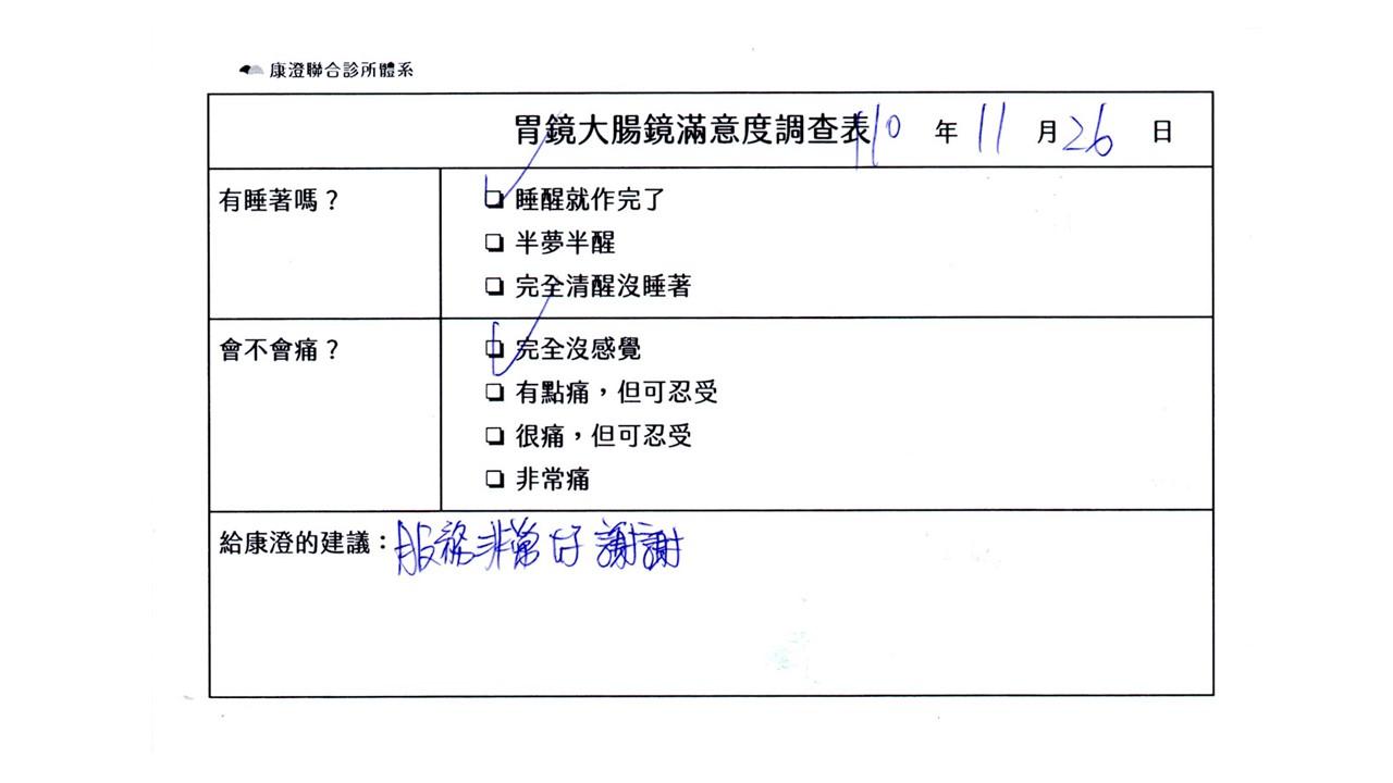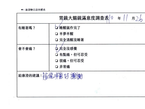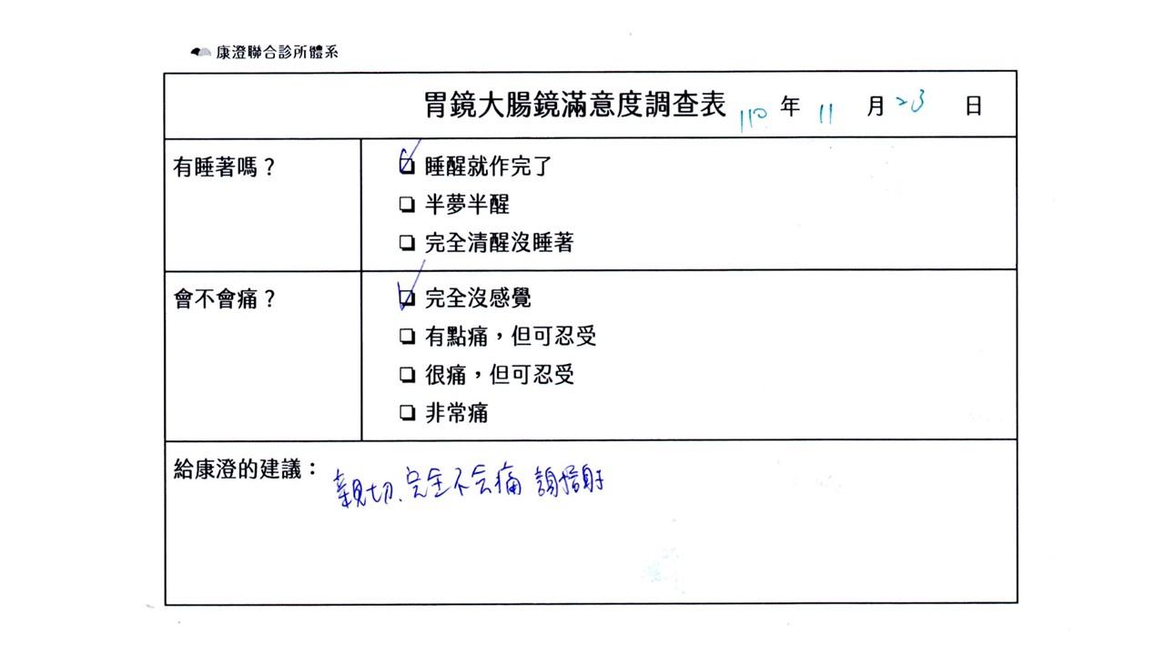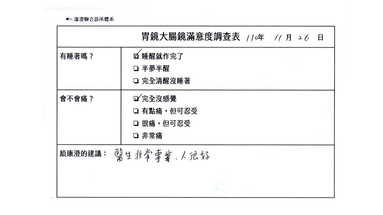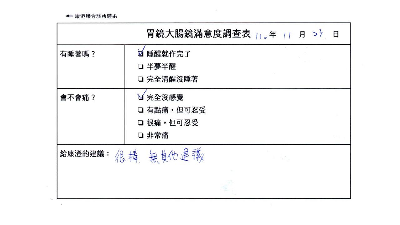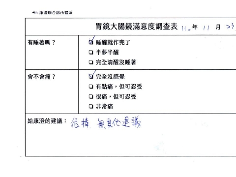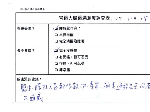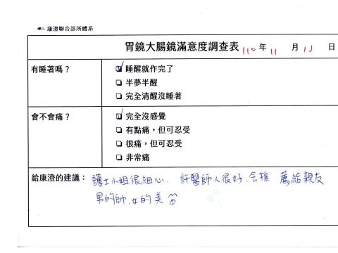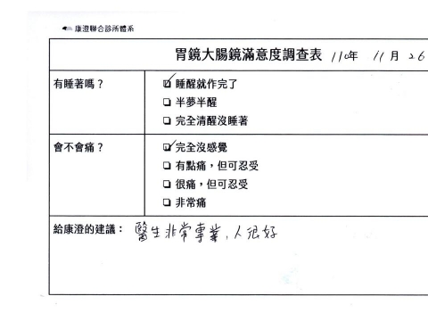 「定期穩定在櫃診所健檢,腸胃鏡的檢查醫療團隊及護理人員後續衛教的處理不輸醫院等級ㆍ專業丶舒適丶安心,整個療程無痛,護理人員親切可降低檢查的緊張感,非常感謝!」