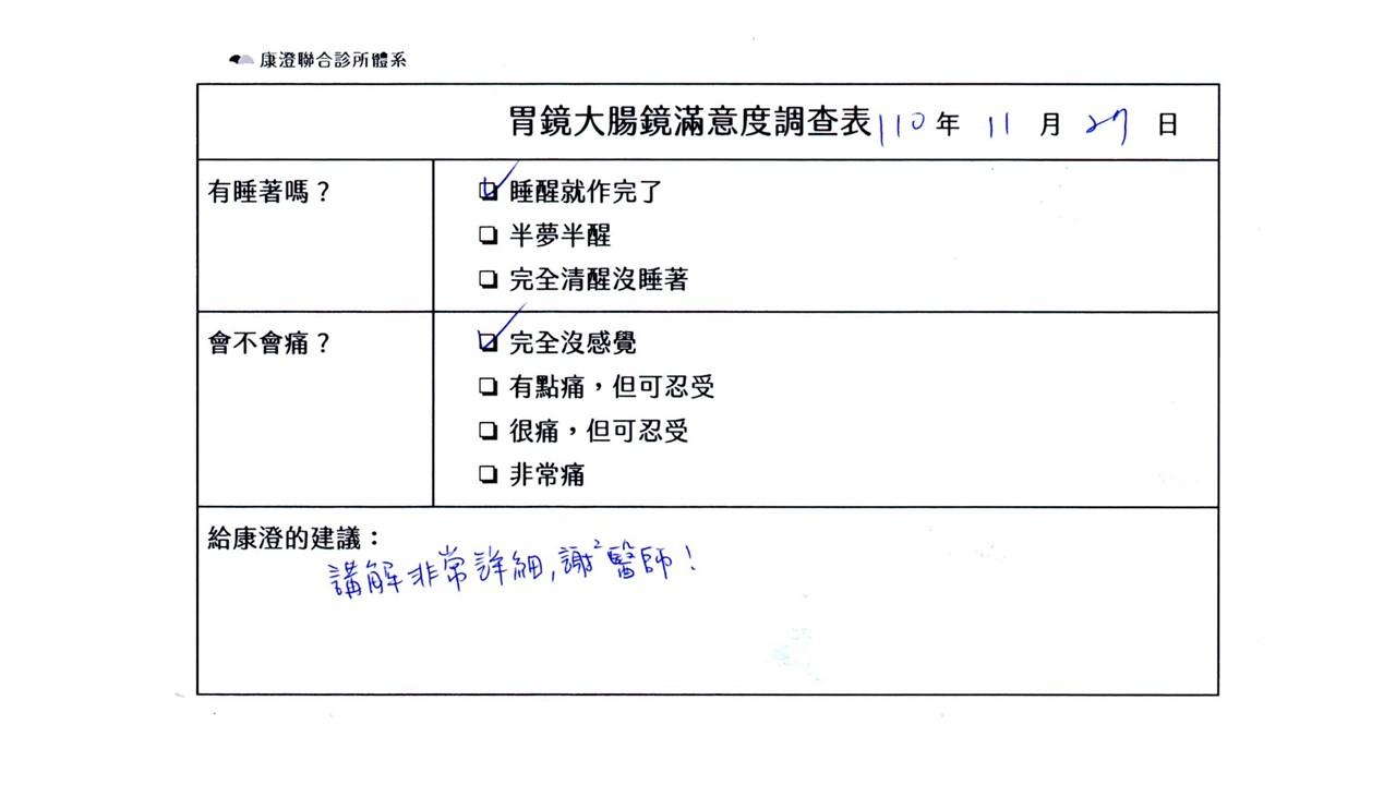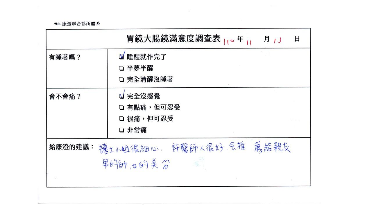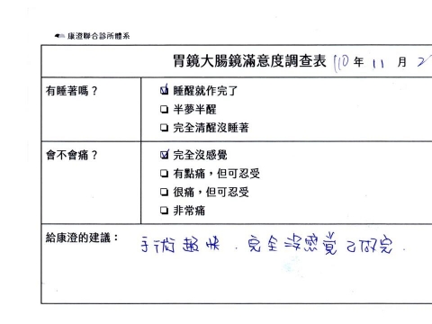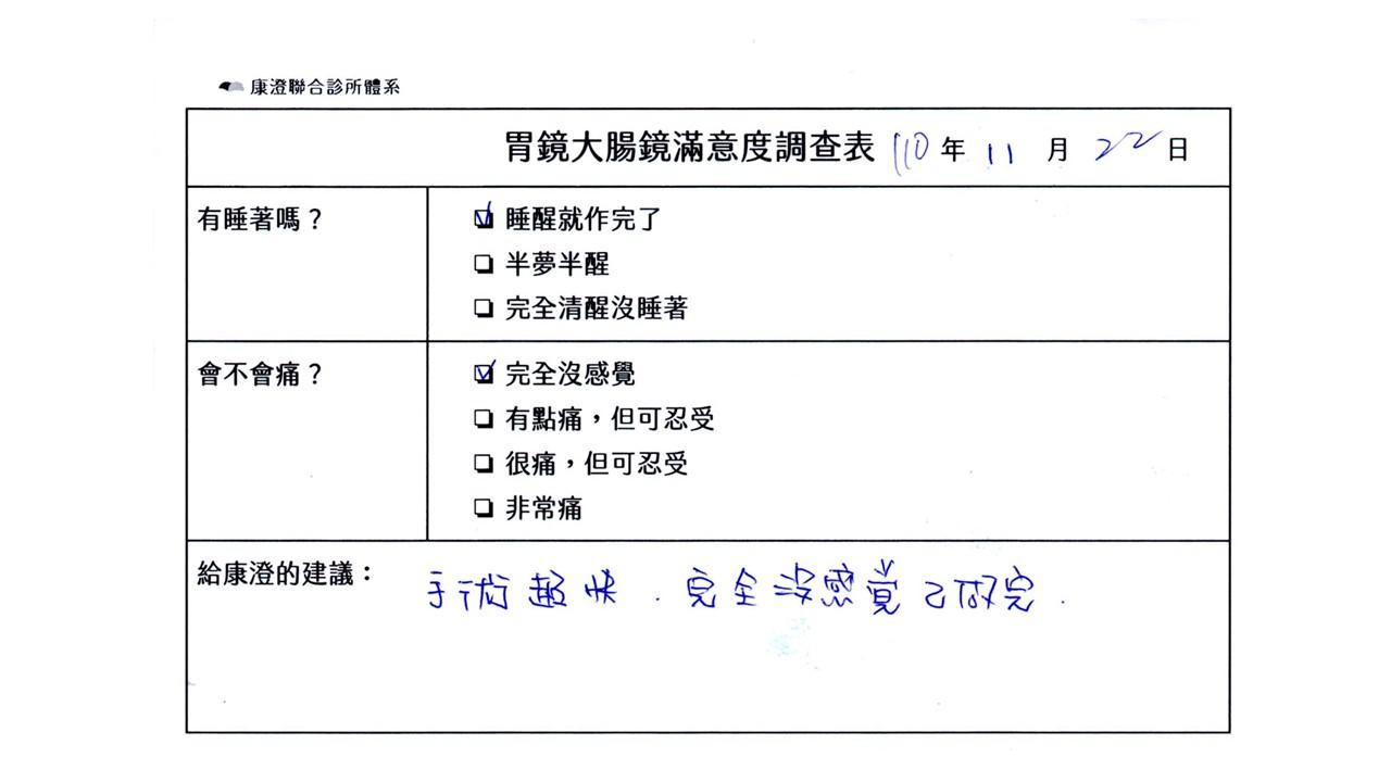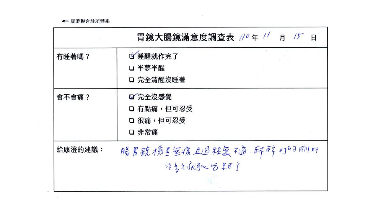 「定期穩定在櫃診所健檢,腸胃鏡的檢查醫療團隊及護理人員後續衛教的處理不輸醫院等級ㆍ專業丶舒適丶安心,整個療程無痛,護理人員親切可降低檢查的緊張感,非常感謝!」
