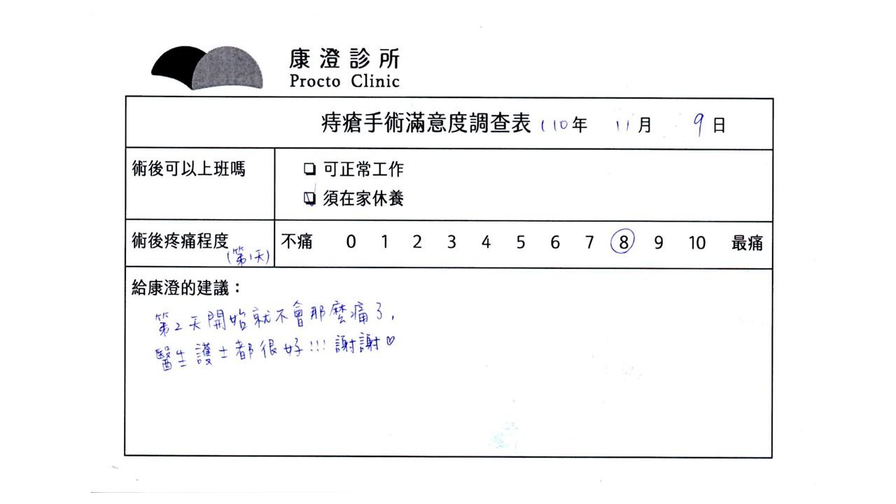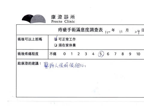 「困擾了20多年的三期內痔,終於在幾天內就解決了,原以為會很疼痛的手術及復原過程,結果真是神奇啊!不會痛呢!長效針應該是有用的,前幾天主要是腫脹,感謝林醫師,以及術後時時電話關心的小護士們,很棒!」