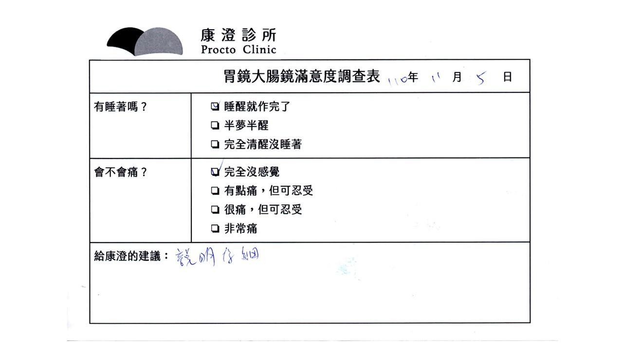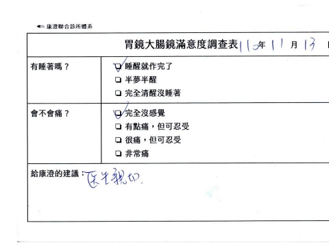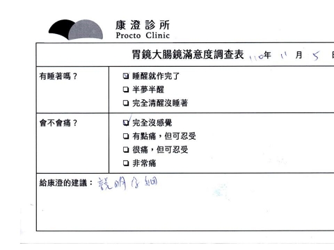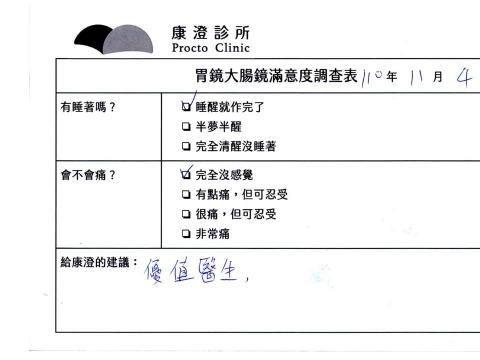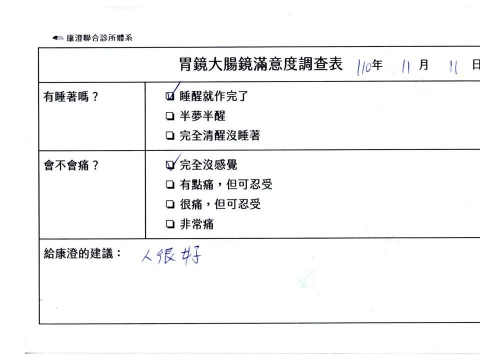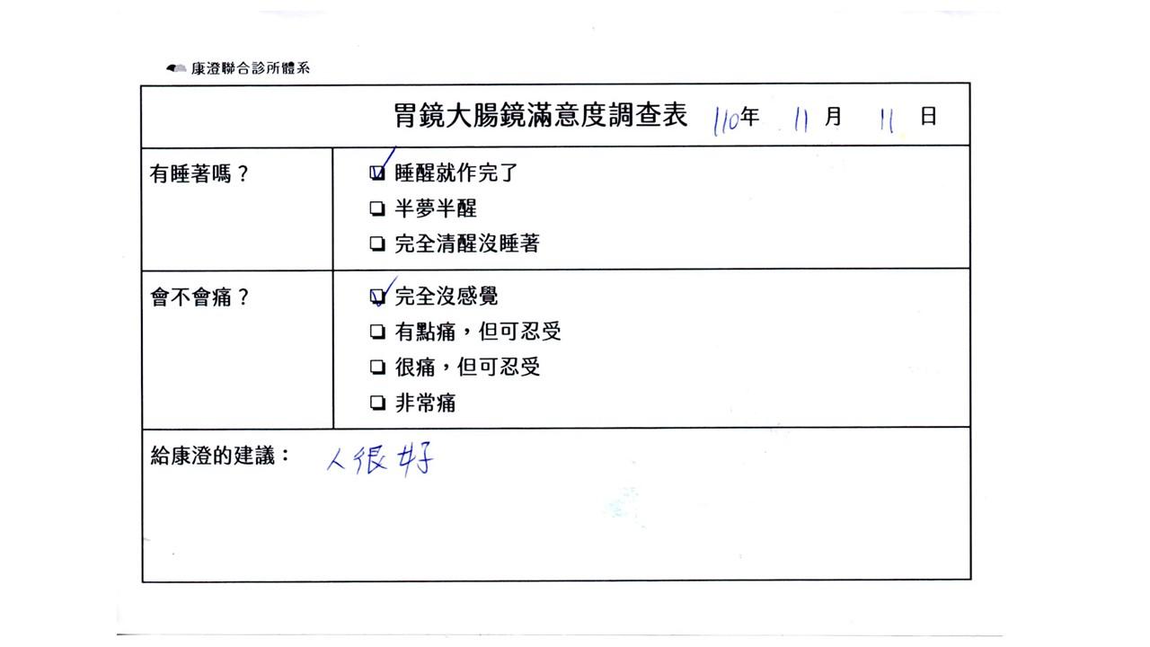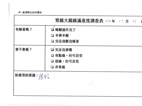 「定期穩定在櫃診所健檢,腸胃鏡的檢查醫療團隊及護理人員後續衛教的處理不輸醫院等級ㆍ專業丶舒適丶安心,整個療程無痛,護理人員親切可降低檢查的緊張感,非常感謝!」
