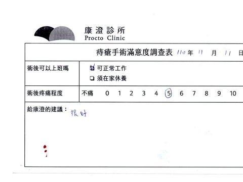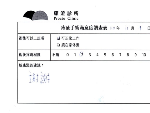 「困擾了20多年的三期內痔,終於在幾天內就解決了,原以為會很疼痛的手術及復原過程,結果真是神奇啊!不會痛呢!長效針應該是有用的,前幾天主要是腫脹,感謝林醫師,以及術後時時電話關心的小護士們,很棒!」