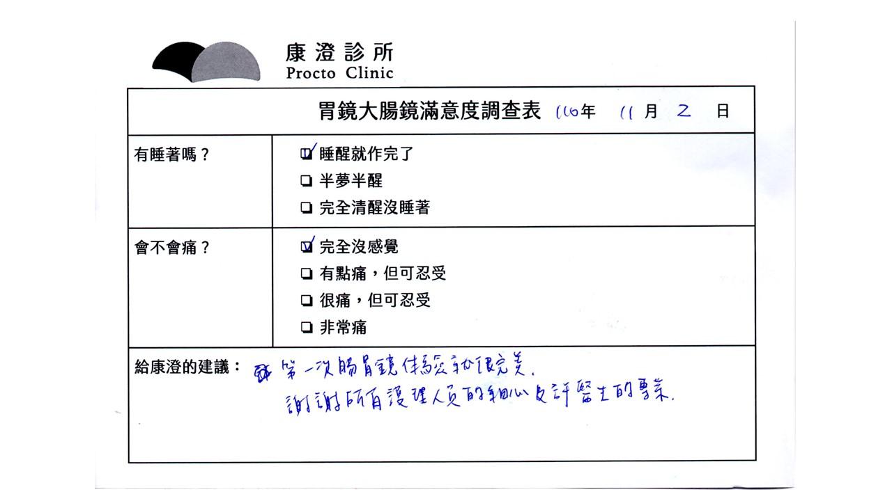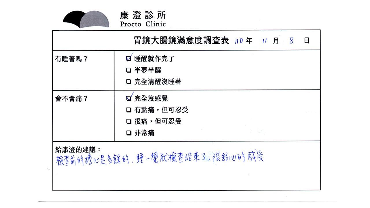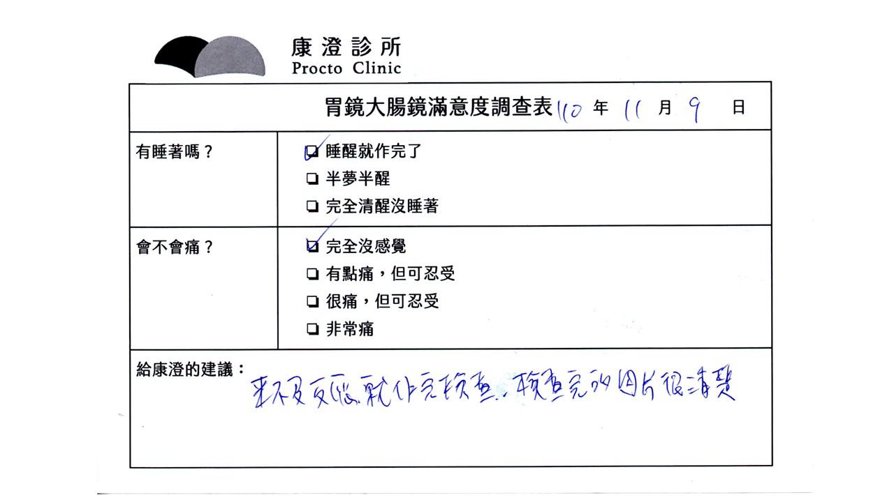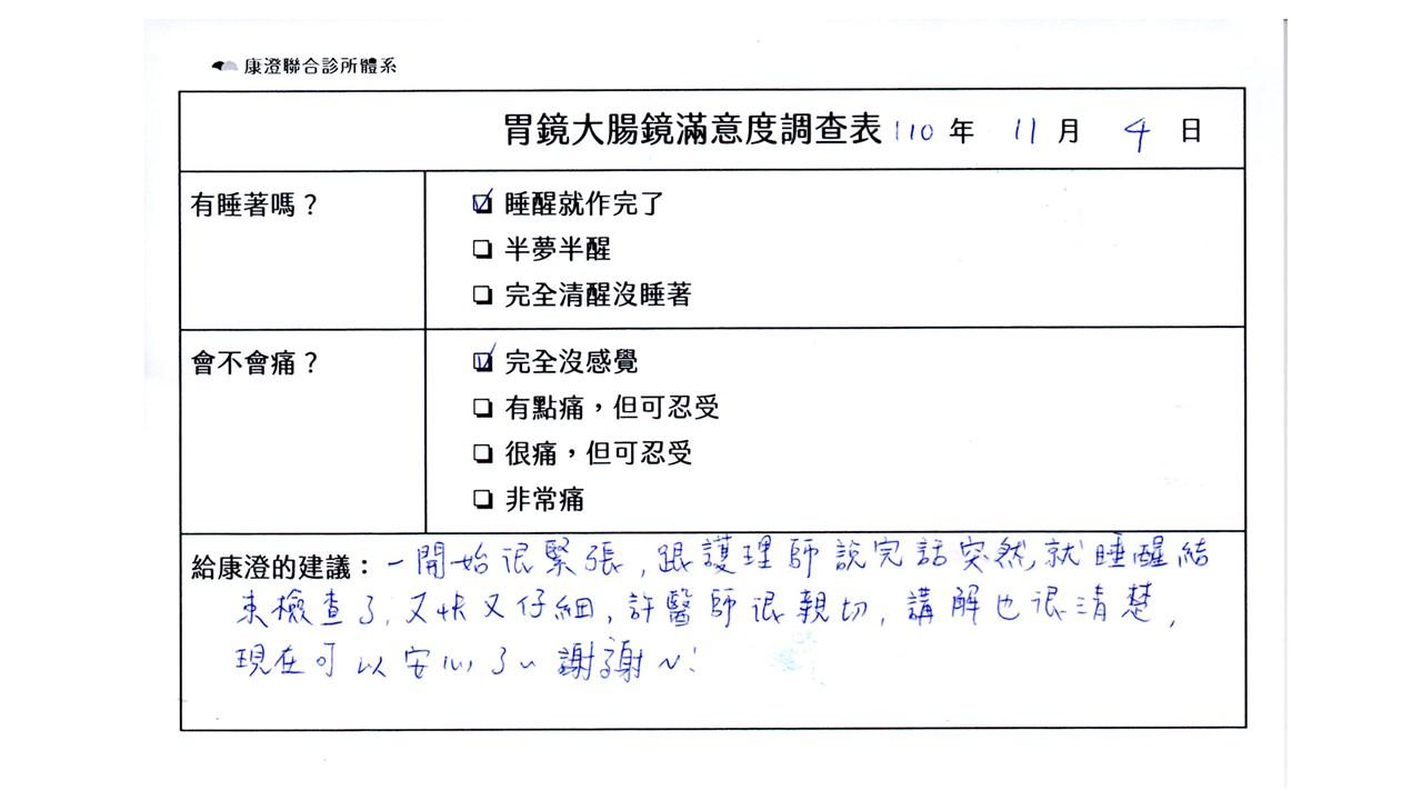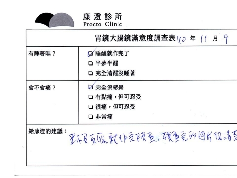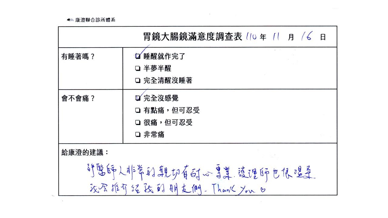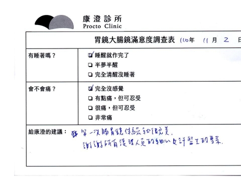 「定期穩定在櫃診所健檢,腸胃鏡的檢查醫療團隊及護理人員後續衛教的處理不輸醫院等級ㆍ專業丶舒適丶安心,整個療程無痛,護理人員親切可降低檢查的緊張感,非常感謝!」