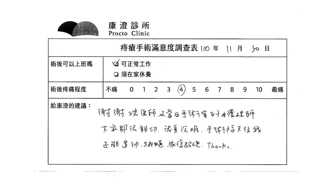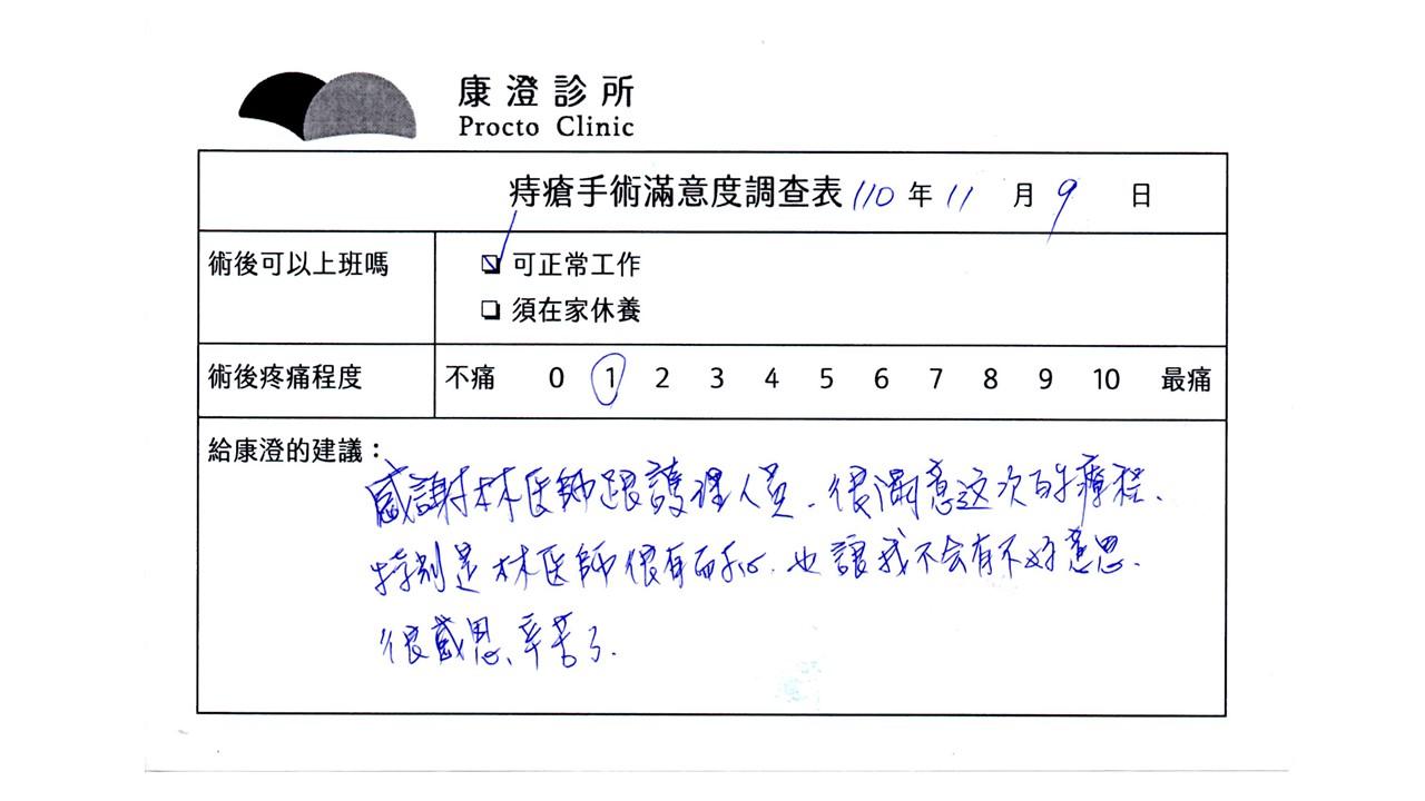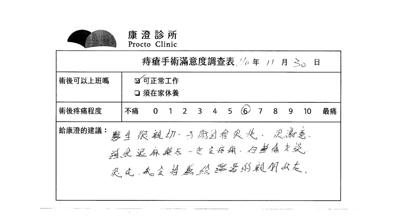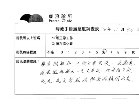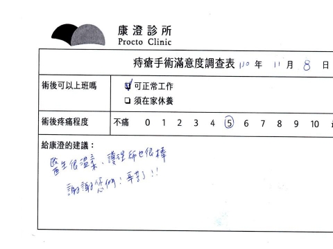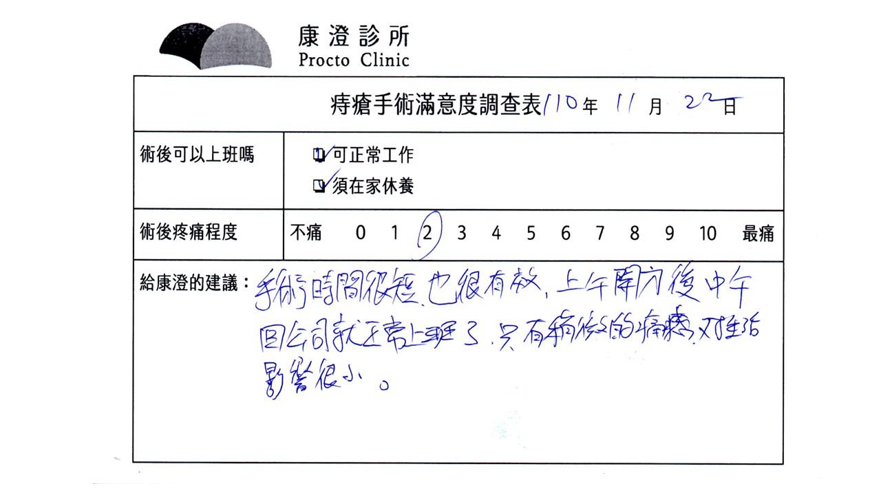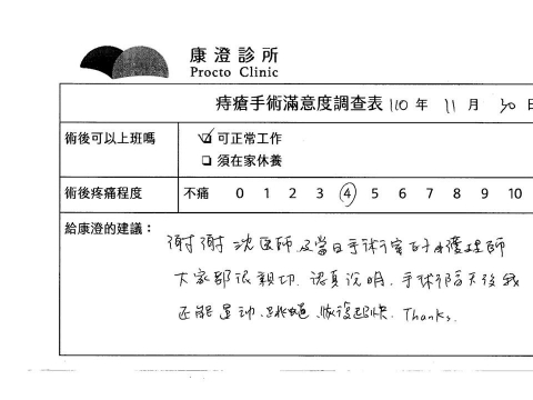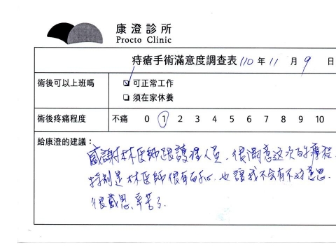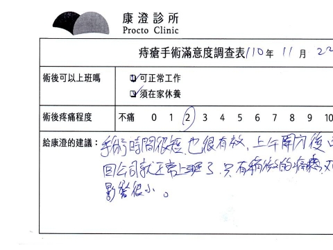 「困擾了20多年的三期內痔,終於在幾天內就解決了,原以為會很疼痛的手術及復原過程,結果真是神奇啊!不會痛呢!長效針應該是有用的,前幾天主要是腫脹,感謝林醫師,以及術後時時電話關心的小護士們,很棒!」
