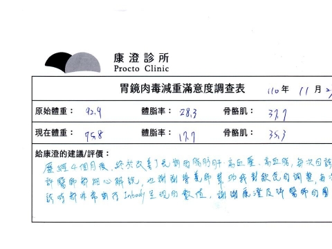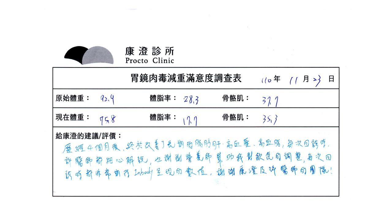 「很開心做了胃肉毒減重療程,讓我體會最幸福不挨餓的減肥方式!瘦了10%體重後,讓體態變美,最重要是身體變健康喔!感謝羅醫師及營養師的提醒及追蹤。」