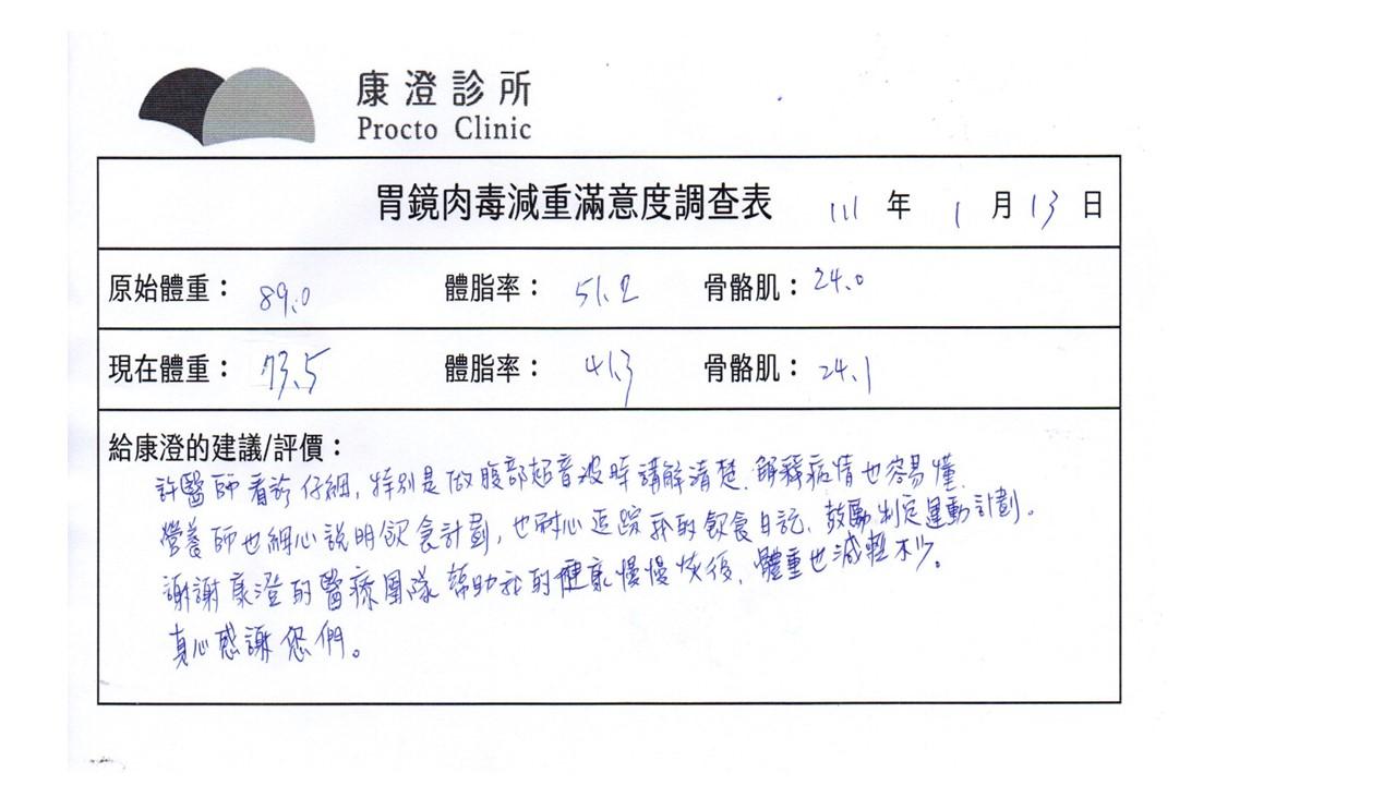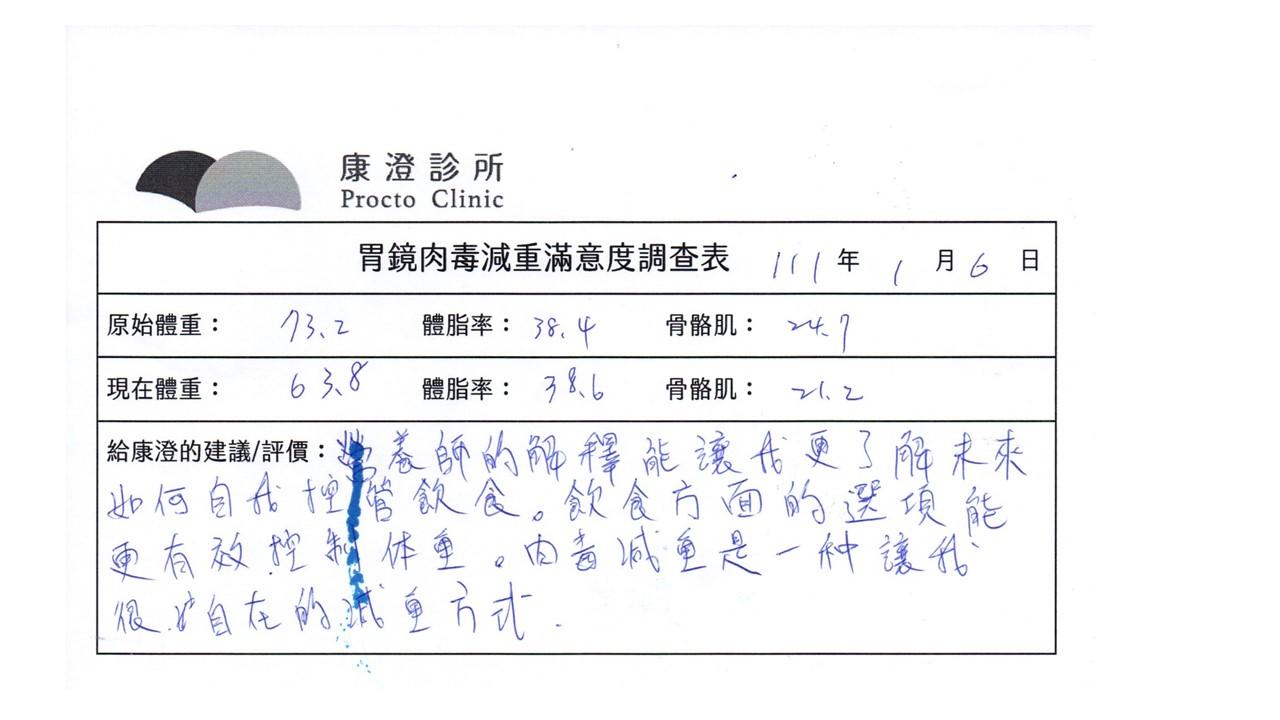 「很開心做了胃肉毒減重療程,讓我體會最幸福不挨餓的減肥方式!瘦了10%體重後,讓體態變美,最重要是身體變健康喔!感謝羅醫師及營養師的提醒及追蹤。」