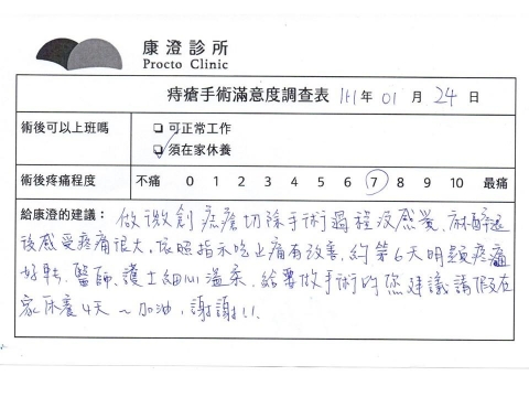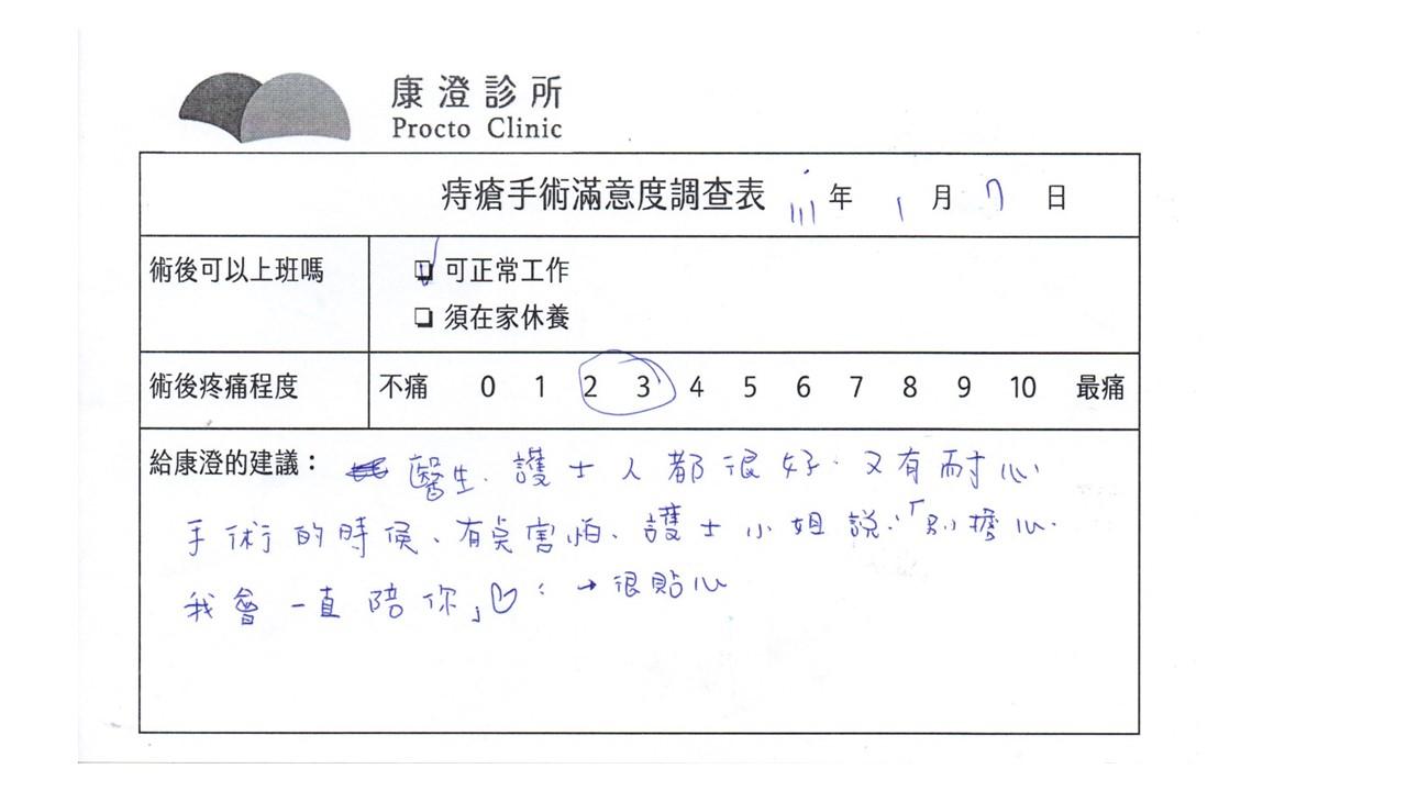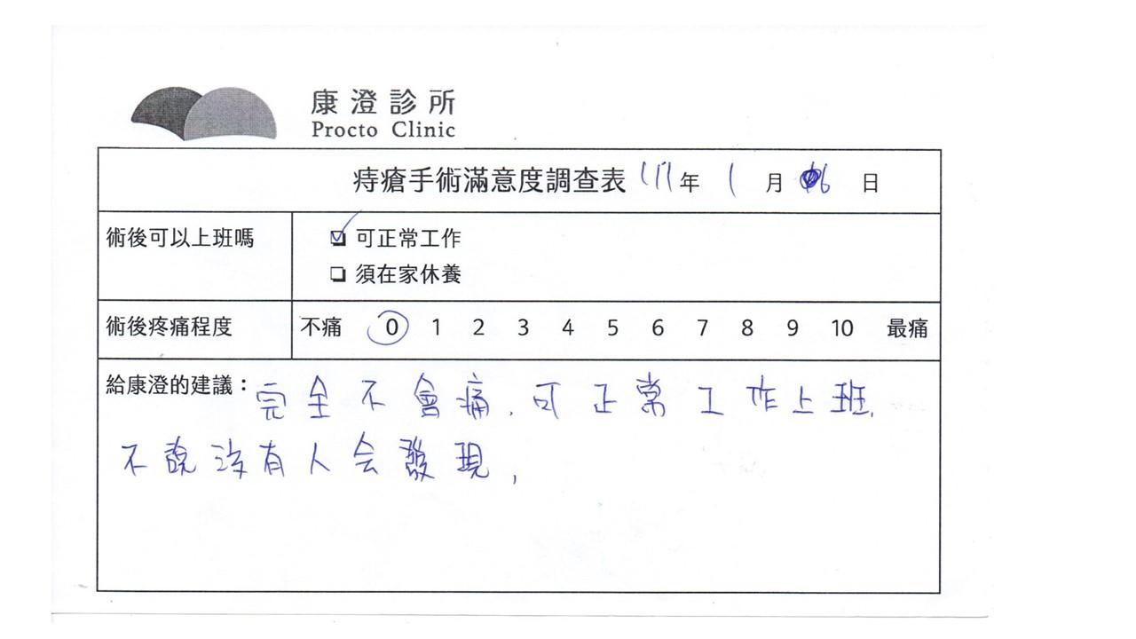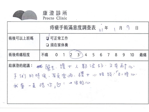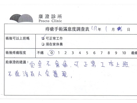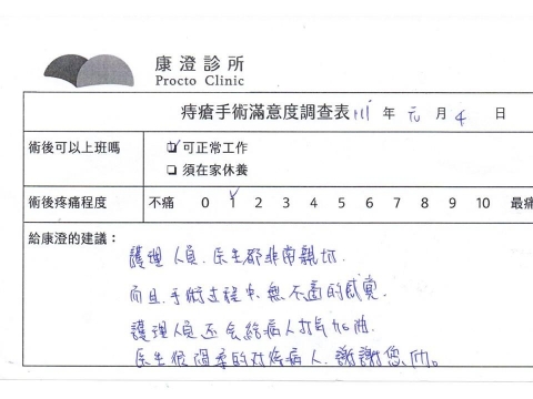 「困擾了20多年的三期內痔,終於在幾天內就解決了,原以為會很疼痛的手術及復原過程,結果真是神奇啊!不會痛呢!長效針應該是有用的,前幾天主要是腫脹,感謝林醫師,以及術後時時電話關心的小護士們,很棒!」
