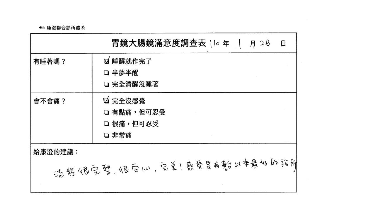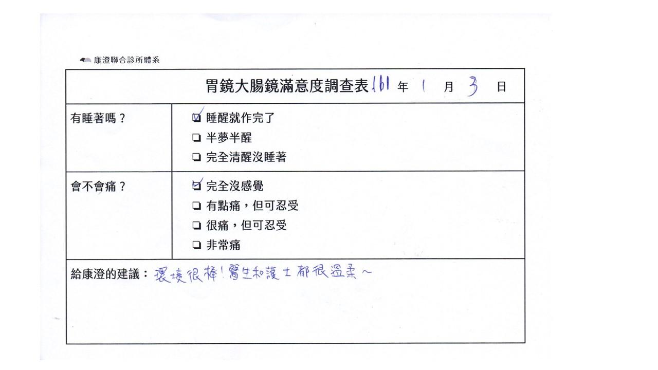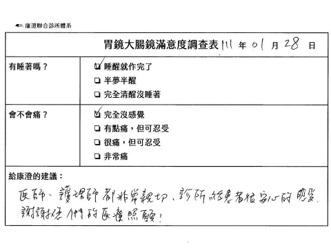 「定期穩定在櫃診所健檢,腸胃鏡的檢查醫療團隊及護理人員後續衛教的處理不輸醫院等級ㆍ專業丶舒適丶安心,整個療程無痛,護理人員親切可降低檢查的緊張感,非常感謝!」