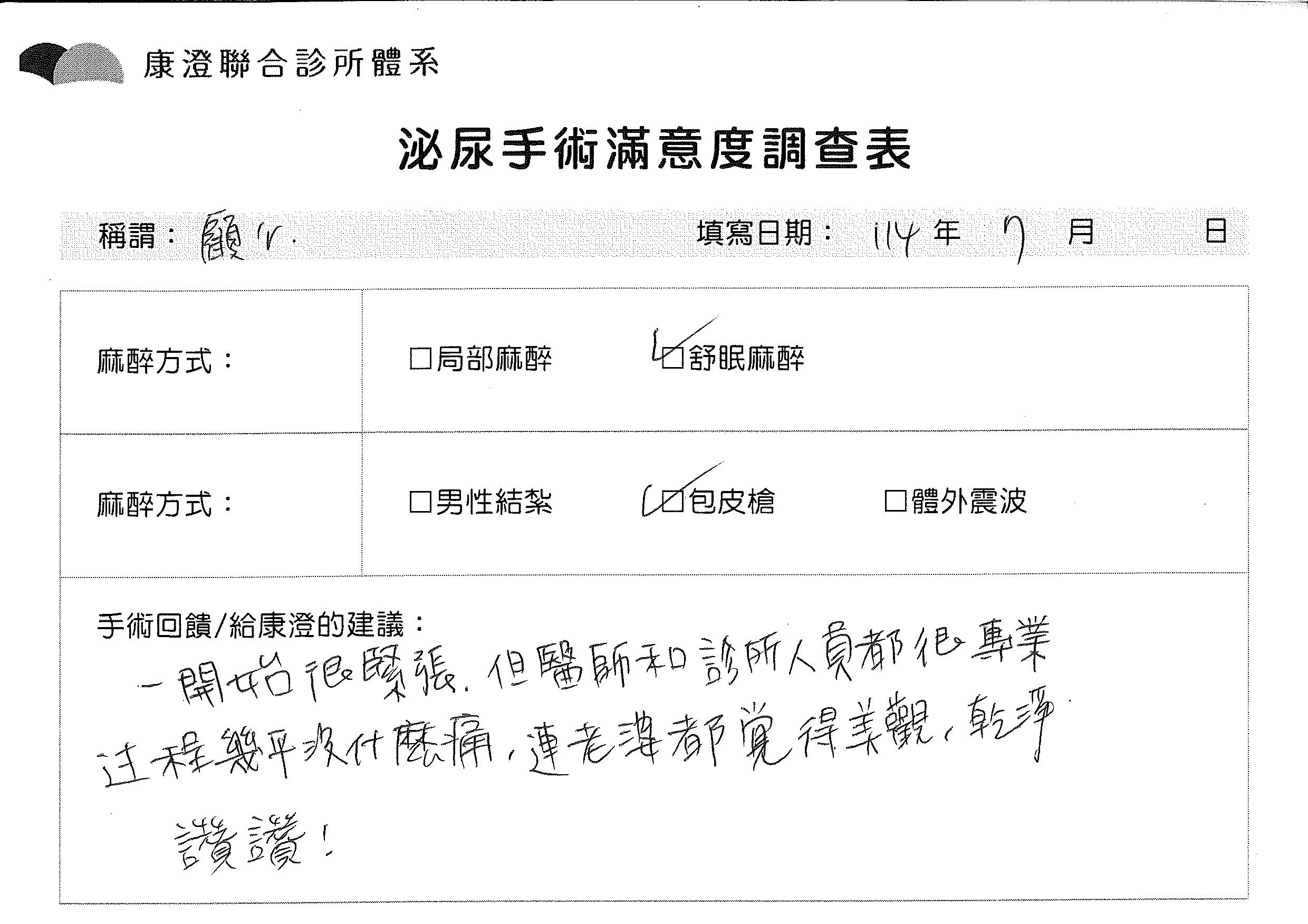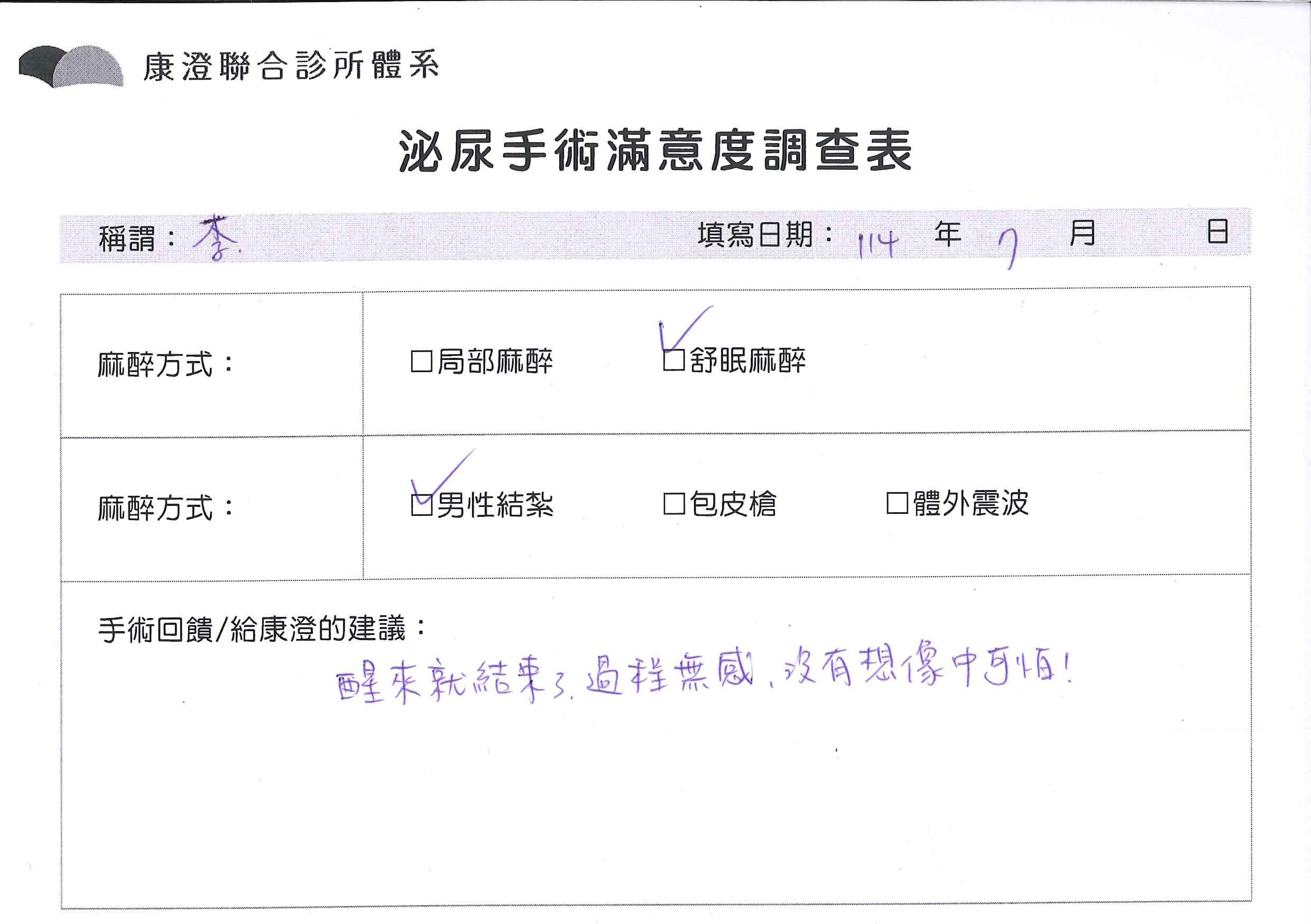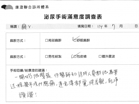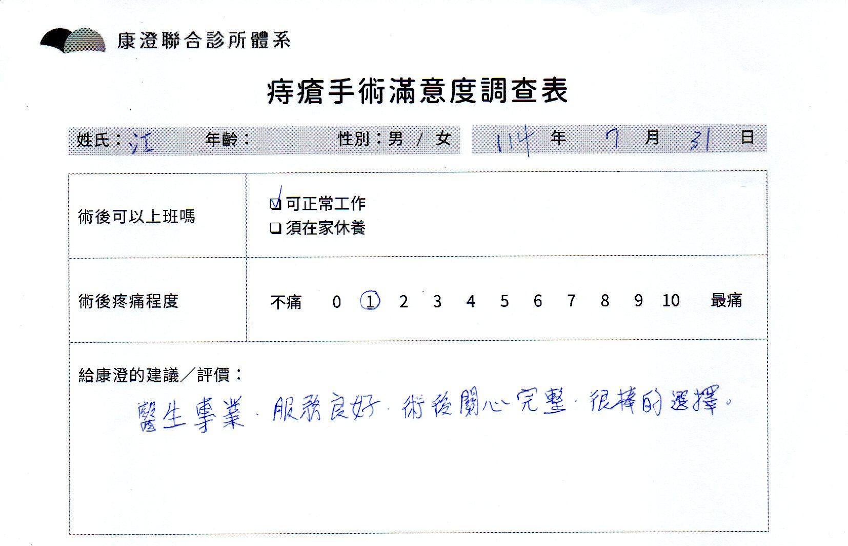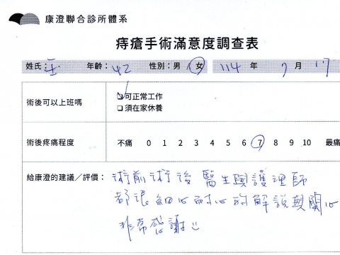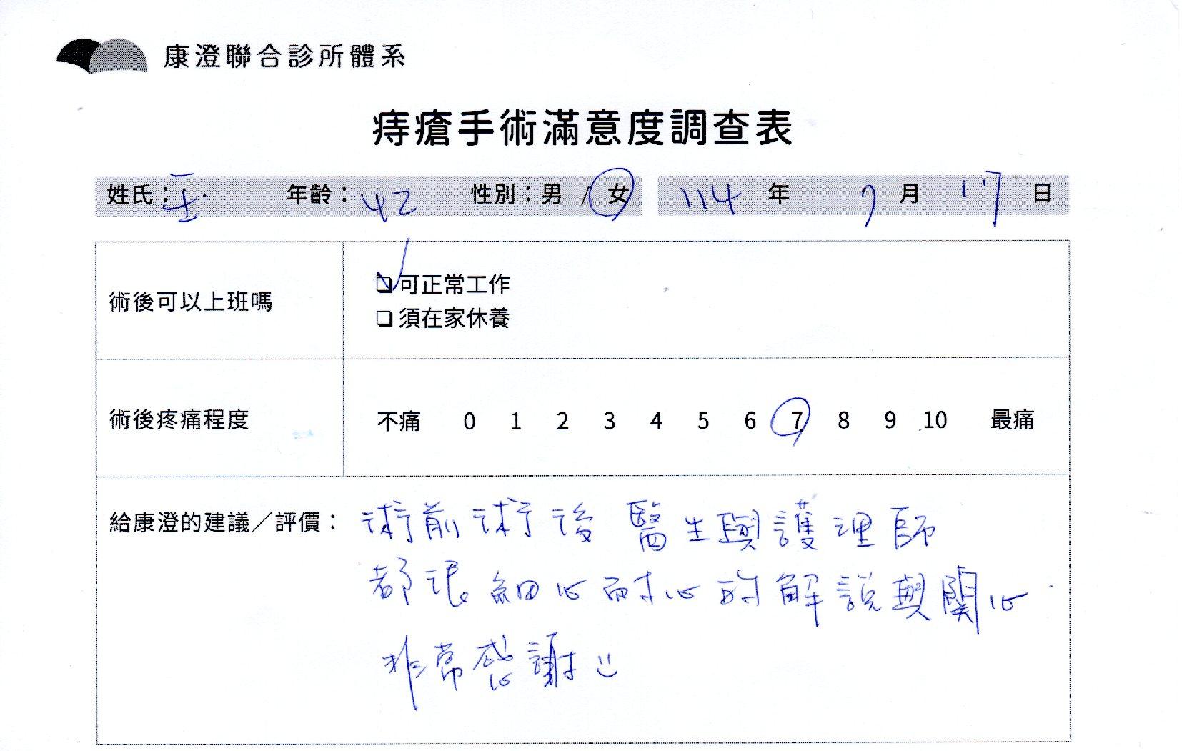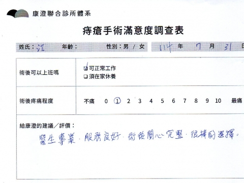 「困擾了20多年的三期內痔,終於在幾天內就解決了,原以為會很疼痛的手術及復原過程,結果真是神奇 啊!不會痛呢!長效針應該是有用的,前幾天主要是腫脹,感謝林醫師,以及術後時時電話關心的小護士們,很棒!」