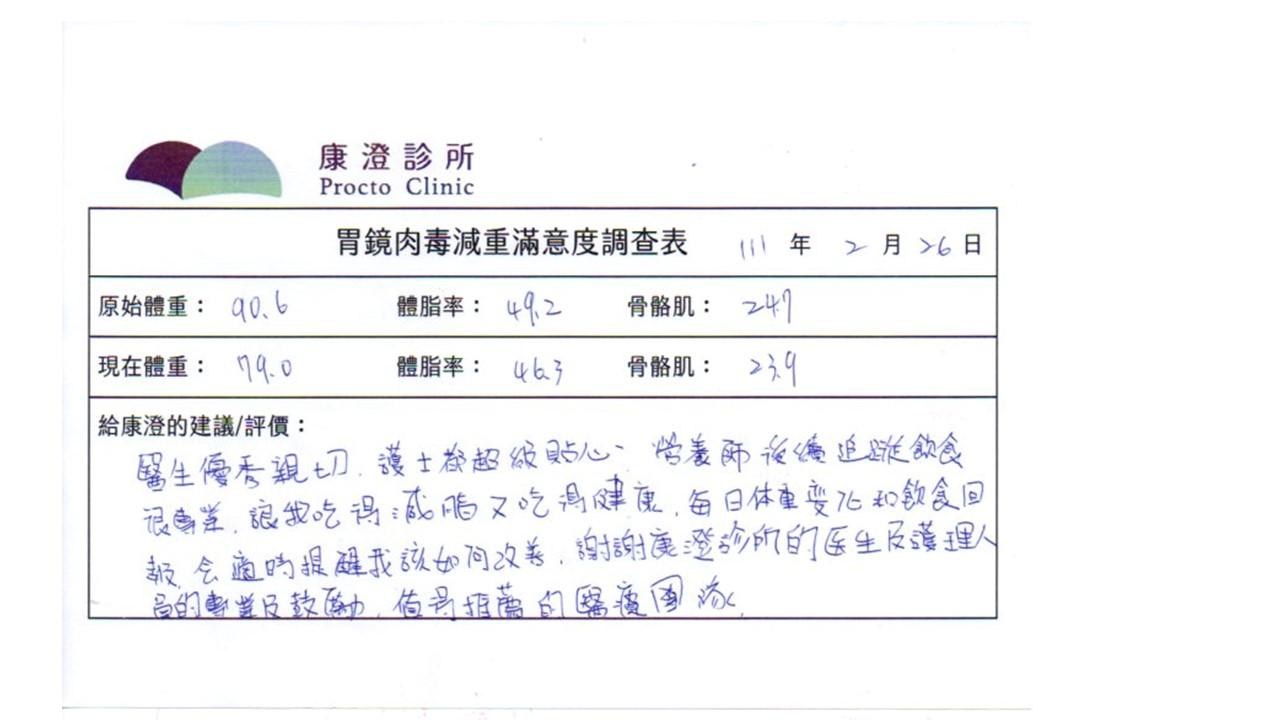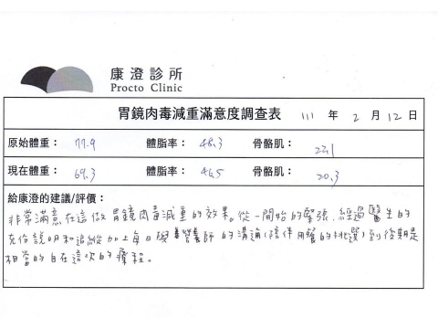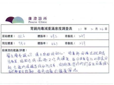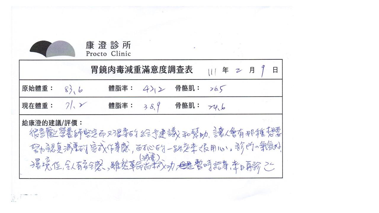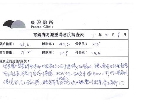 「很開心做了胃肉毒減重療程,讓我體會最幸福不挨餓的減肥方式!瘦了10%體重後,讓體態變美,最重要是身體變健康喔!感謝羅醫師及營養師的提醒及追蹤。」