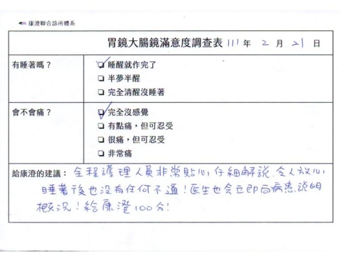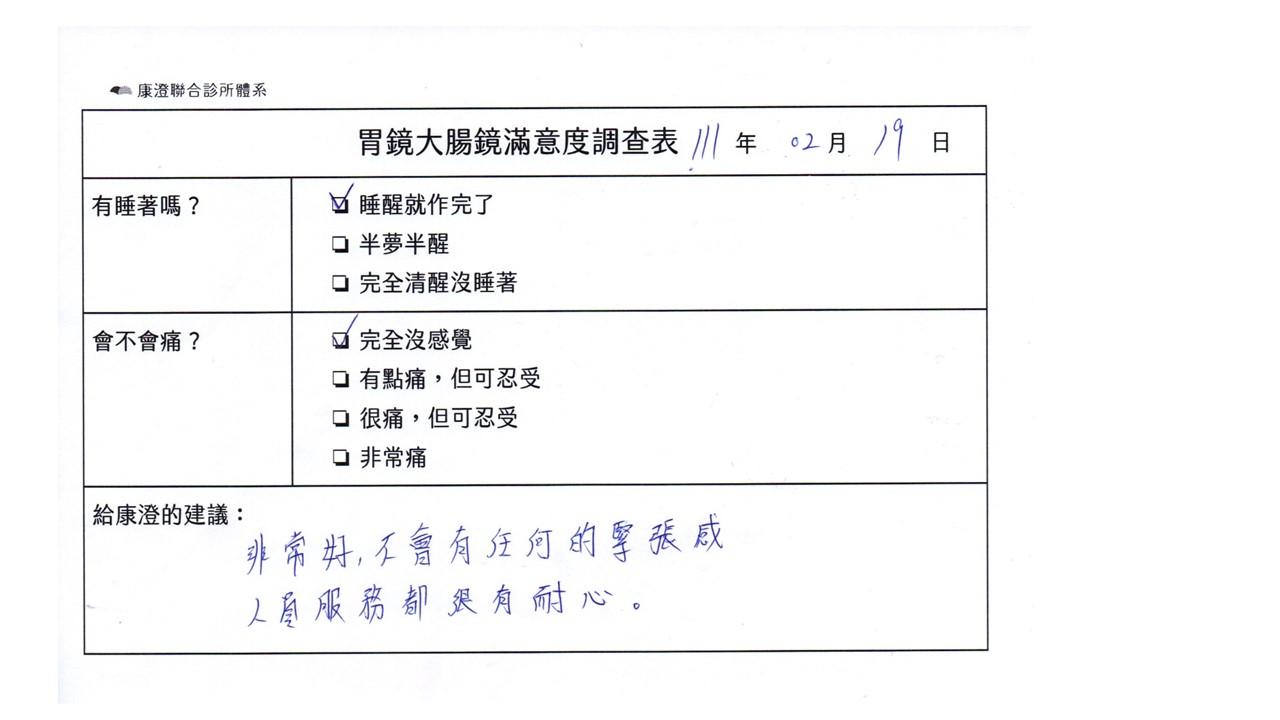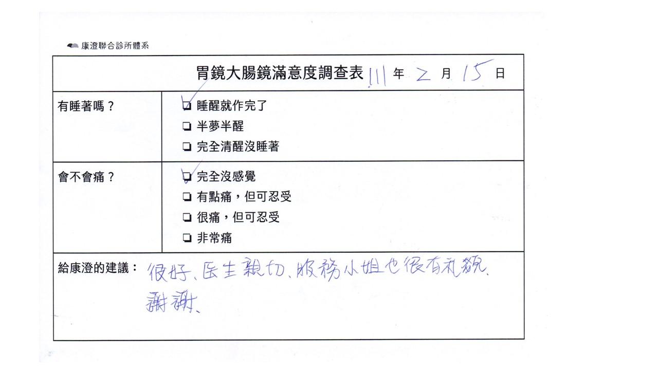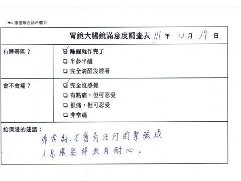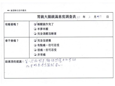 「定期穩定在櫃診所健檢,腸胃鏡的檢查醫療團隊及護理人員後續衛教的處理不輸醫院等級ㆍ專業丶舒適丶安心,整個療程無痛,護理人員親切可降低檢查的緊張感,非常感謝!」