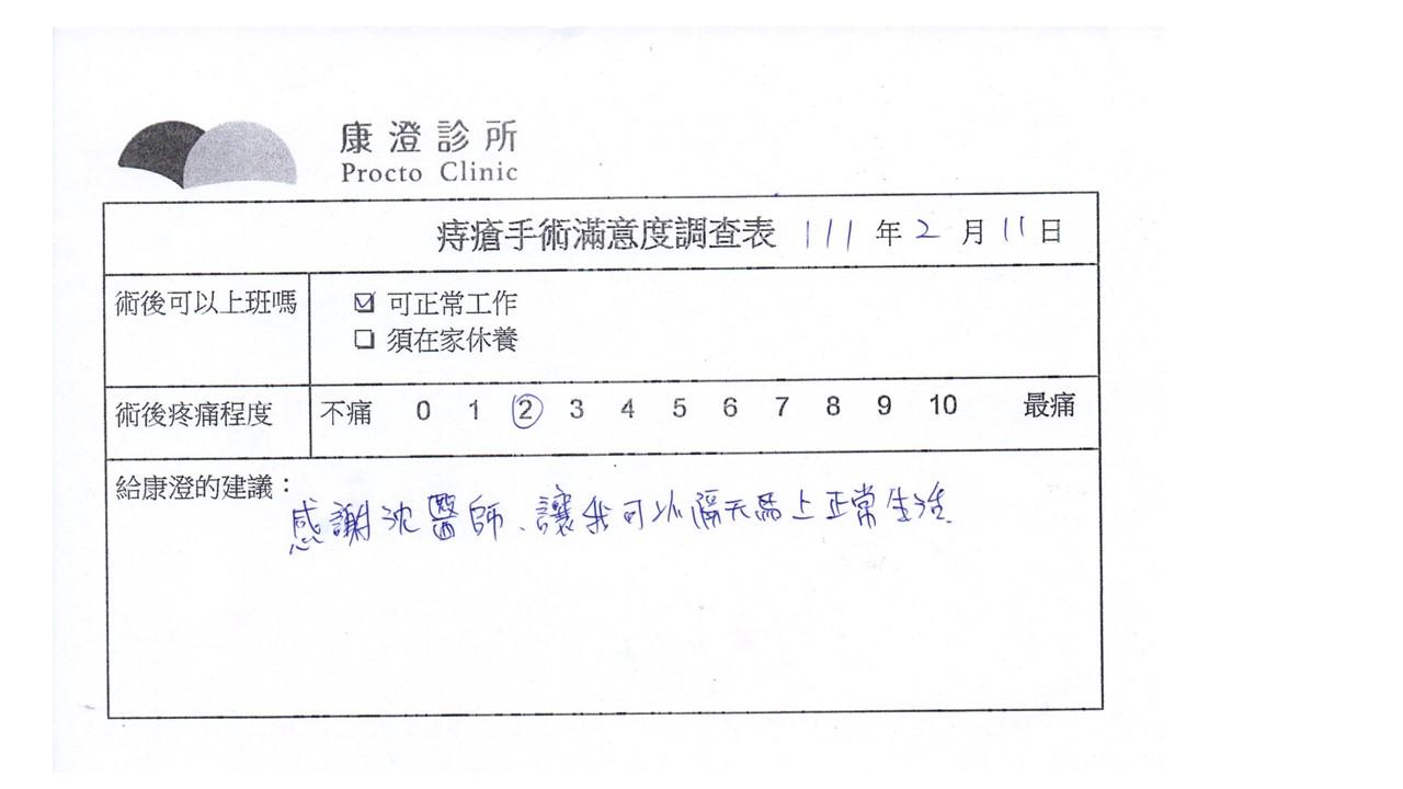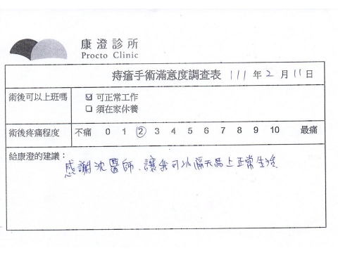 「困擾了20多年的三期內痔,終於在幾天內就解決了,原以為會很疼痛的手術及復原過程,結果真是神奇啊!不會痛呢!長效針應該是有用的,前幾天主要是腫脹,感謝林醫師,以及術後時時電話關心的小護士們,很棒!」