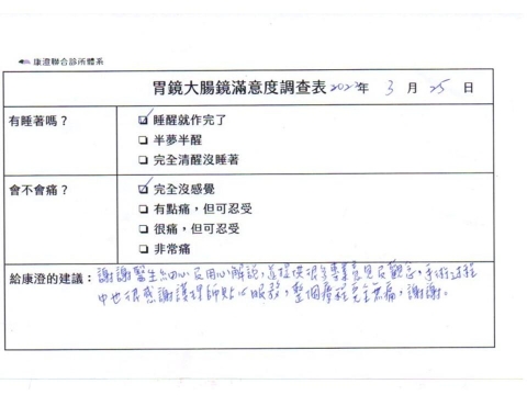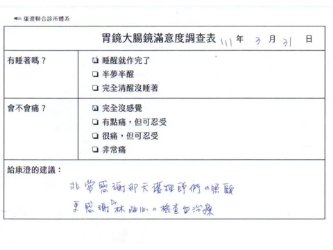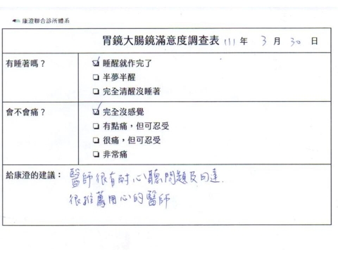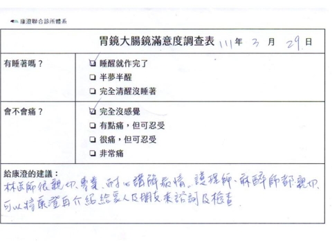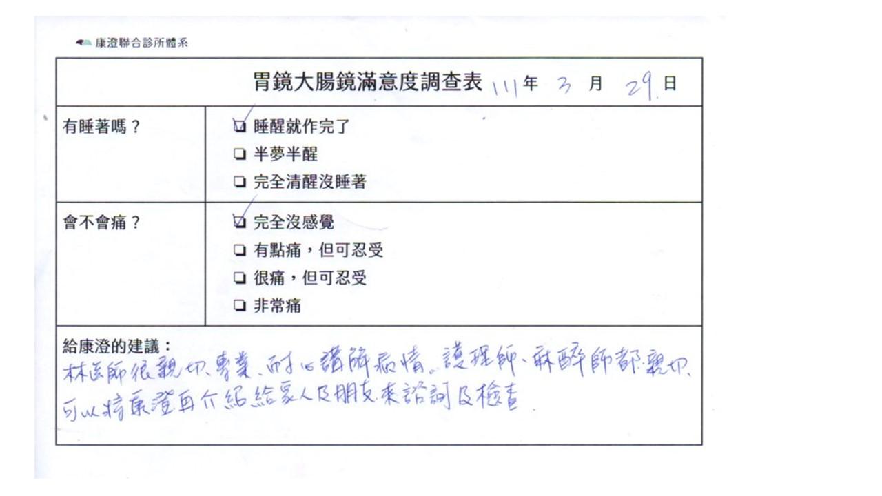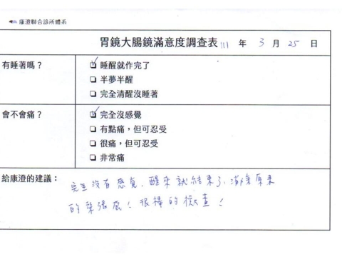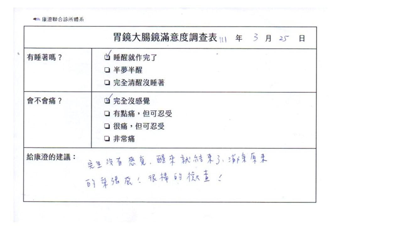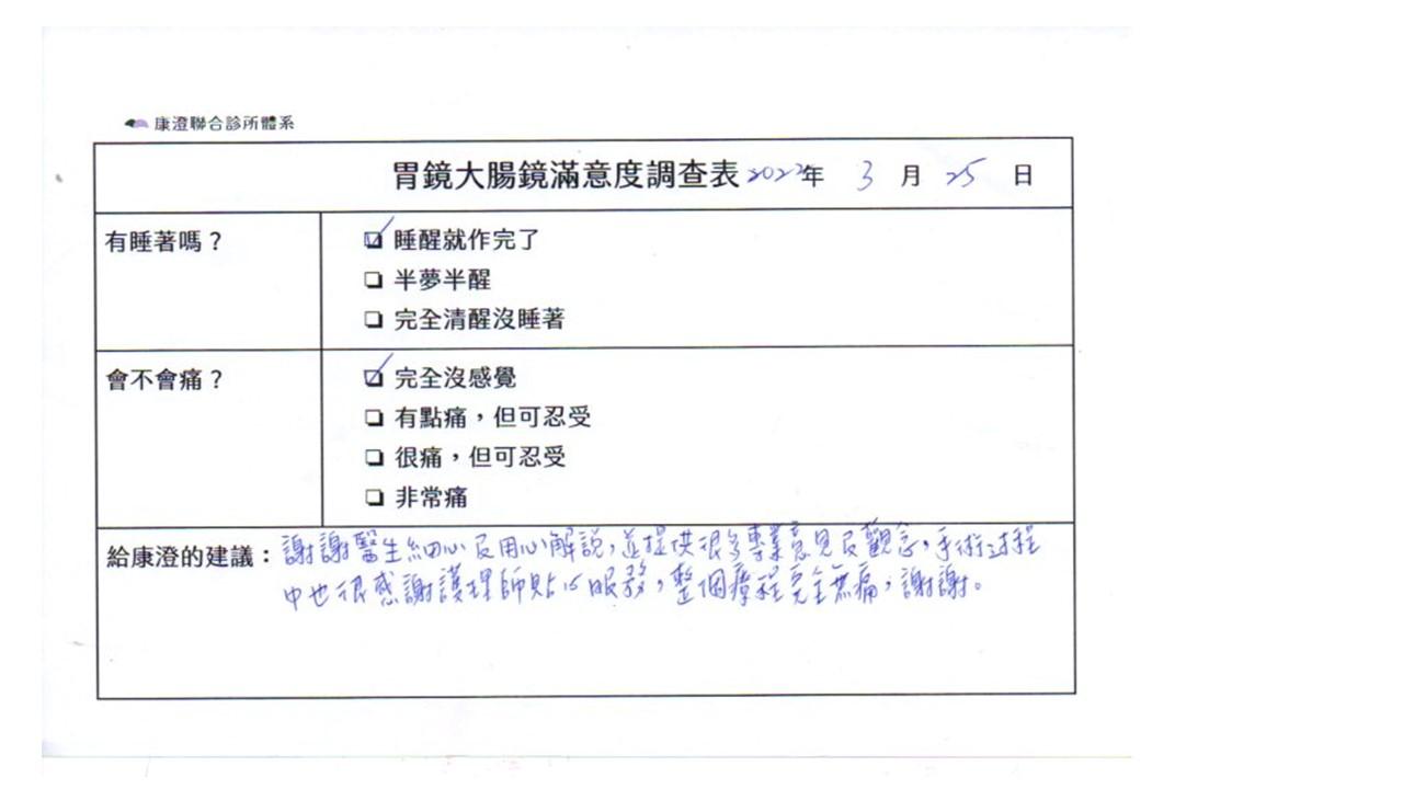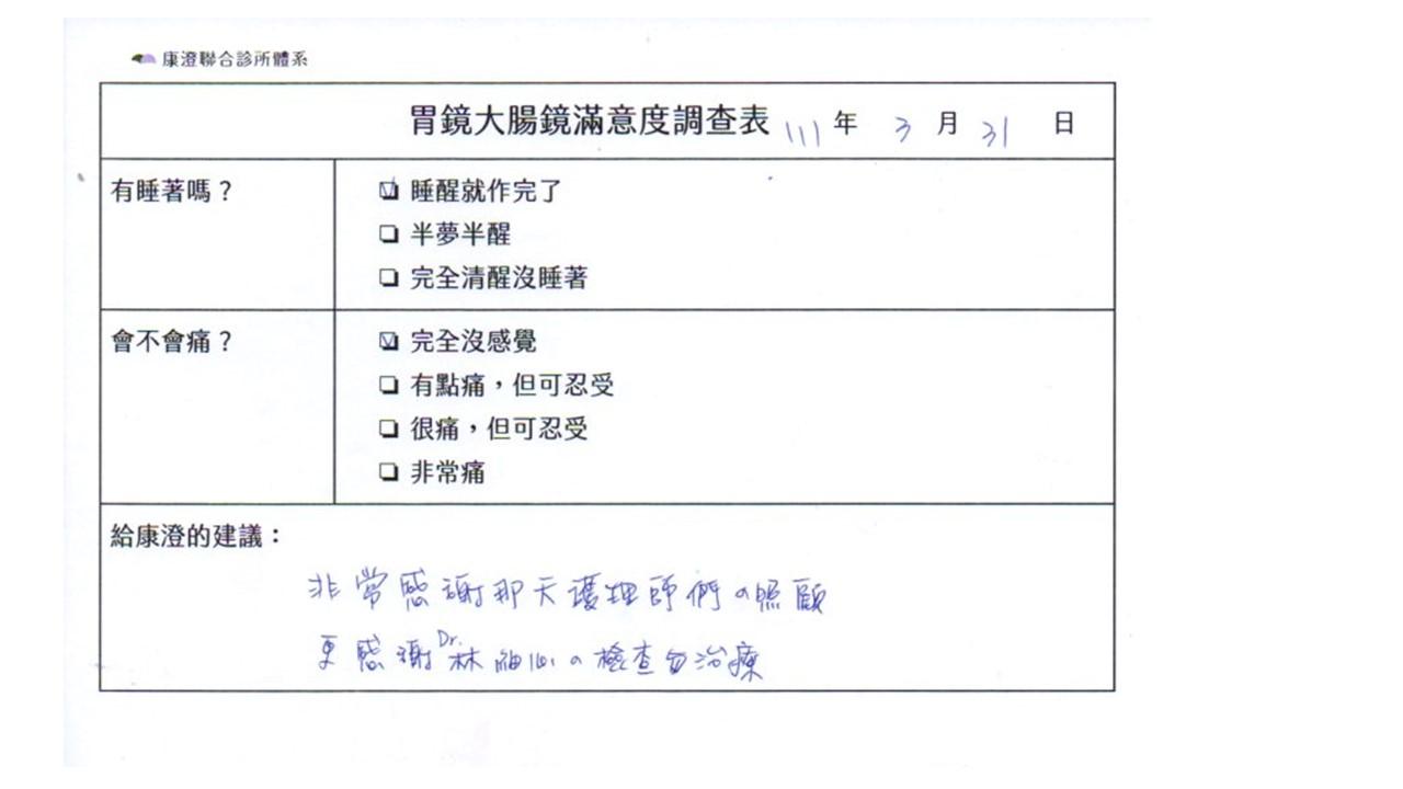 「定期穩定在櫃診所健檢,腸胃鏡的檢查醫療團隊及護理人員後續衛教的處理不輸醫院等級ㆍ專業丶舒適丶安心,整個療程無痛,護理人員親切可降低檢查的緊張感,非常感謝!」
