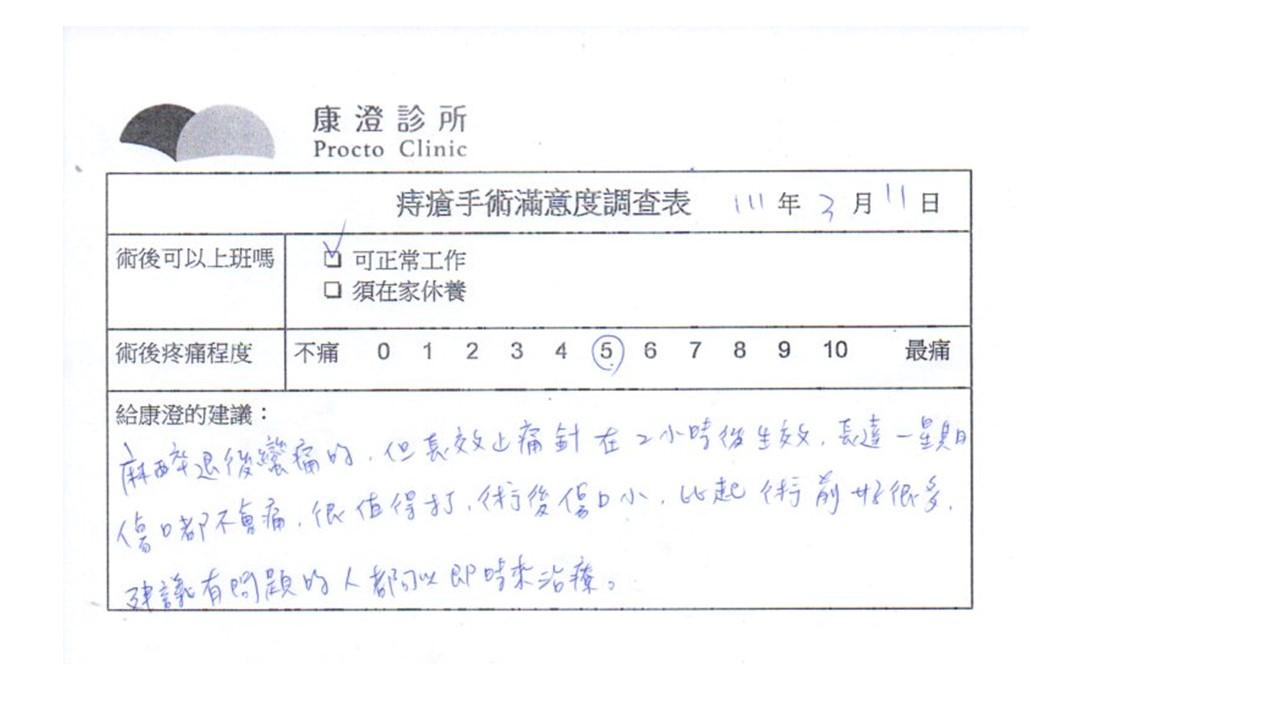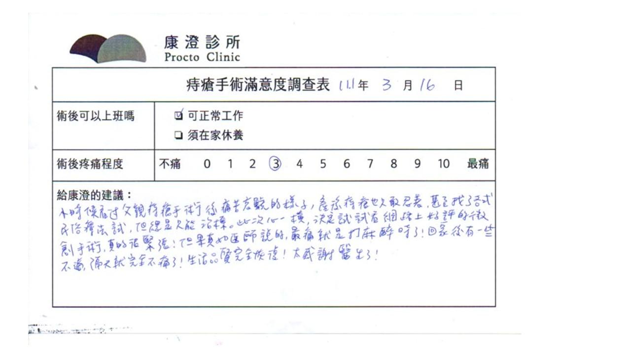 「困擾了20多年的三期內痔,終於在幾天內就解決了,原以為會很疼痛的手術及復原過程,結果真是神奇啊!不會痛呢!長效針應該是有用的,前幾天主要是腫脹,感謝林醫師,以及術後時時電話關心的小護士們,很棒!」