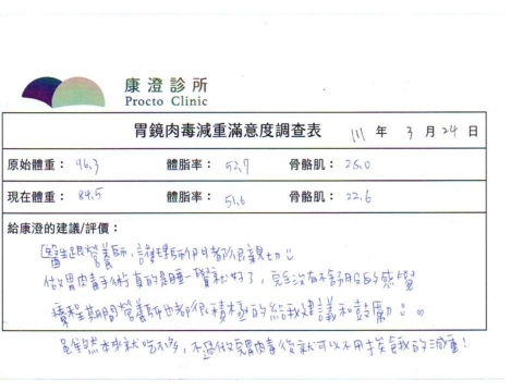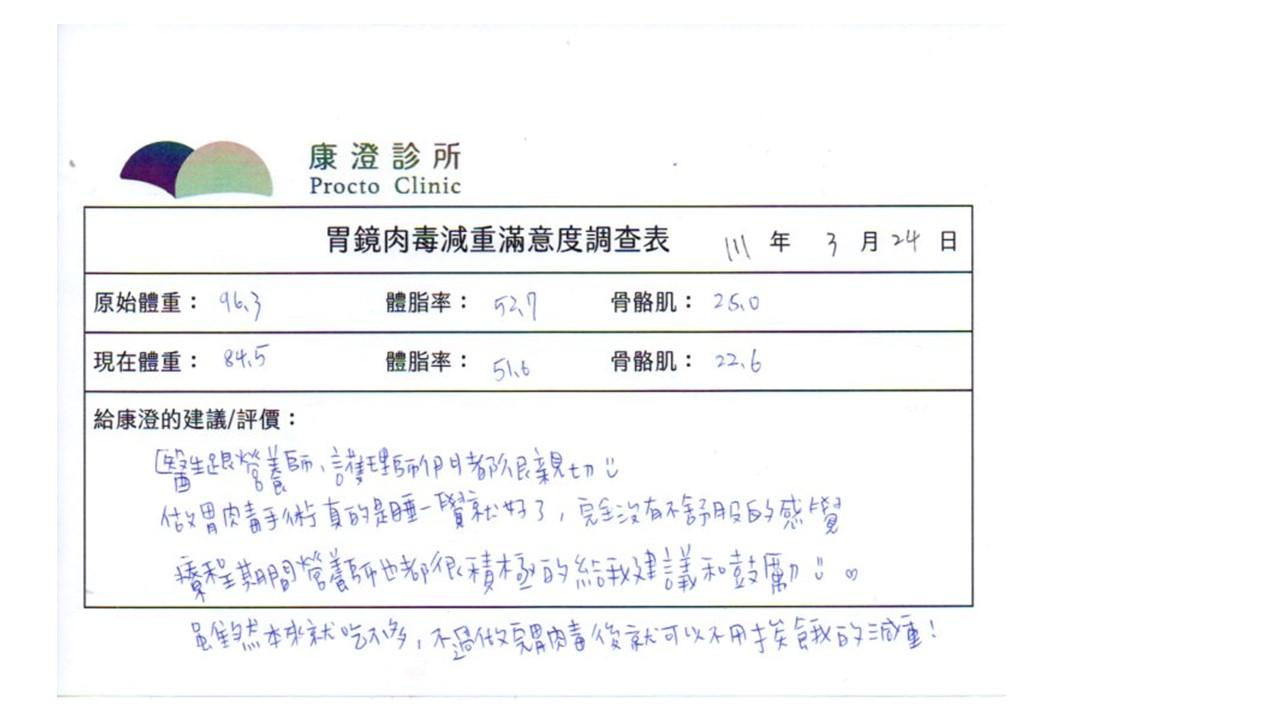「很開心做了胃肉毒減重療程,讓我體會最幸福不挨餓的減肥方式!瘦了10%體重後,讓體態變美,最重要是身體變健康喔!感謝羅醫師及營養師的提醒及追蹤。」