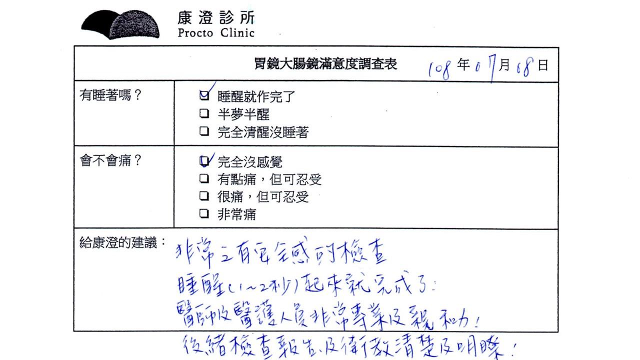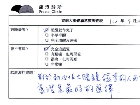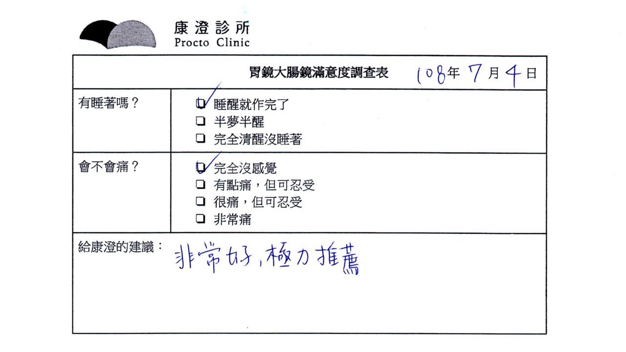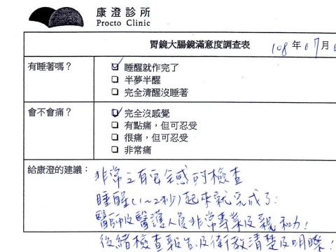 「定期穩定在櫃診所健檢,腸胃鏡的檢查醫療團隊及護理人員後續衛教的處理不輸醫院等級ㆍ專業丶舒適丶 安心,整個療程無痛,護理人員親切可降低檢查的緊張感,非常感謝!」